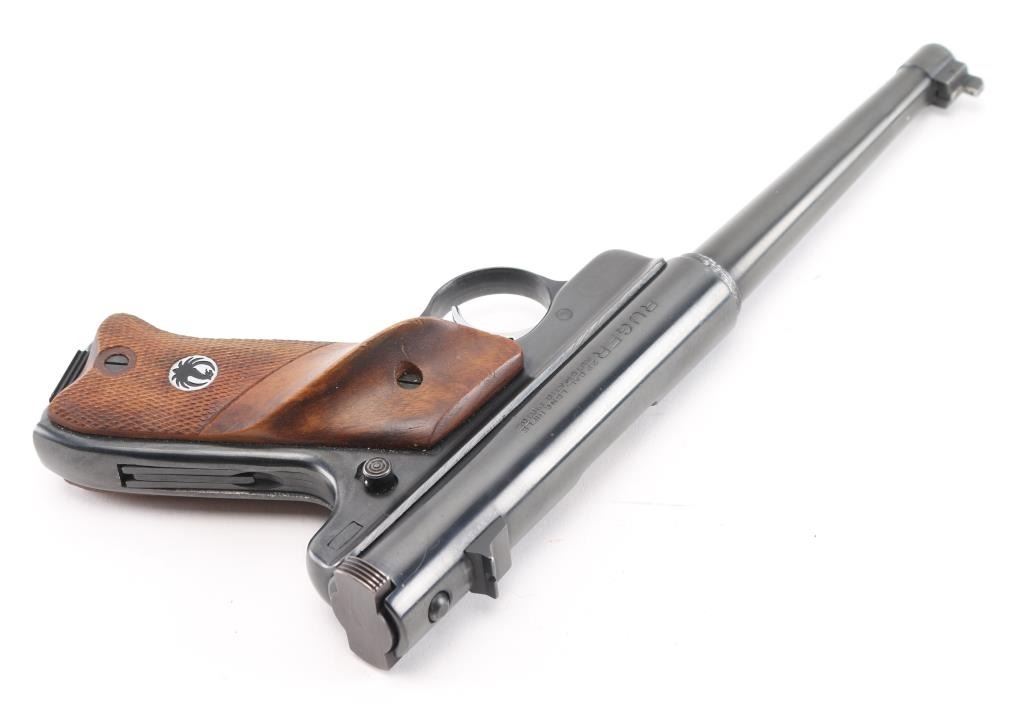 The "Black Eagle" Blowback operated semi-automatic target pistol chambered in .22 Long Rifle. Features a blue finish, 5 1/2" bull barrel, raised patridge front sight, dovetailed square-notch rear sight, serrated wide trigger, thumb safety on the left side of the frame, heel magazine release, 10 round factory magazine, and two-piece checkered wood target grips with thumb rest on the left panel & black eagle Ruger medallion on the right. Pistol exhibits light handling wear. Action is crisp, the bore is excellent and the wood grips are fine. Front sight has been altered. Condition is near NRA Very Good. C&R Firearm.