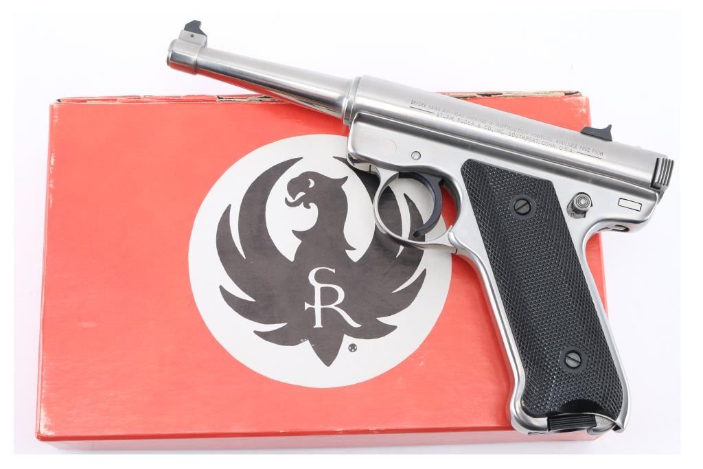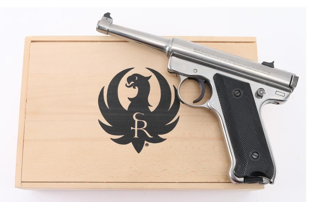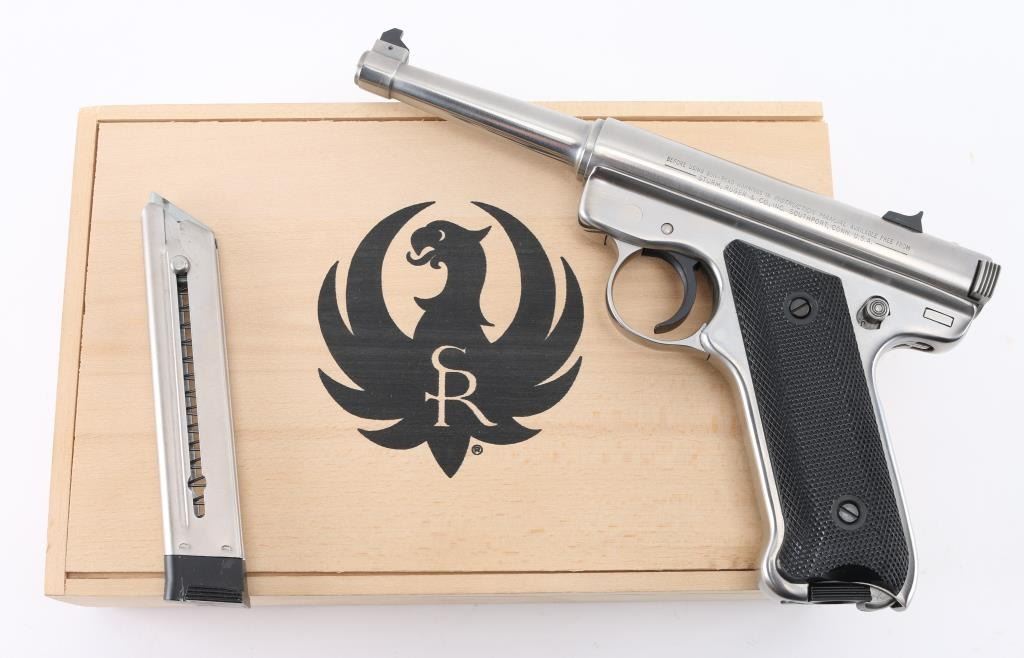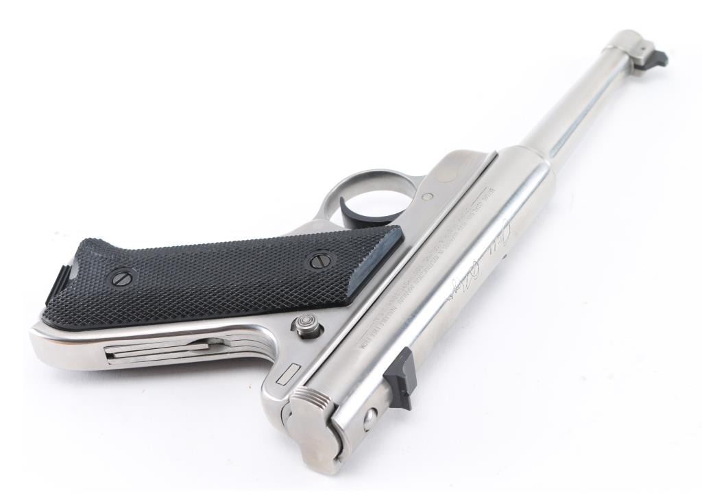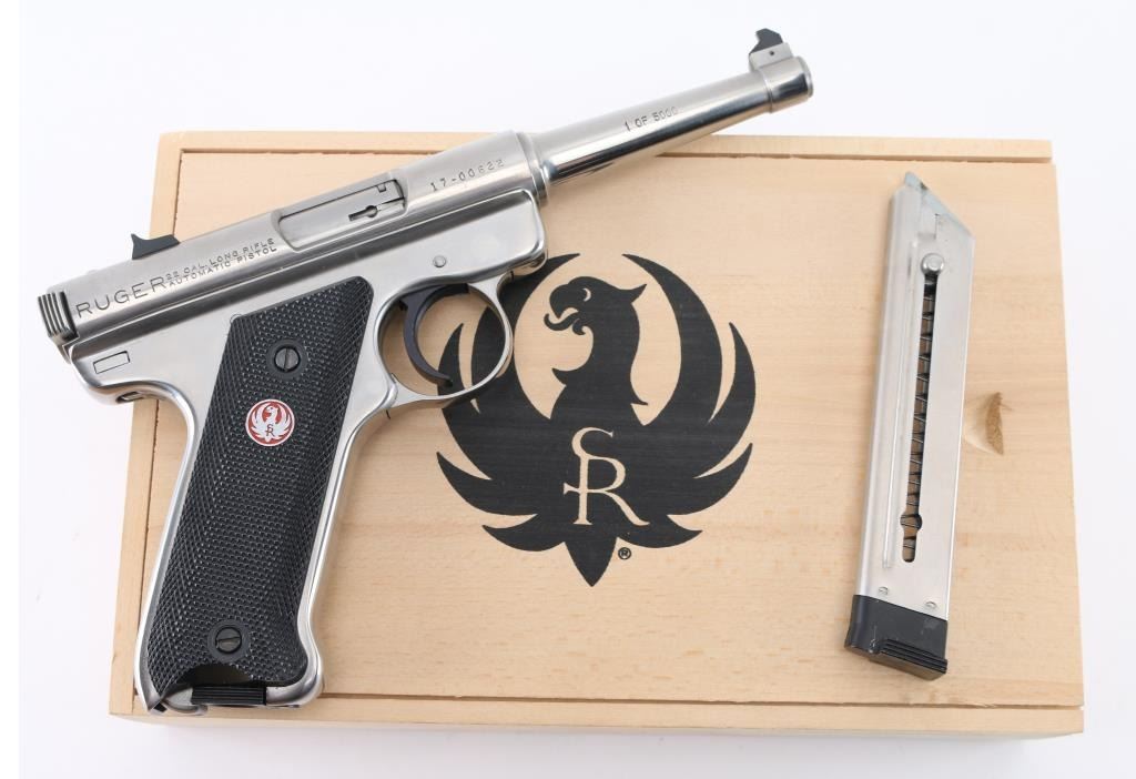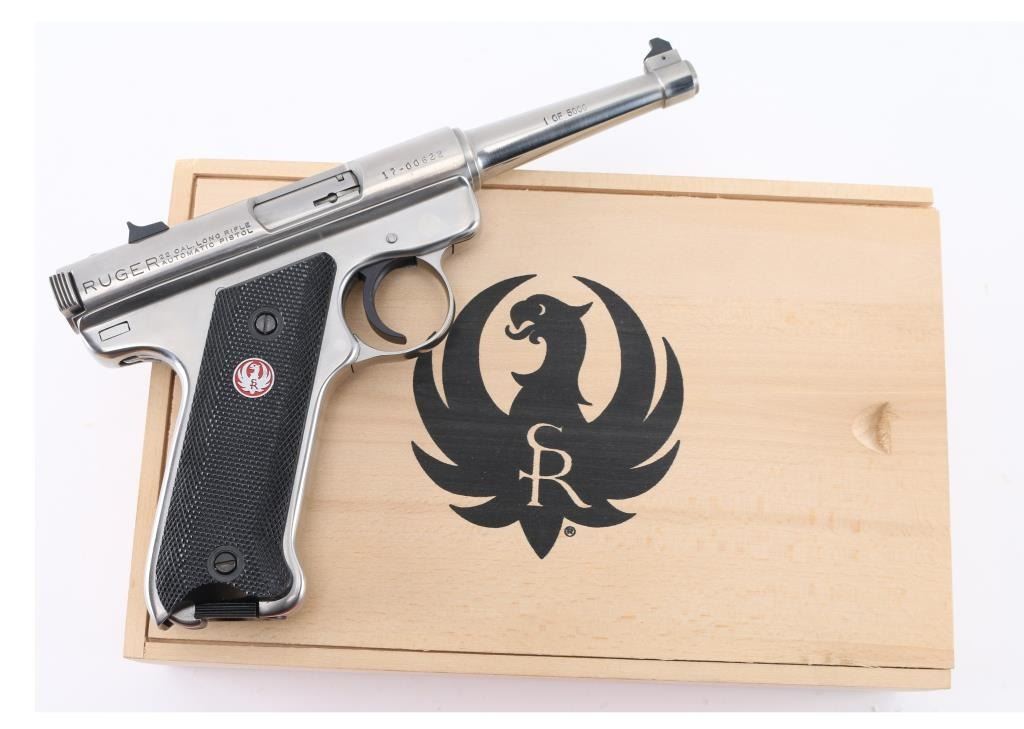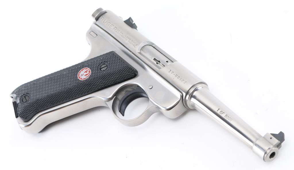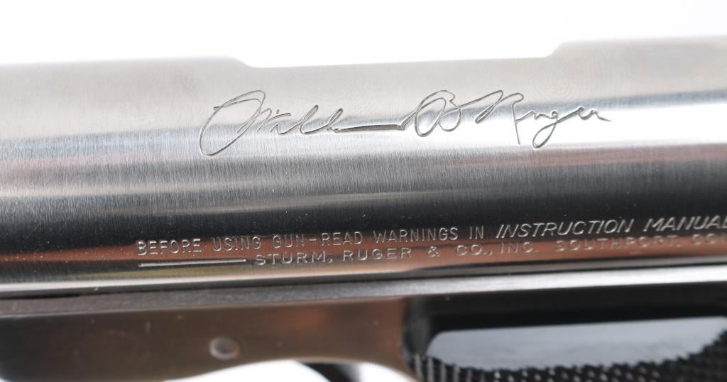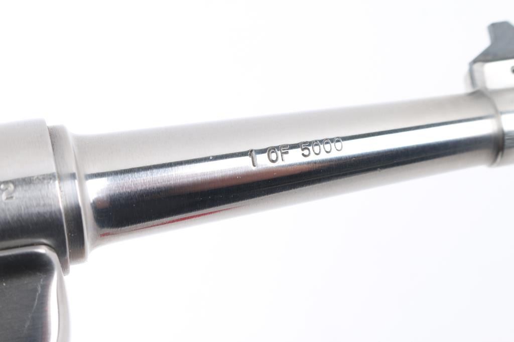 "1 of 5000" stamped on the right side of the barrel. Bill Rugers' signature is engraved on top of receiver. Semiautomatic rimfire pistol features stainless steel construction, blued accent trigger, 4.75" barrel, fixed sights, manual safety, heel magazine release, checkered black plastic grips with red & silver Ruger medallions. Condition is like new, few signs of handling, in factory box contained in a wood box with sliding lid. Includes a manual, and extra magazine. Condition is NRA Excellent - Like New. Modern Firearm.