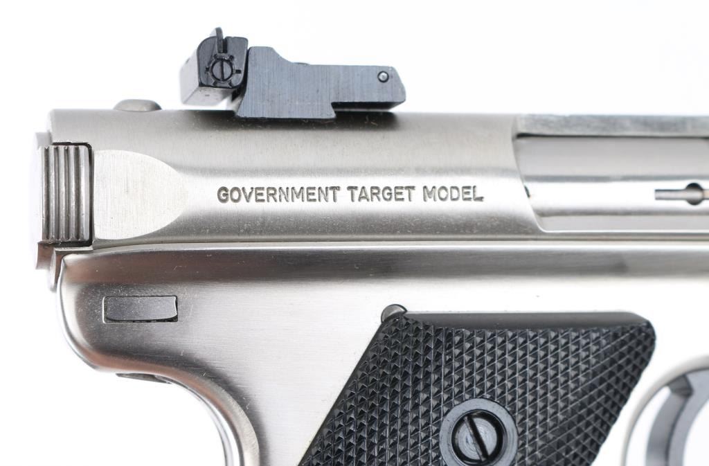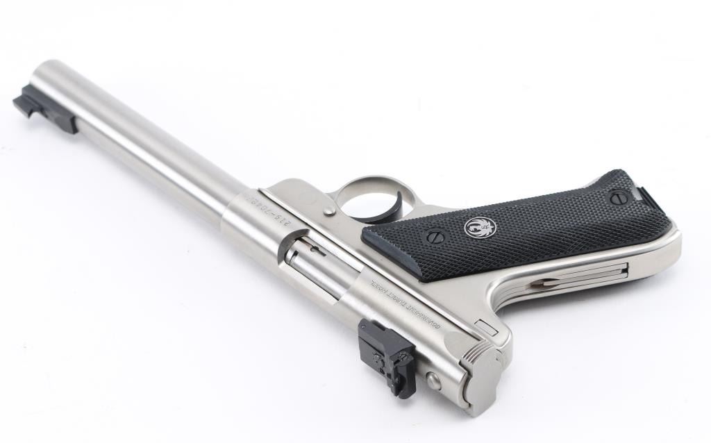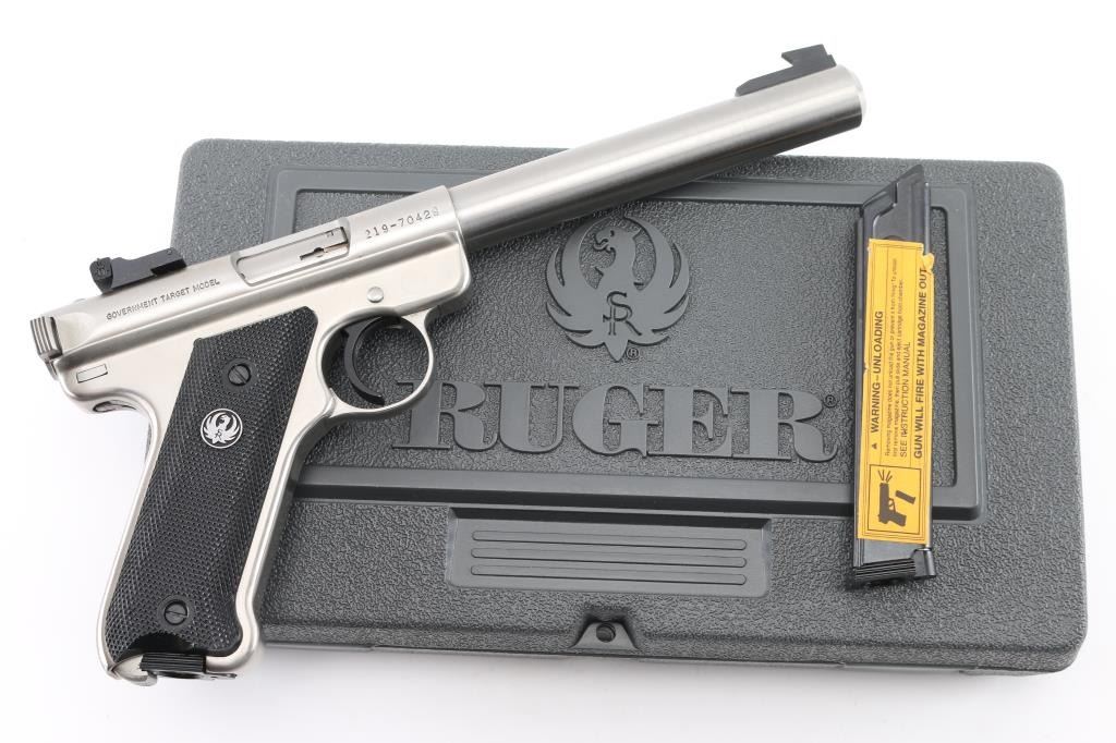 "Government Target Model' Semiautomatic rimfire pistol features stainless steel construction, blued accent serrated trigger, 7" round bull barrel, adjustable sights, manual safety, heel magazine release, checkered black plastic grips with black & silver Ruger medallions. Condition is like new, few signs of handling, bore is excellent/bright. in factory gray plastic box with cardboard outer sleeve, with manual & one magazine. Condition is NRA Excellent - Like New