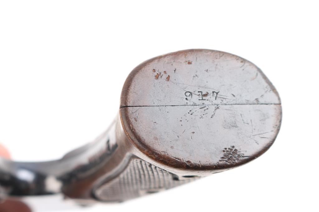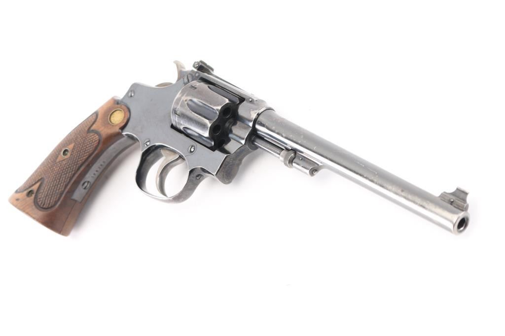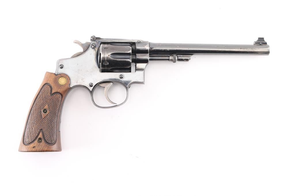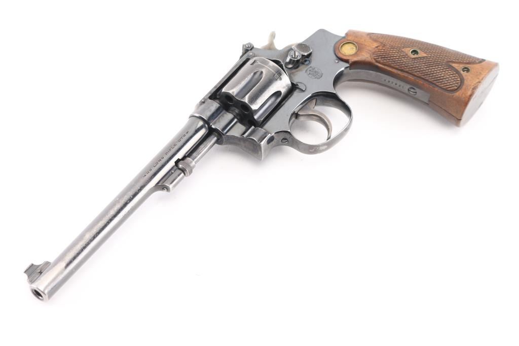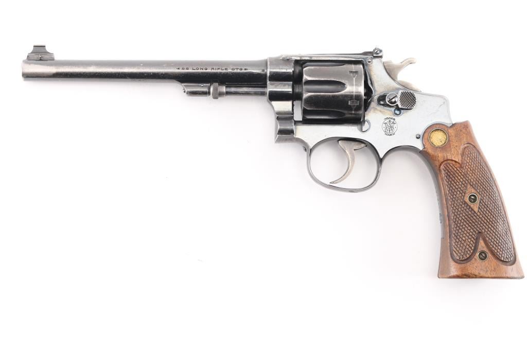 SN: 139153 '.22/.32 Heavy Frame Target' Vintage small frame double action revolver chambered in .22 Long Rifle, manufactured in Springfield, MA circa 1911-1915. Referred to as the "Bekeart Model" for the San Francisco dealer Philip Bekeart who originally contracted S&W to manufacture this model. This revolver is considered a “True Bekeart” as it was part of the First Bekeart-Pattern Production Run (#138226-139275) and has a special serial number (917) on the butt of the grip. Features a lustrous blued finish, pinned 6" round tapered barrel, pinned blade front sight with bead top, fully-adjustable rear sight, fluted six-shot swing-out cylinder, smooth .240" case hardened trigger, case hardened .240" hammer with knurled spur, five screw round butt I frame and two-piece diamond checkered walnut 'extension' grips with brass S&W medallions. Matching serial numbers are observed on the frame, barrel, cylinder and extractor star. Revolver exhibits approximately 70% of its original blued finish showing high point edge wear, scattered handling marks/losses and drag wear on the cylinder. Action is smooth with good lock-up, the bore is very good, the markings are crisp and the walnut grips are good with wear & minor blemishes. Condition is NRA Good. ***Modern Firearm*** ***C&R Eligible***