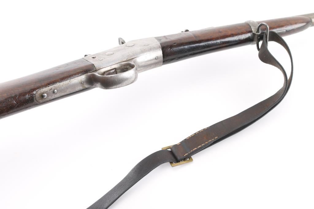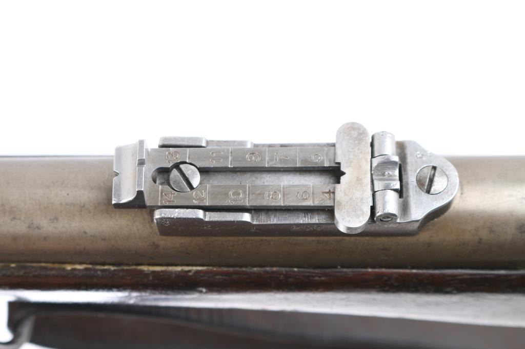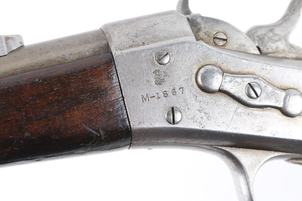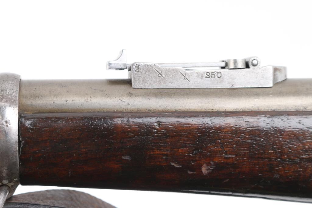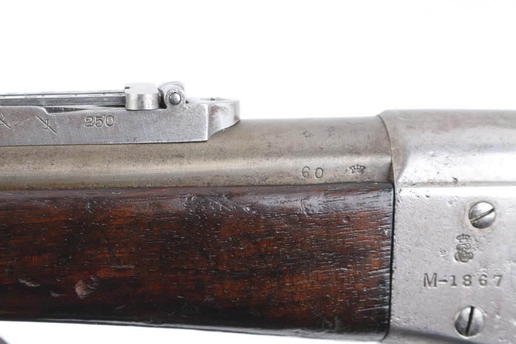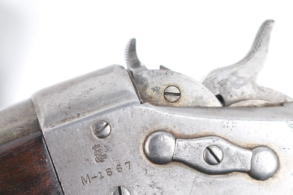 SN: 60. This is the very rare Danish M-1867 rolling block Engineer carbine. Features 21" barrel, blade front sight, tangent rear sight with folding elevation ladder, black leather sling attached. brass disc in right butt stock. Left receiver marked "M-1867" under Royal Cypher & crown. Crown proofs The breech block contains the dual firing pin for either rimfire of center fire cartridges. Bore is very good condition. Metal surfaces are in the white with traces of blue on the barrel scattered pitting on the receiver. Wood is sound with the usual scratches/dings, there is a gouge on the bottom lefty butt stock. Markings are sharp. Action is crisp/tight. The upper comb has the aluminum 10-rd cartridge holder installed into the stock, it has a push button release. Flat Aluminum butt plate. Serial number 60 makes this one of the very early carbines of the series. Comes with a rare original sling in very good condition. Condition is NRA Very Good. Antique Firearm.