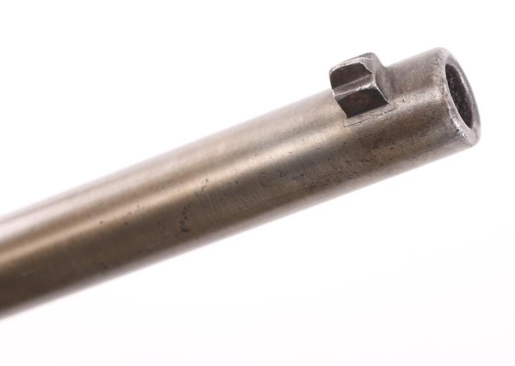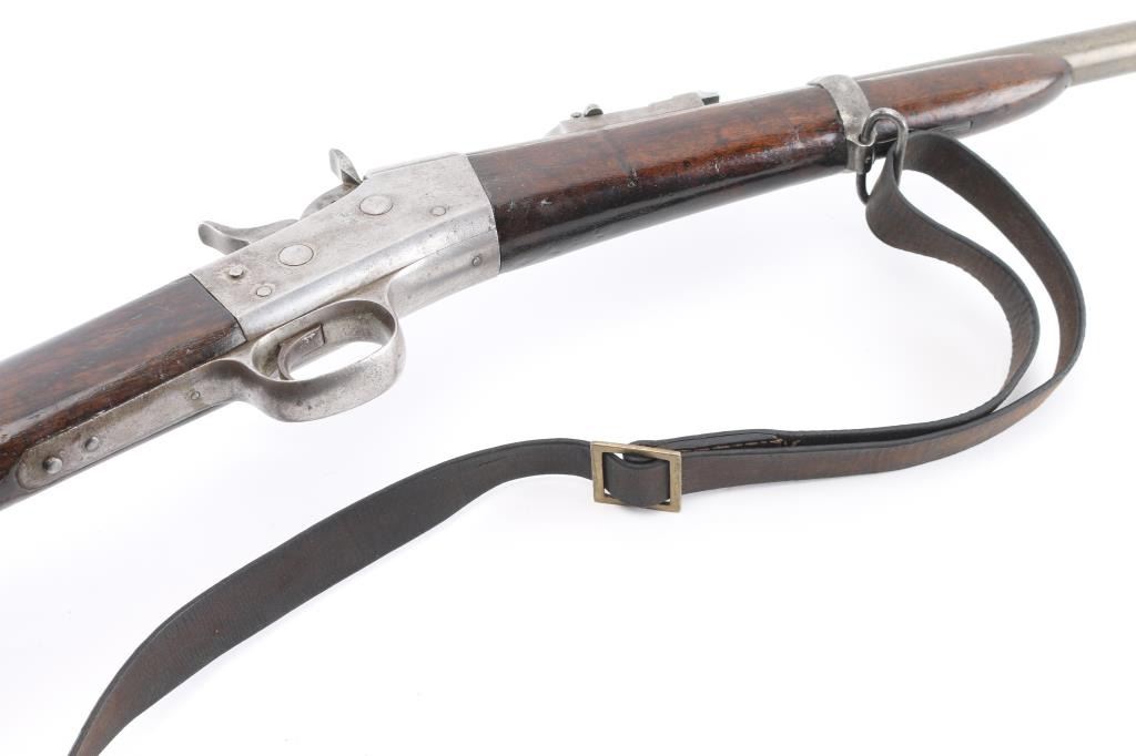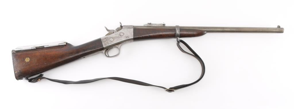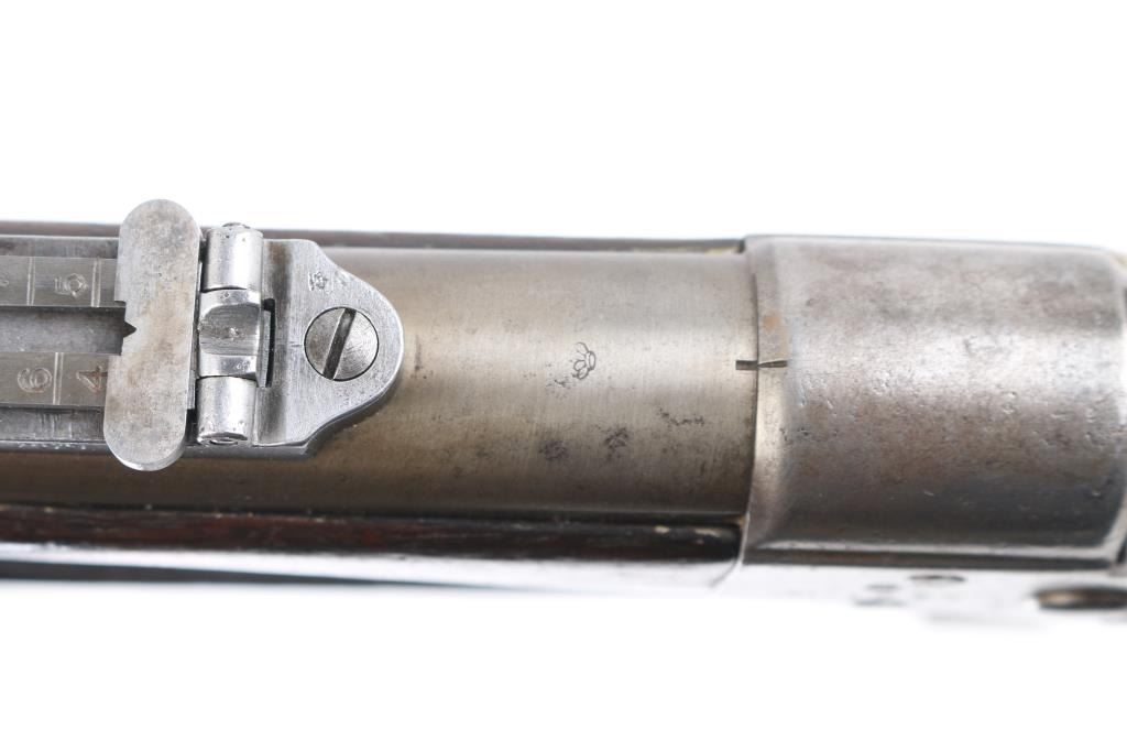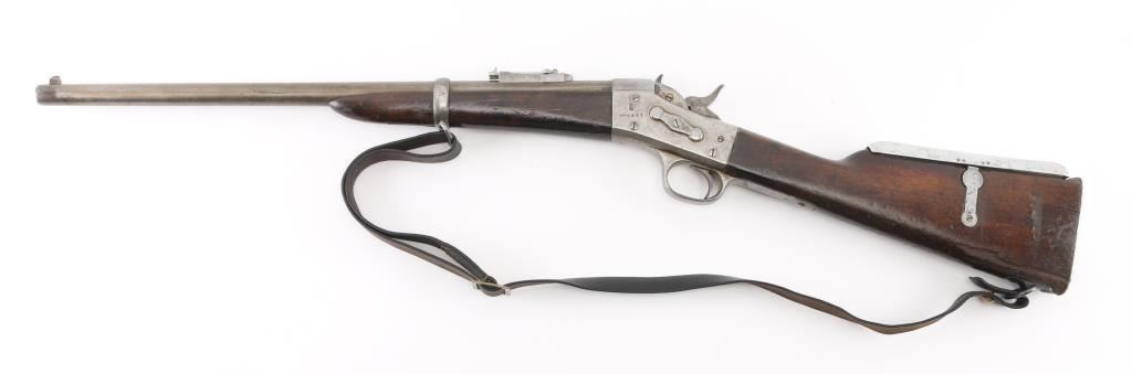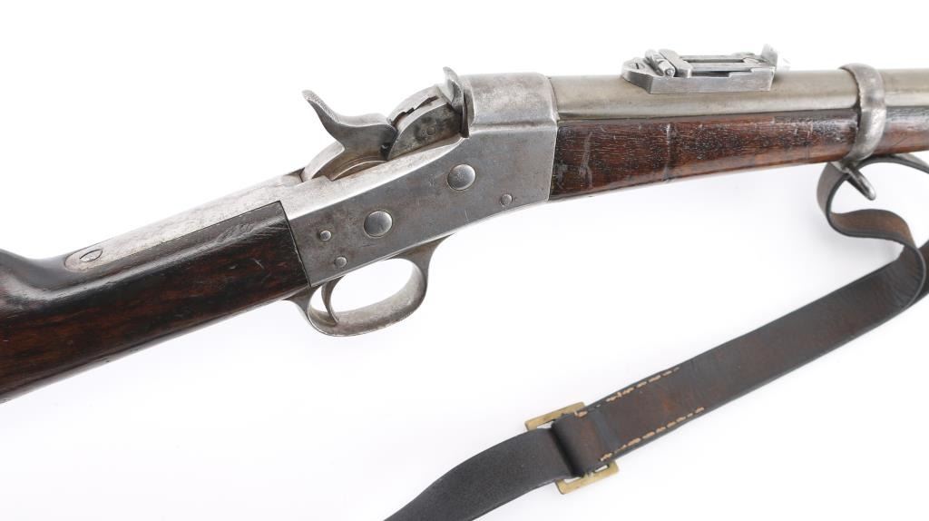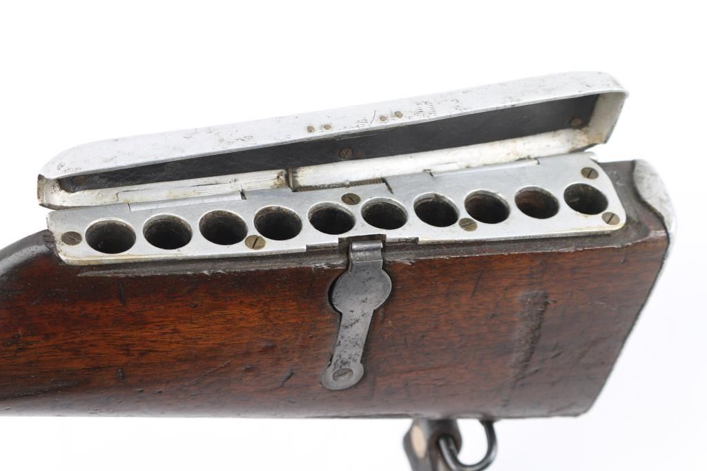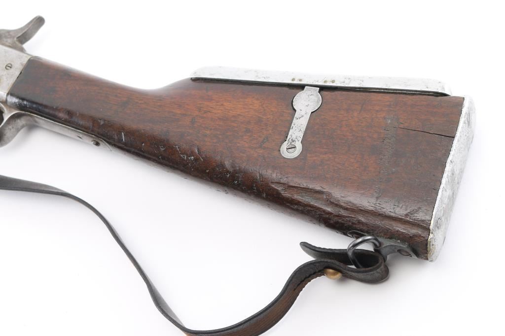 SN: 60. This is the very rare Danish M-1867 rolling block Engineer carbine. Features 21" barrel, blade front sight, tangent rear sight with folding elevation ladder, black leather sling attached. brass disc in right butt stock. Left receiver marked "M-1867" under Royal Cypher & crown. Crown proofs The breech block contains the dual firing pin for either rimfire of center fire cartridges. Bore is very good condition. Metal surfaces are in the white with traces of blue on the barrel scattered pitting on the receiver. Wood is sound with the usual scratches/dings, there is a gouge on the bottom lefty butt stock. Markings are sharp. Action is crisp/tight. The upper comb has the aluminum 10-rd cartridge holder installed into the stock, it has a push button release. Flat Aluminum butt plate. Serial number 60 makes this one of the very early carbines of the series. Comes with a rare original sling in very good condition. Condition is NRA Very Good. Antique Firearm.