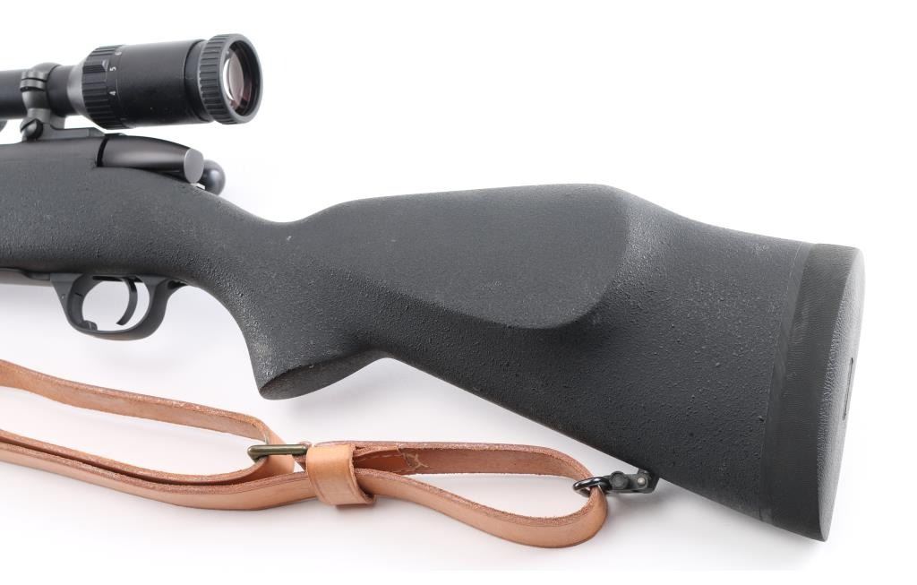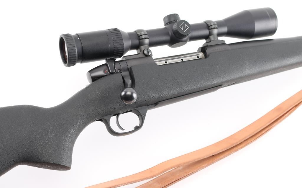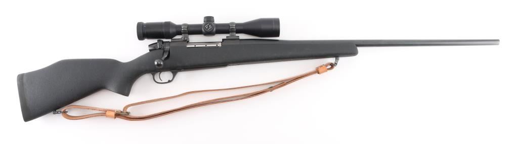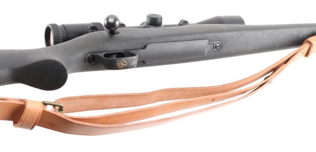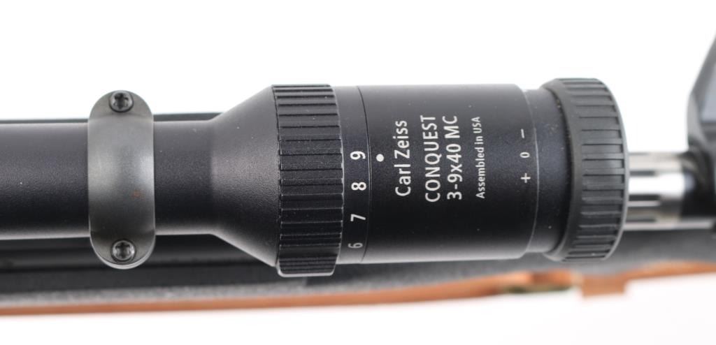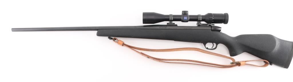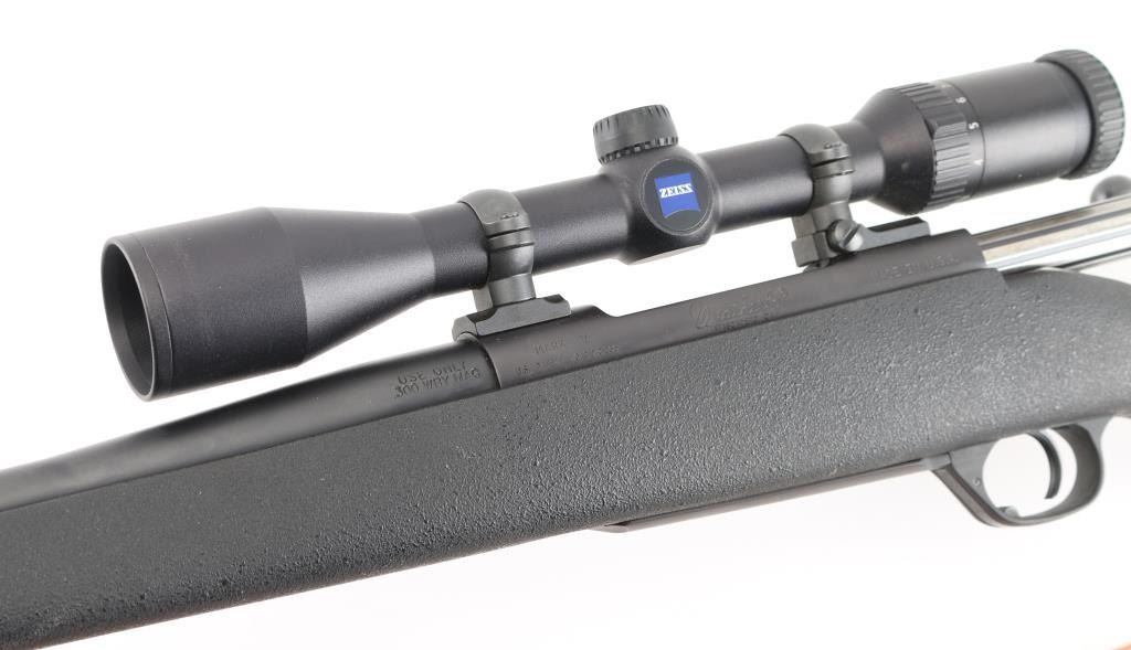 American made bolt action rifle chambered for .300 WBY MAG ammunition. It features a very nice matte black finish on the barrel and receiver. The barrel is 26" with no provisions for iron sights but sports a Zeiss Conquest 3-9x40 scope with rings and bases. It has a black synthetic stock with pebbled finish and a 1" recoil pad. It sports a grooved, beveled trigger, fluted bolt and comes with a brown leather sling. Rifle retains nearly all of its original finish showing very little wear. Stock is great. Bore looks new. LOP is 13.5". Condition is near NRA Perfect. *Modern Firearm*
