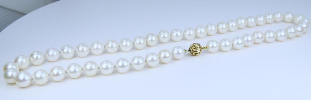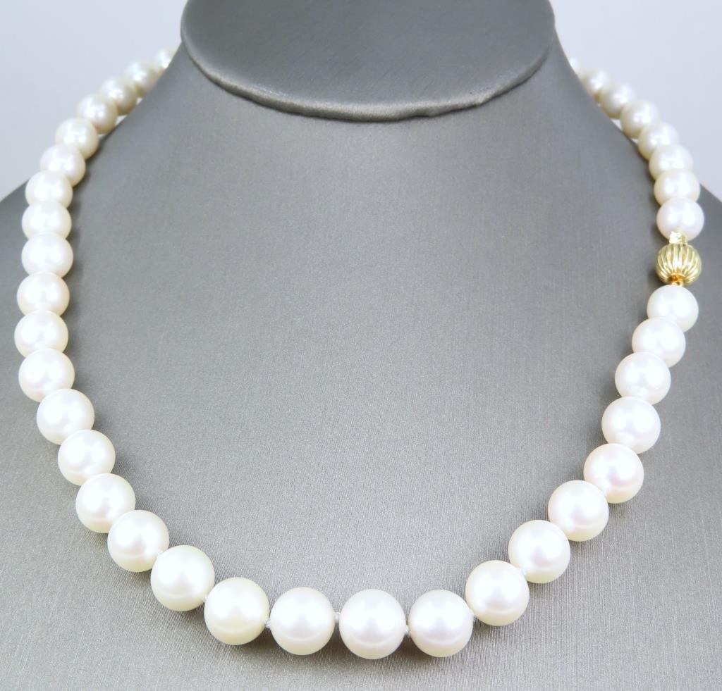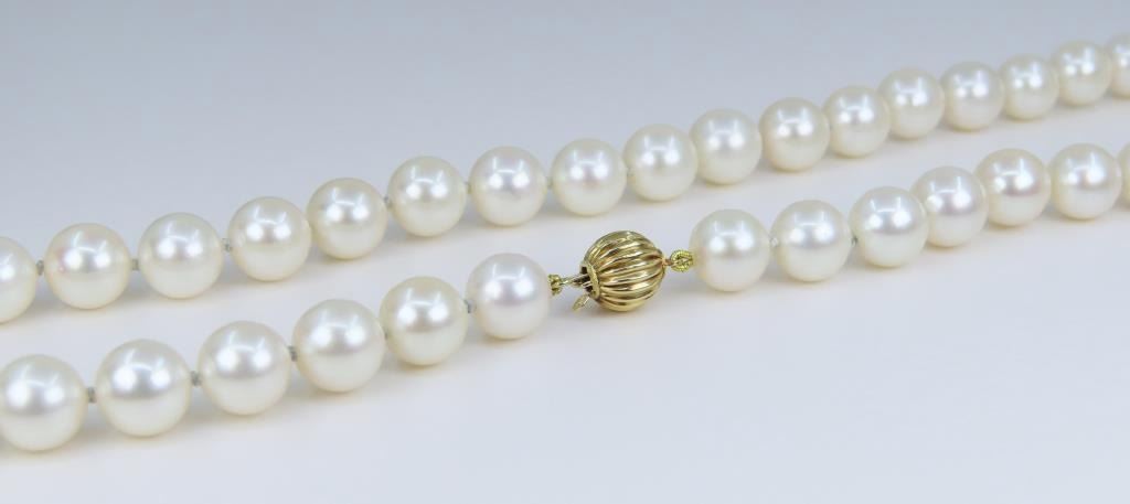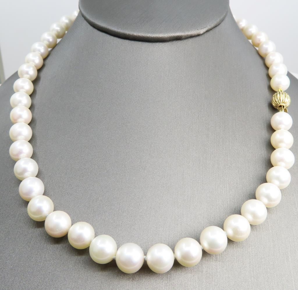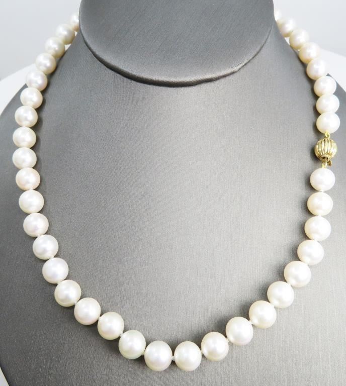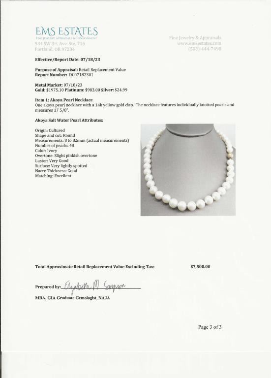 averaging 8.50 MM in diameter, excellent matching Pearls with Very Fine luster, Ivory color with soft pink overtones, accented with a 14 karat yellow gold ball style clasp. Retail Appraisal at $7,500.00