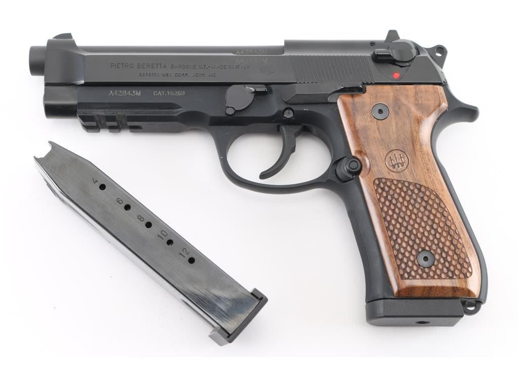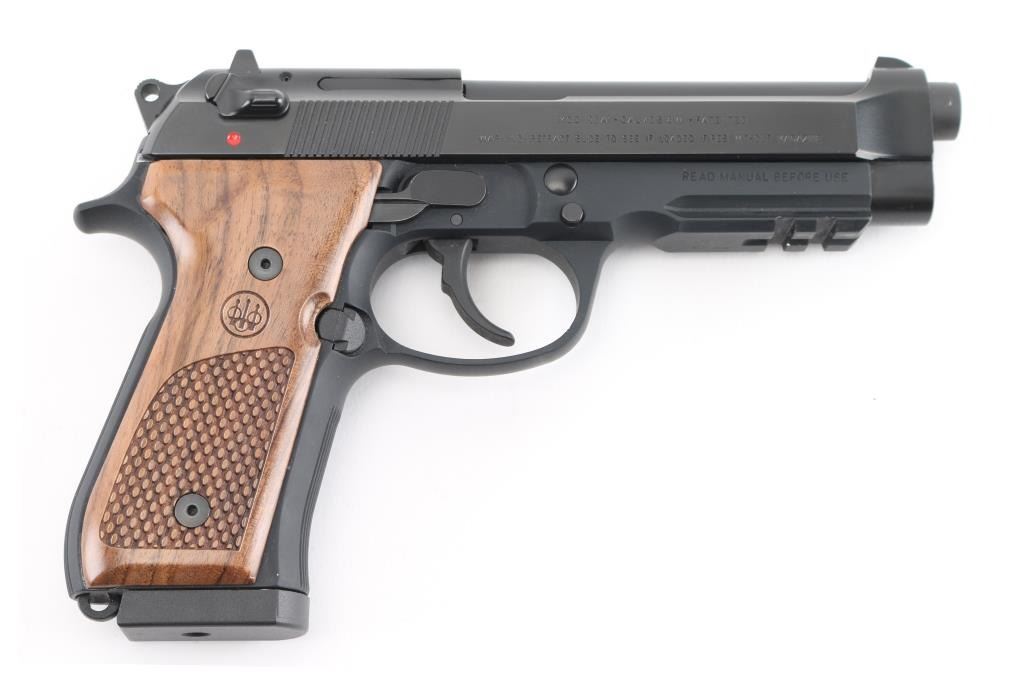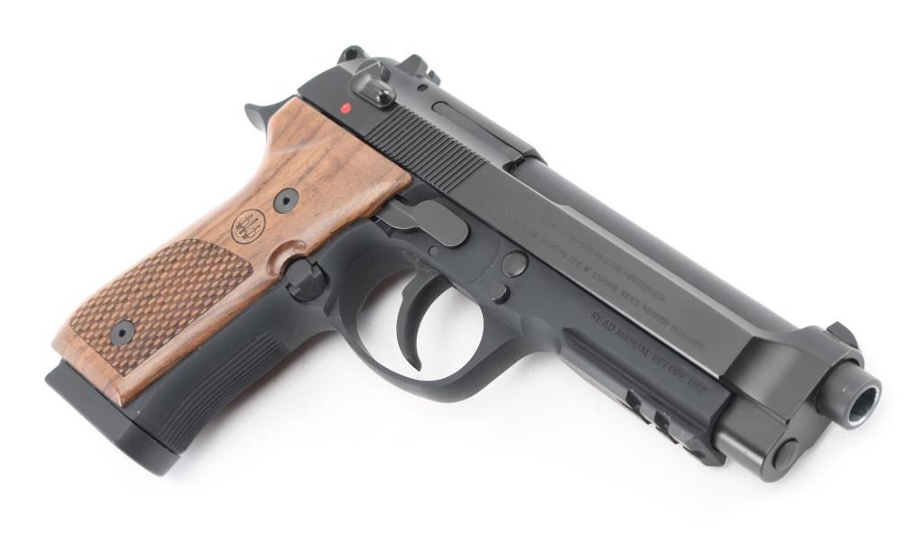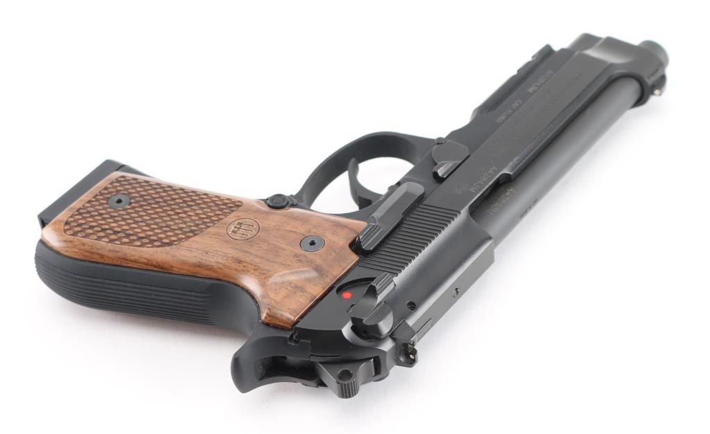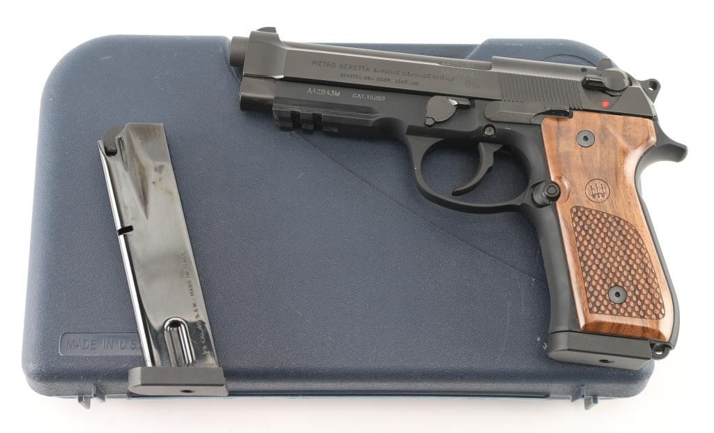 Made in Italy this is a semi-auto pistol chambered for .40 S&W ammunition. It has a black finish, on the steel slide and a matte black finish on the alloy frame. It has dovetailed three dot sights, accessory rail on the frame, ambidextrous thumb safety, smooth trigger and serrated hammer spur. Wood grips are semi textured panels with embossed logo. Comes with original factory hard case, and two magazines. Pistol retains approx 98% finish overall showing very little wear. Grips look good. Bore looks good. Condition is NRA Excellent *Modern Firearm*