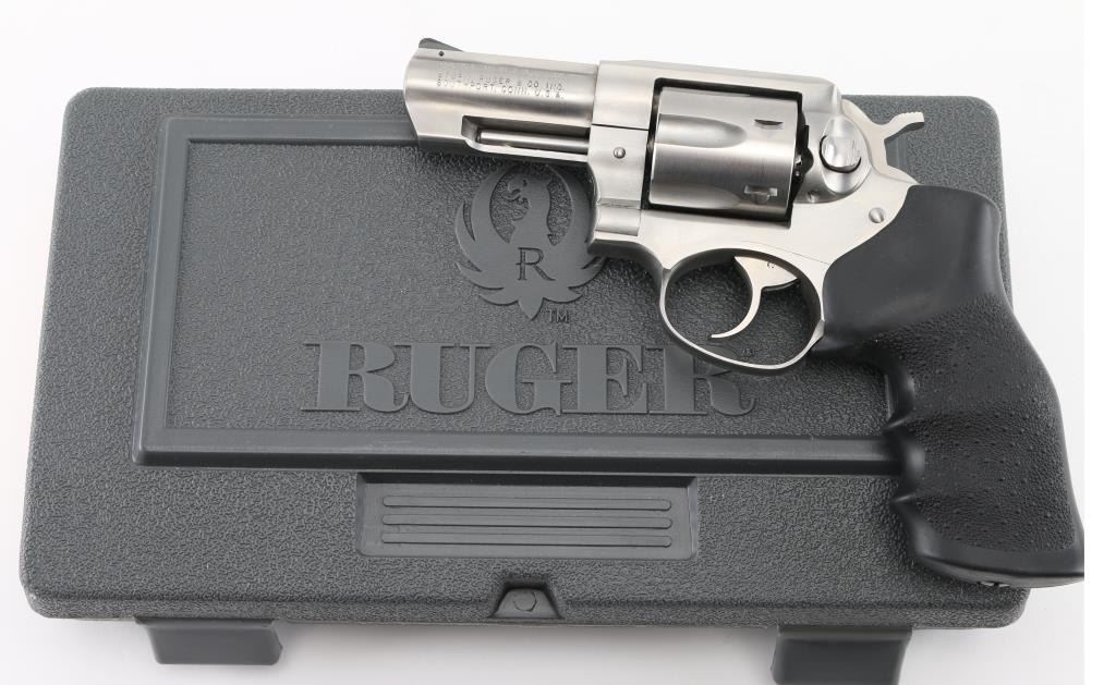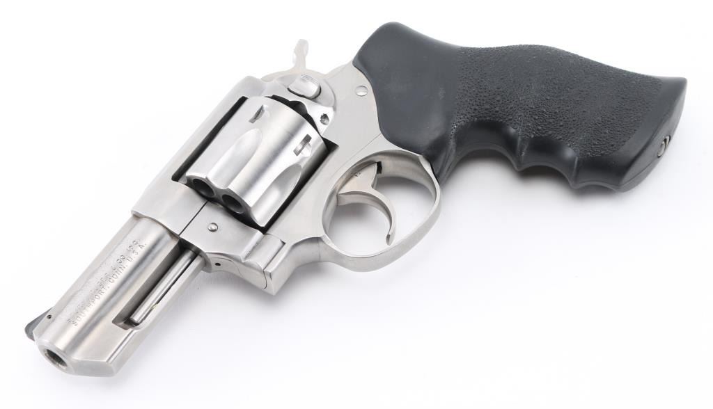 Revolver, 6-shot, double action. Stainless steel. Pebbled black rubber finger grooved grips. pinned blade front sight, notch rear sights. It has a 3" barrel with full shroud. Bore, and cylinder chambers are excellent/bright. Action is tight, cylinder locks up tight. Comes in original gray plastic factory case, with paperwork, and lock. No visible marks, pistol is in like new condition. NRA Condition-Excellent. Modern Firearm.