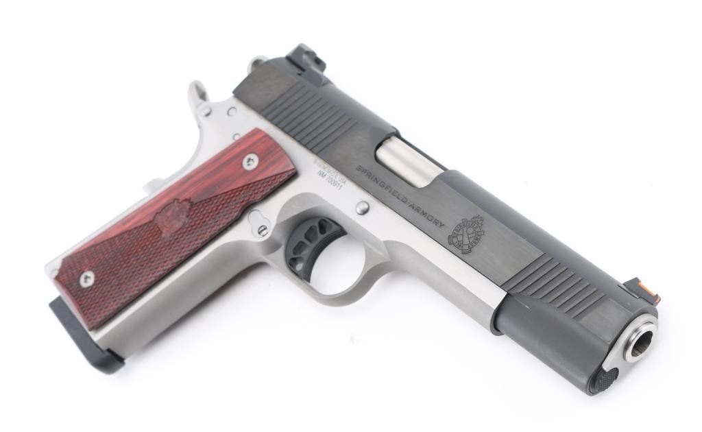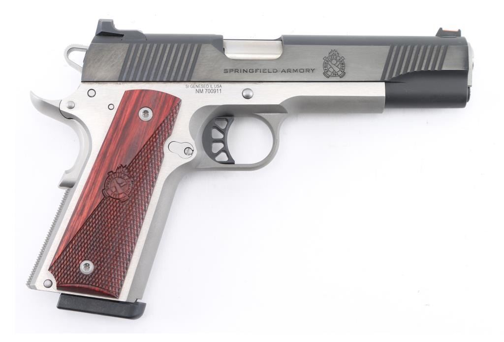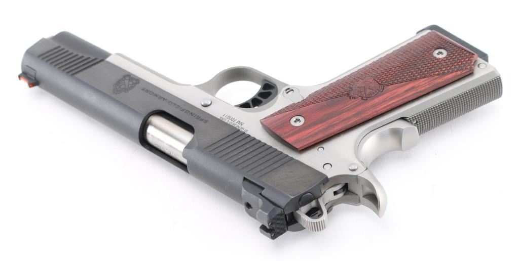 American made 1911 style semi-auto pistol chambered for 10mm ammunition. It features a stainless steel frame and slide, a 5" barrel, dovetailed sights, front is red fiber optic, and the rear is white two dot. The hot salt bluing on the slide looks great in contrast to the polished flats and matte finish on the frame. It has a black, serrated skeletonized trigger, skeletonized and serrated hammer spur, thumb safety, grip safety, checkered back strap, smooth front strap and half checkered rosewood (?) grip panels. Metal finish looks great almost no sign of use or handling. Bore looks great, bright. Grips are fine. Comes with original factory cardboard box, Springfield branded soft case, owners manual, extra black grip panels, lock, and five (5) magazines. Condition is NRA Excellent ***Modern Firearm***