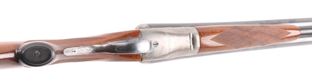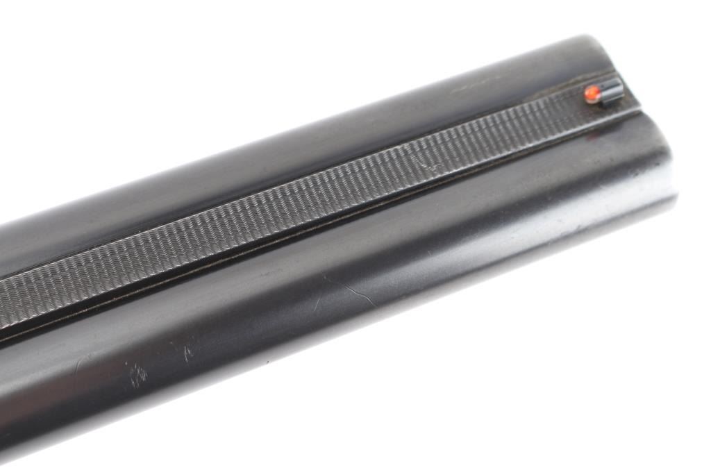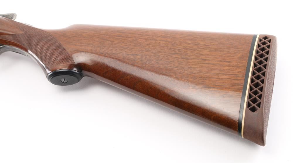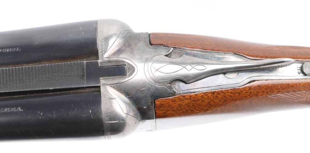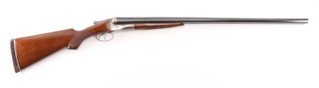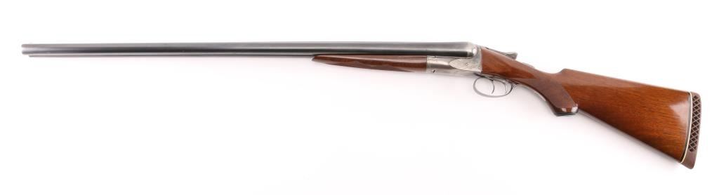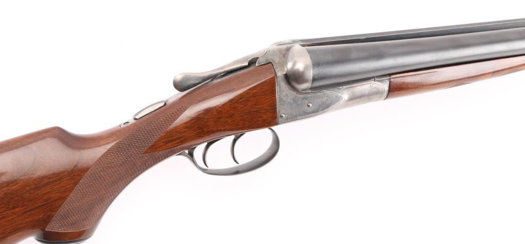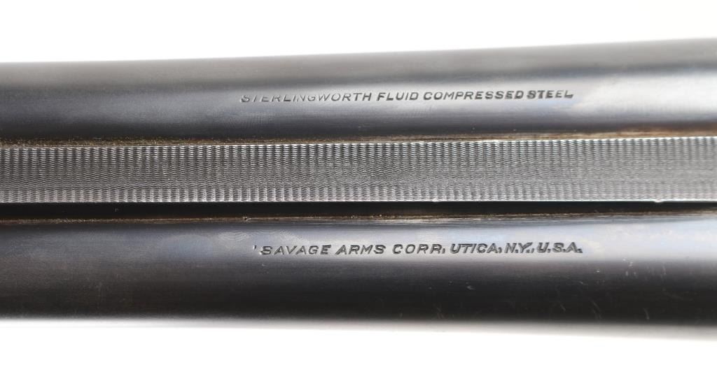 Pre-war side-by-side double barrel boxlock shotgun chambered for 12 gauge shells, manufactured circa 1929-46. Features a blued & case hardened finish, 30" barrels with raised solid concave sighting rib & 2 3/4" chambers, extractor, red fiber optic bead front sight, double triggers, sliding tang safety, knurled top lever, simple zig-zag border engraving on the receiver, hand checkered walnut splinter forend with satin finish and semi-pistol grip shoulder stock with vented Pachmayr recoil pad. Shotgun exhibits faded case color and retains approximately 75% thinned bluing on the barrels which showing carry wear, scattered scratches & muzzle wear. Action is crisp, bores are good, markings are good and the refinished wood stocks are very good with minor losses. LOP is 14.5" from forward trigger, chokes are IM & CYL. Savage Utica, NY barrel address. Condition is NRA Very Good. C&R Firearm.