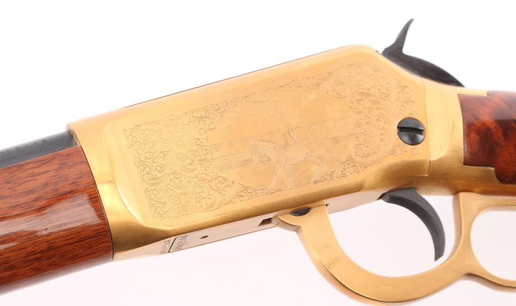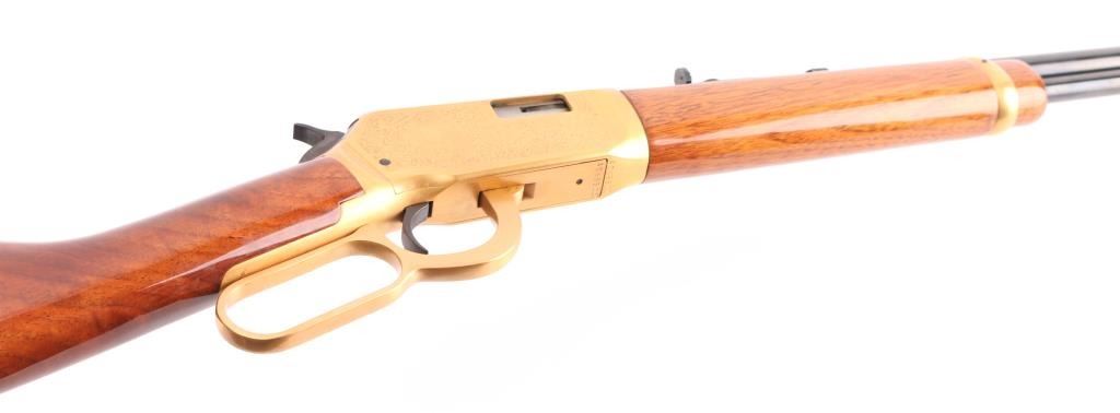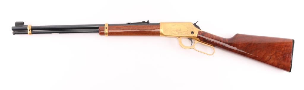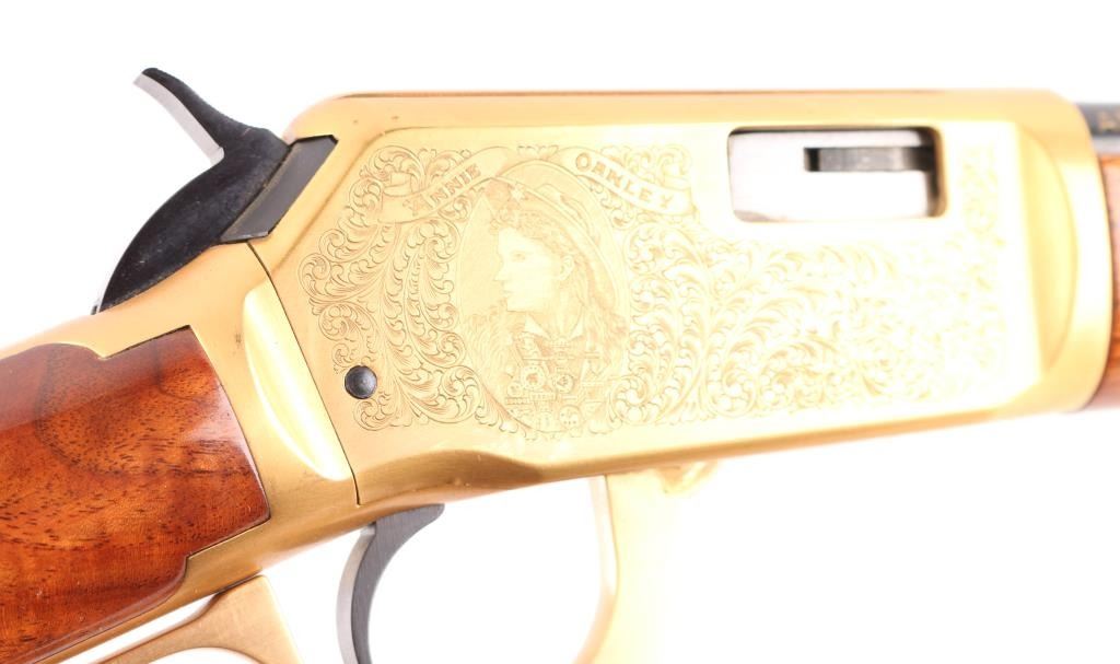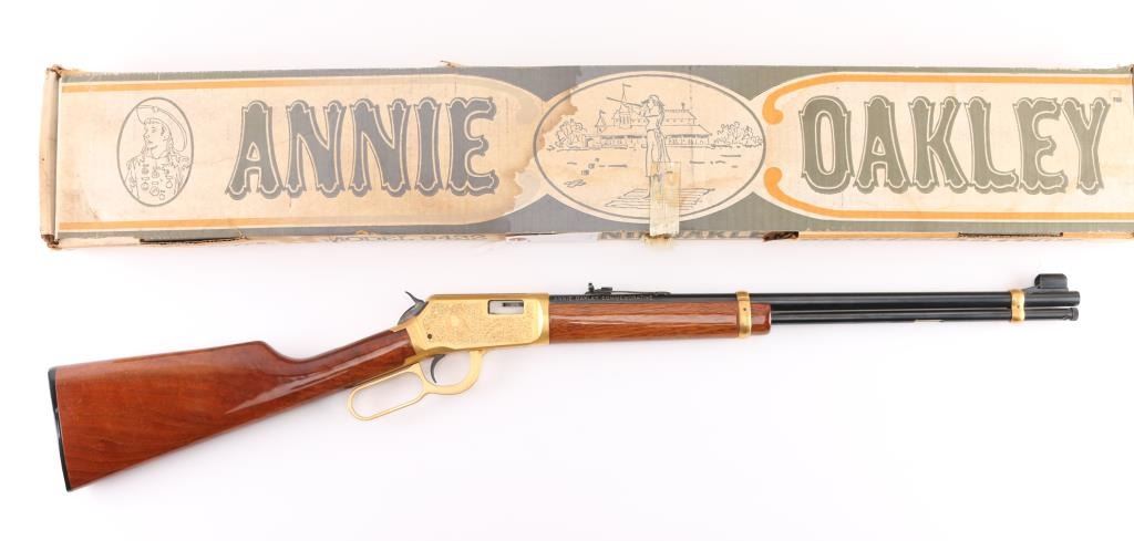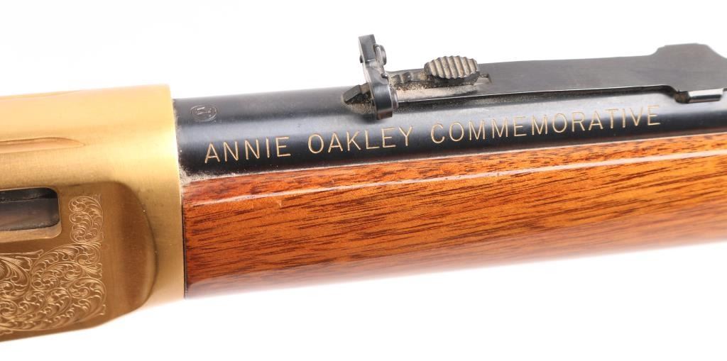 SN: AOK5544. One of 6000 produced in 1982 (ATF C&R) 20" blue barrel with hooded post/bead front sight & rear sporting sight, full length tube magazine, deluxe high gloss walnut stocks, factory buttplate. The left side of the barrel is marked “WINCHESTER MODEL 9422 XTR -.22 S-L-LR / -MADE IN NEW HAVEN, CONN. U.S.A.WINCHESTER PROOF STEEL-”. The right shoulder of the barrel is marked “ANNIE OAKLEY COMMEMORATIVE”. The top of the barrel is marked with “WP”. The bottom of the frame and lever assembly are marked “AOK5544”.The right side of the receiver is engraved with a bust of Annie decorated in all her accolades under her name “ANNIE” and “OAKLEY” each on a banner. The left side of the receiver depicts Annie shooting a target while standing on a horse. Both sides of the receiver contain floral scroll engraving. Bore is excellent, almost new condition. Comes in original box with paperwork. NRA Condition-Excellent. C&R Firearm