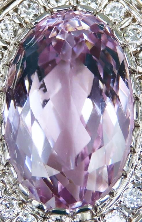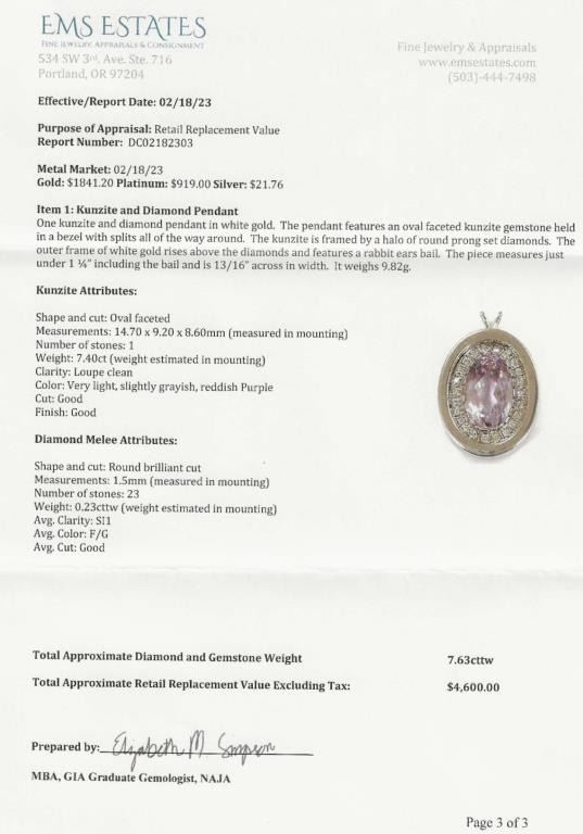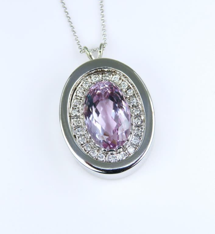 and Diamond Pendant featuring a very fine custom cut Pink Kunzite weighing approx. 7.40 carats framed with 23 ‘IDEAL’ cut Diamonds weighing approx. 0.23 carats with F-G colors and SI clarity set in a 14 karat white gold custom setting. Full Retail Appraisal - $4,600.00