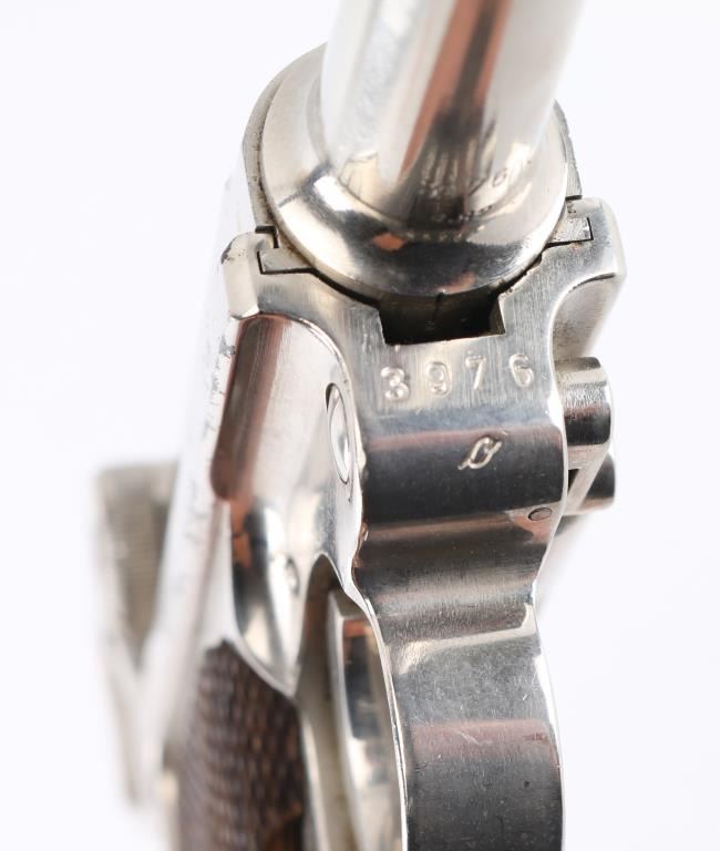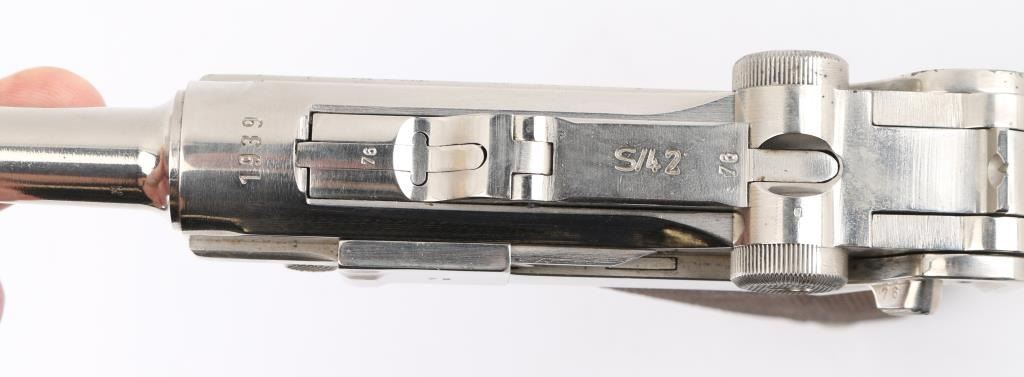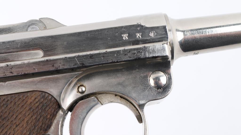 This is a Mauser S/42, 1939 dated P-08 Luger that has been refinished in nickel, all matching serial numbers including the magazine. Pre war eagle proofs, with correct eagle 63 waffenamts. Matching magazine has the same waffenamt. Bore is good, strong rifling, light pitting in the grooves, grips are very good, Nickel refinish is about 94% with minor flaking on the left frame, heel, and muzzle. After WW2 the VFW posts used to nickel war souvenirs and display them in the posts. NRA Condition-Good. C&R Firearm.