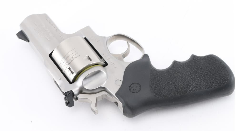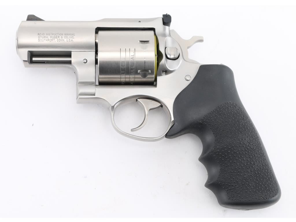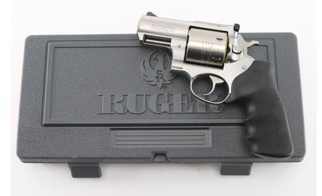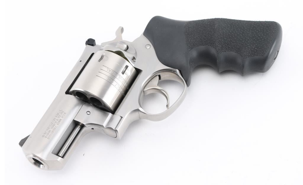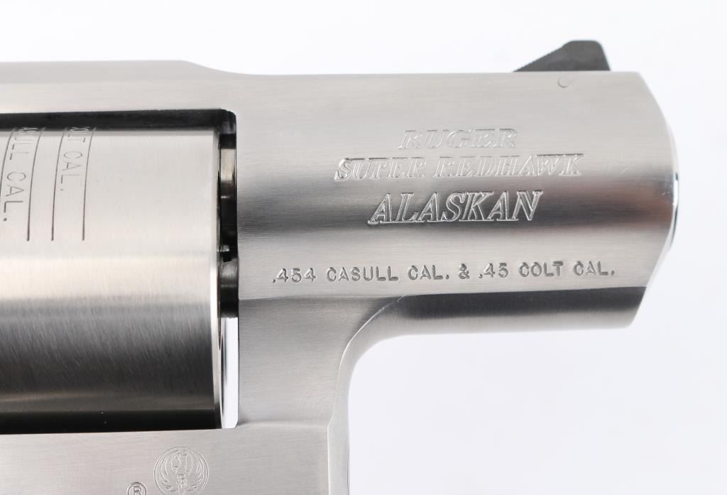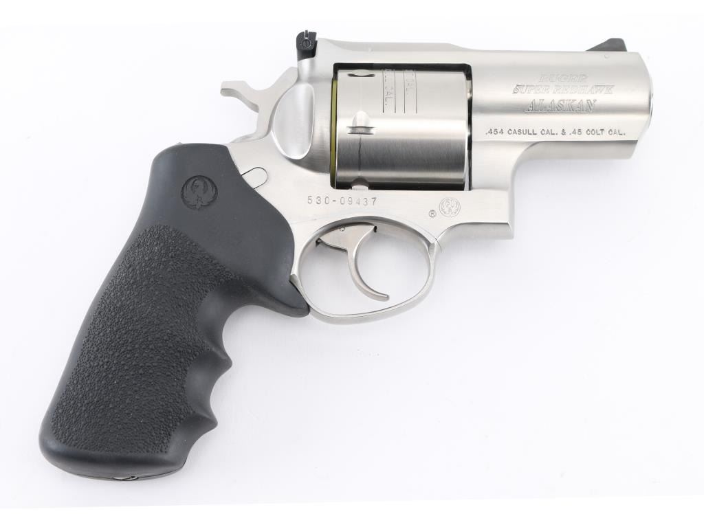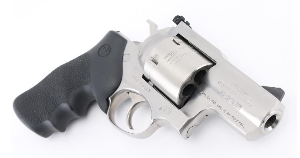 Sn:530-09437 American made 6 shot revolver chambered for .454 Casull and .45 Colt ammunition, circa 2006. The "Alaskan" features a 2" barrel (hang on) full underlug, Stainless steel frame, barrel, and unfluted cylinder. It has a smooth trigger, knurled hammer spur, black blade front sight, adjustable white outline notch rear sight and black rubber, finger groove, pebbled wrap around grips, with embossed Ruger logo. Metal finish looks great, very little if any signs of use or wear with a light drag line on the cylinder. Bore looks great, a little dusty. Grips are fine. Comes with original factory hard case, owners manual, lock, and factory fired brass. Condition is NRA Excellent *Modern Firearm*