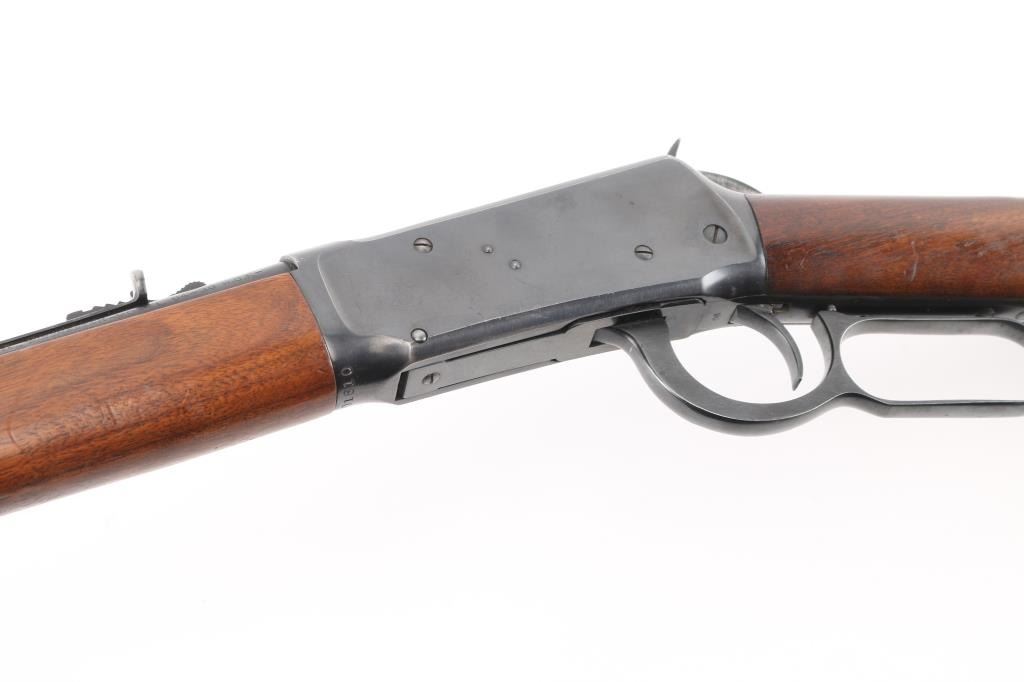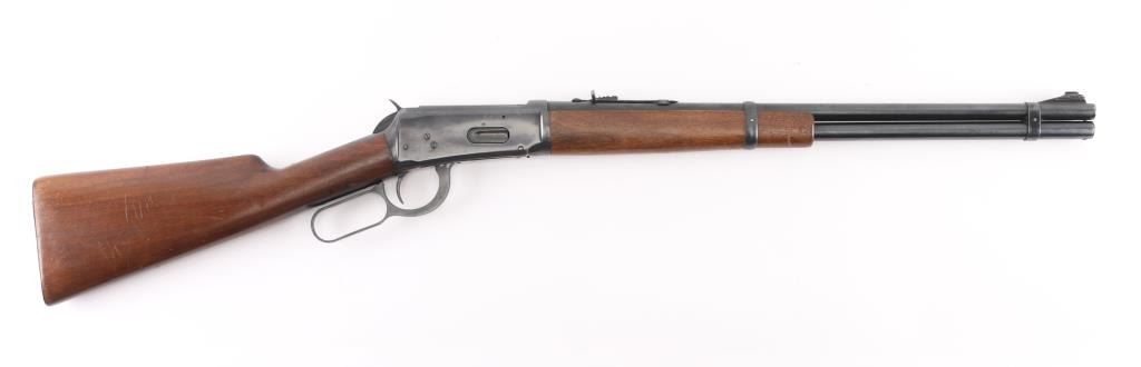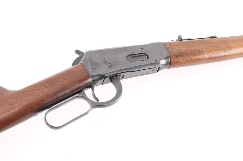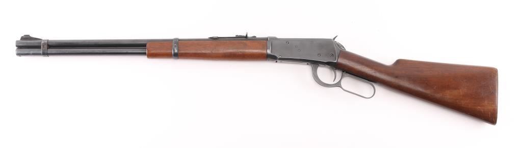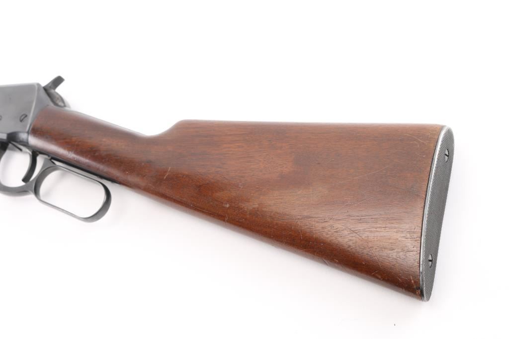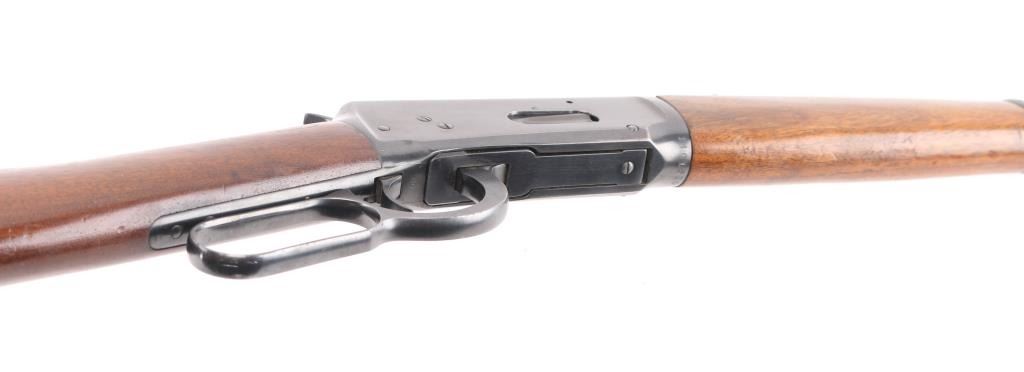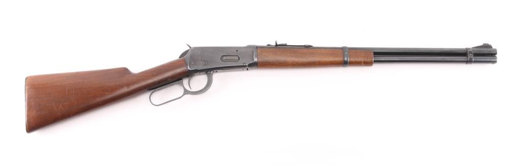 'Pre-64 Eastern Carbine' Lever action repeating rifle manufactured in New Haven, CT circa 1943-48. Features a blued finish, 20" tapered barrel, full-length tube magazine, ramped blade front sight, sporting adjustable rear sight, smooth trigger, serrated hammer spur, two barrel bands, smooth walnut forend and straight grip shoulder stock with checkered steel buttplate. Bore is very good condition. Retains 90% finish with edge losses, scratches, small light rust spot on the tube. Wood is very good condition with dents & scuffs. Condition is NRA Good++ C&R Firearm