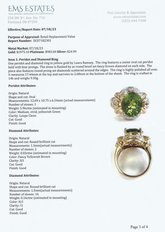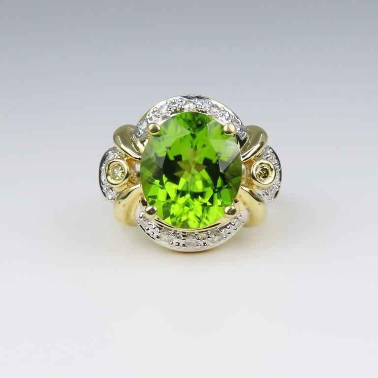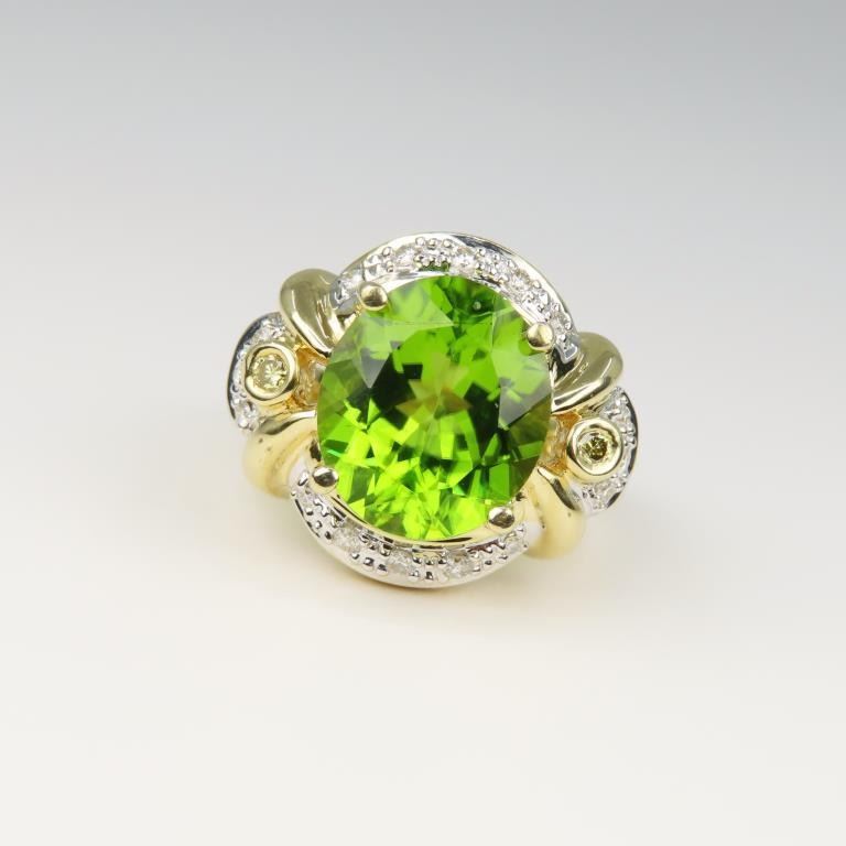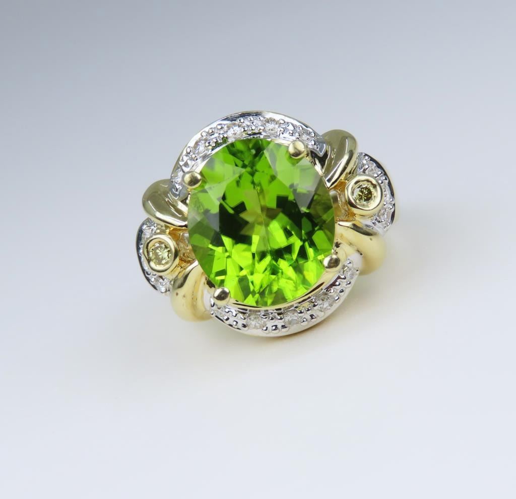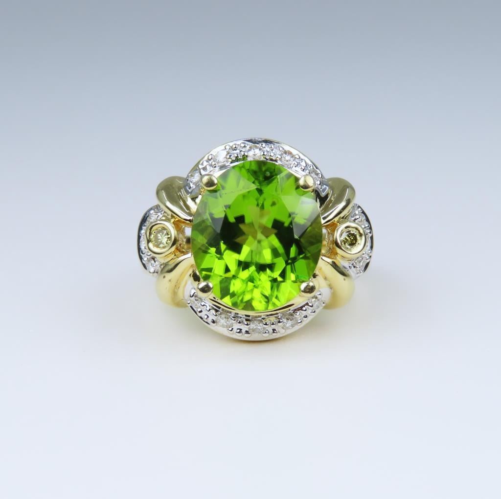 Fine Peridot and Diamond Ring featuring an oval shaped Peridot weighing approx. 6.00 carats and pave set with 18 Diamonds set in a glamorous Hallmarked custom 14 karat yellow gold setting. Size 7. Retail Appraisal - $4,800.00
