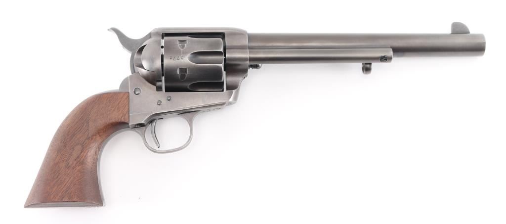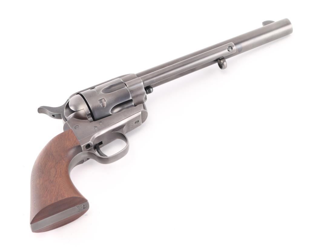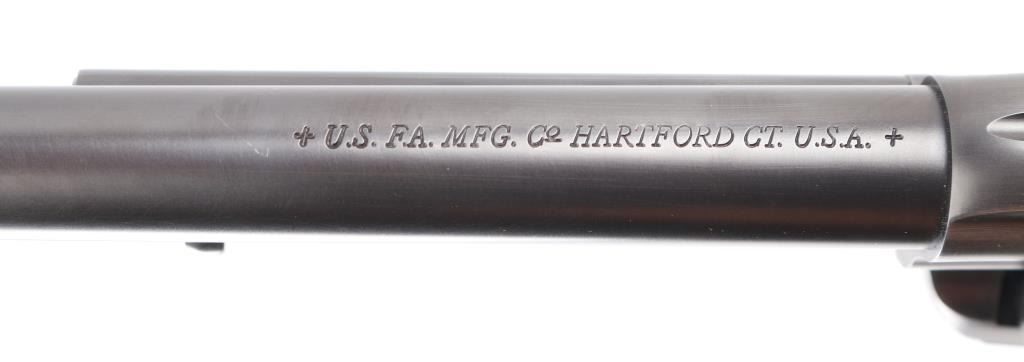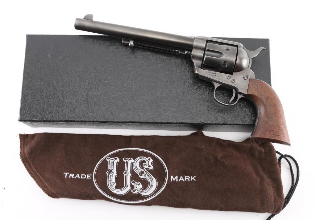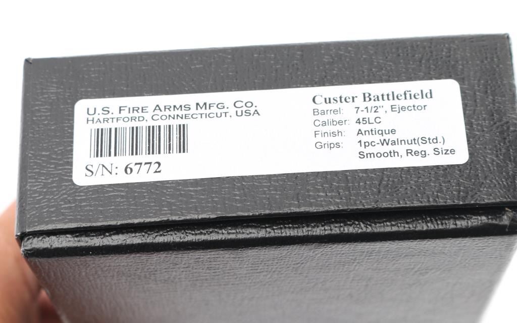 SN: 6772. United States Fire Arms Custer Battlefield 7.5” in 45 Colt. The USFA Custer Battlefield was manufactured to appear aged, as if you might have found it and picked it up off the field of Little Big Horn. These revolvers were an extremely limited run. The serial numbers used were the same range as those issued to the ill-fated Custer’s 7th Cavalry. The guns have all the markings consistent with the original .45 Colt 1873 SAA’s, the left buttstock cartouche, "OWA" & "A" stamped on the backstrap, cylinder, and triggerguard for inspector Orville W. Ainsworth, and again the serial numbers within the correct range and placed in the historically accurate locations on the firearm just as Colt did. "US" on left frame. Exceptional single-action revolver produced by United States Fire Arms Mfg. Co. based out of The Colt Armory complex in Hartford, Connecticut. The company is renowned for their superb quality and finish but went out of business in 2011. The revolver has a couple of very minor scratches, otherwise like new. Comes in the original factory box with paperwork , and cloth bag, box is excellent. NRA Condition-Excellent. Modern Firearm.