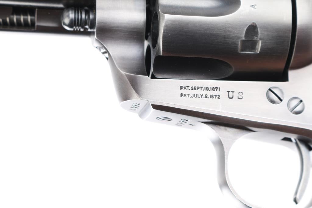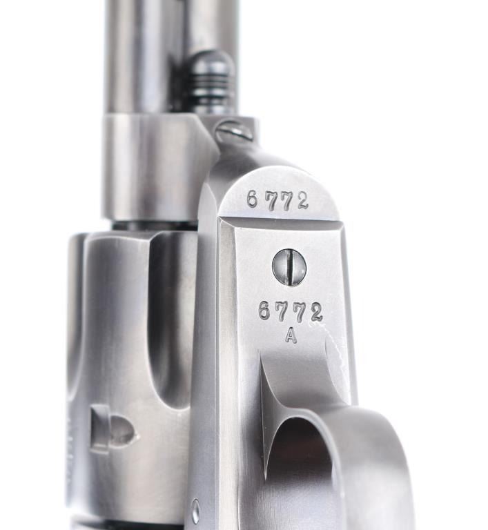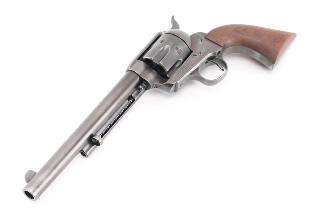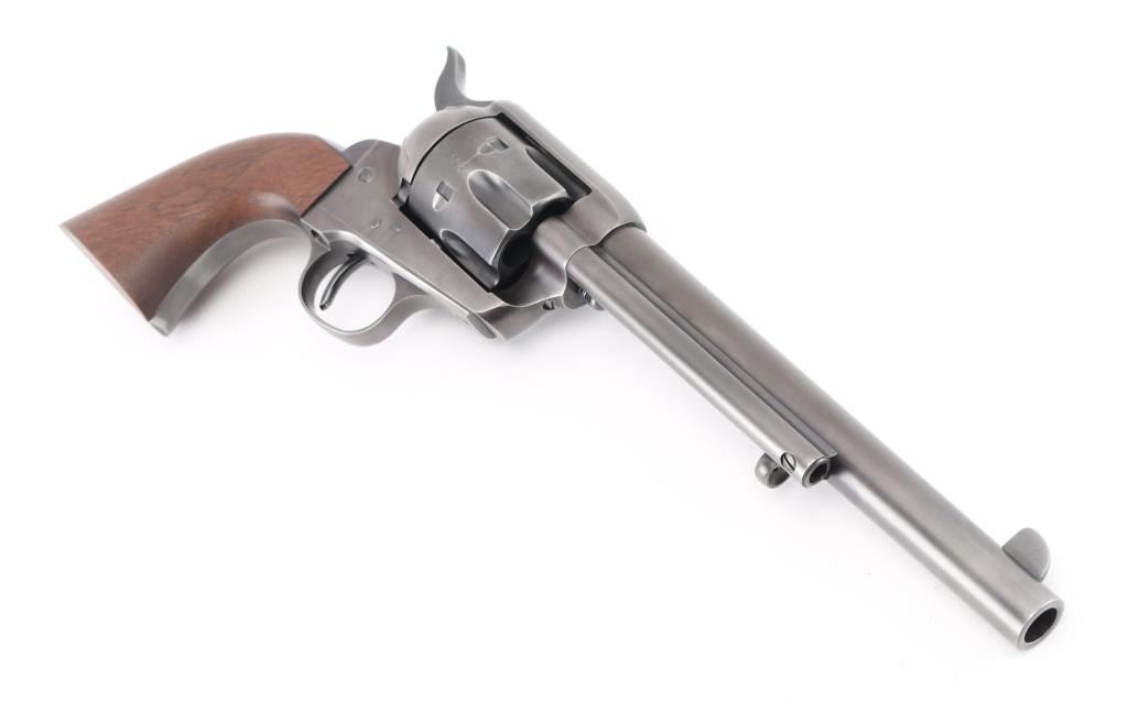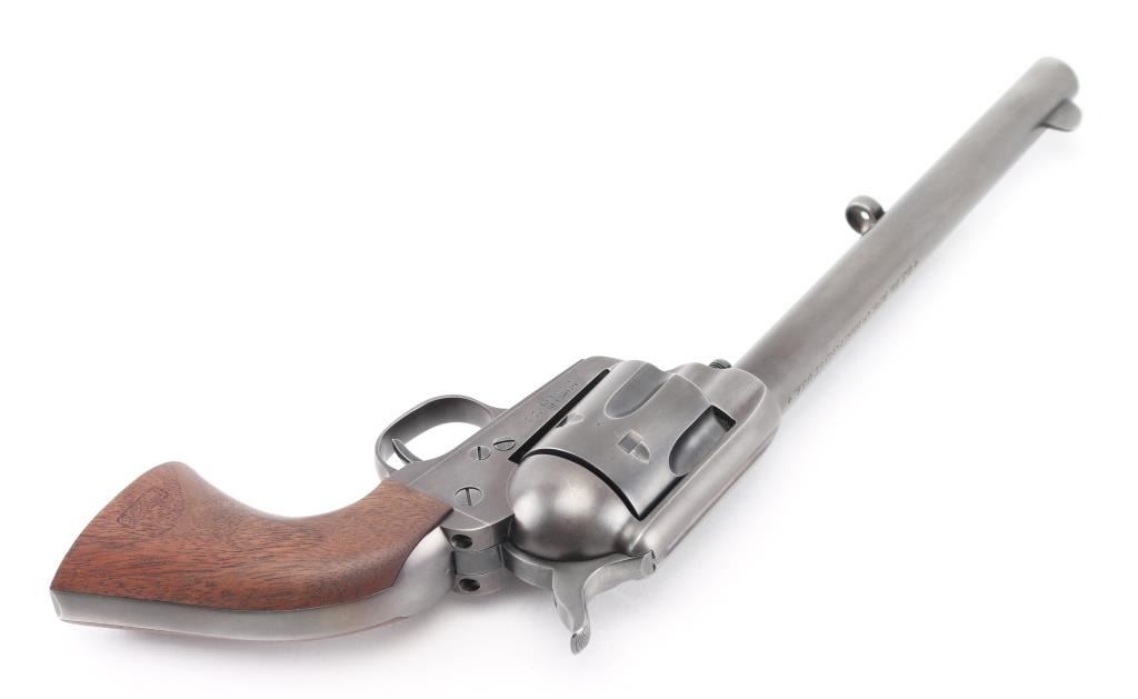 SN: 6772. United States Fire Arms Custer Battlefield 7.5” in 45 Colt. The USFA Custer Battlefield was manufactured to appear aged, as if you might have found it and picked it up off the field of Little Big Horn. These revolvers were an extremely limited run. The serial numbers used were the same range as those issued to the ill-fated Custer’s 7th Cavalry. The guns have all the markings consistent with the original .45 Colt 1873 SAA’s, the left buttstock cartouche, "OWA" & "A" stamped on the backstrap, cylinder, and triggerguard for inspector Orville W. Ainsworth, and again the serial numbers within the correct range and placed in the historically accurate locations on the firearm just as Colt did. "US" on left frame. Exceptional single-action revolver produced by United States Fire Arms Mfg. Co. based out of The Colt Armory complex in Hartford, Connecticut. The company is renowned for their superb quality and finish but went out of business in 2011. The revolver has a couple of very minor scratches, otherwise like new. Comes in the original factory box with paperwork , and cloth bag, box is excellent. NRA Condition-Excellent. Modern Firearm.