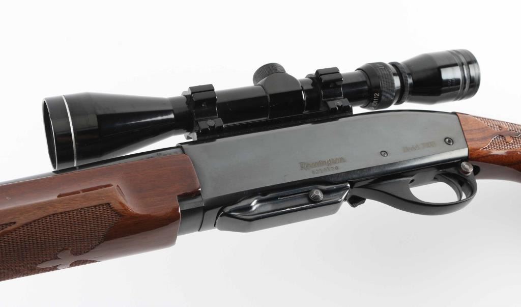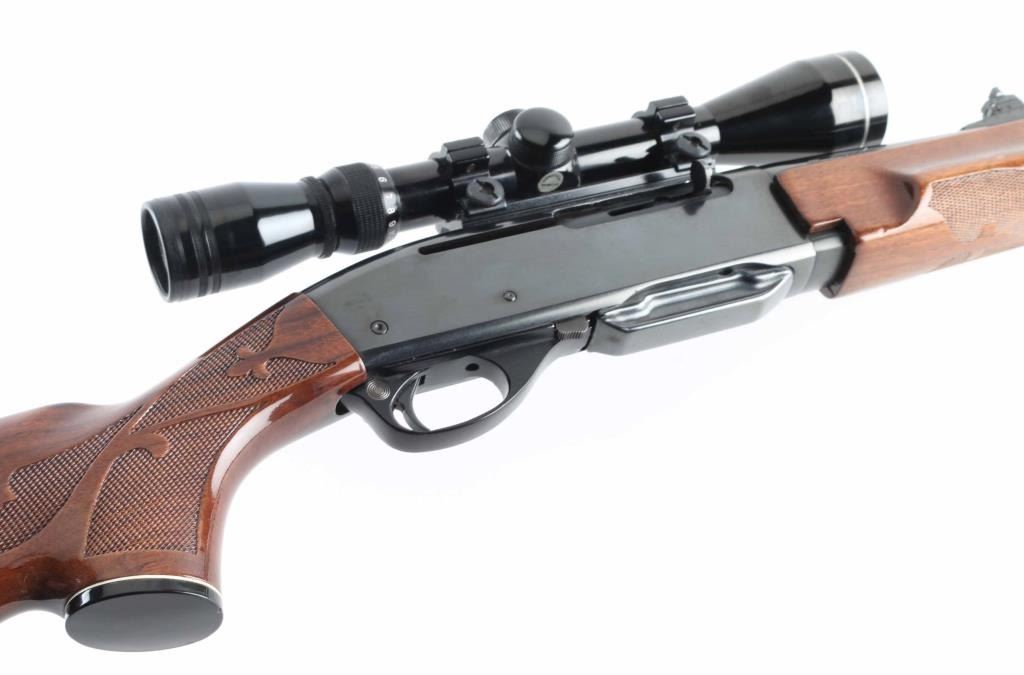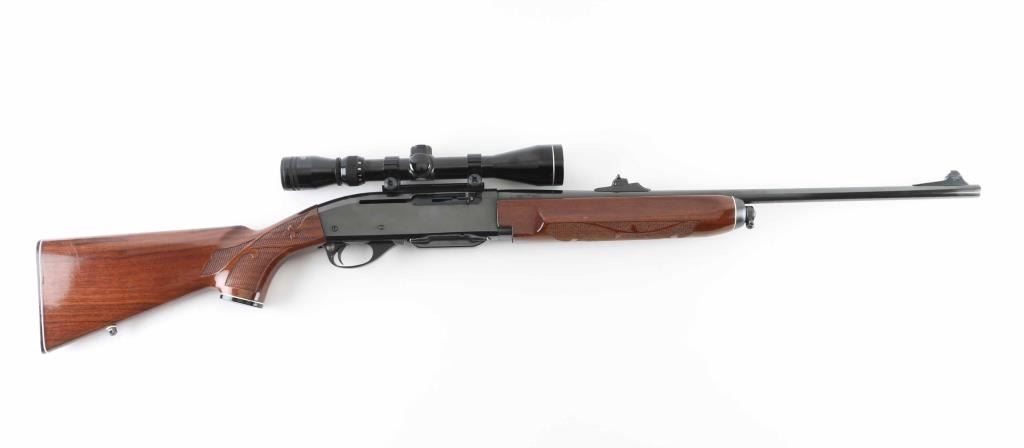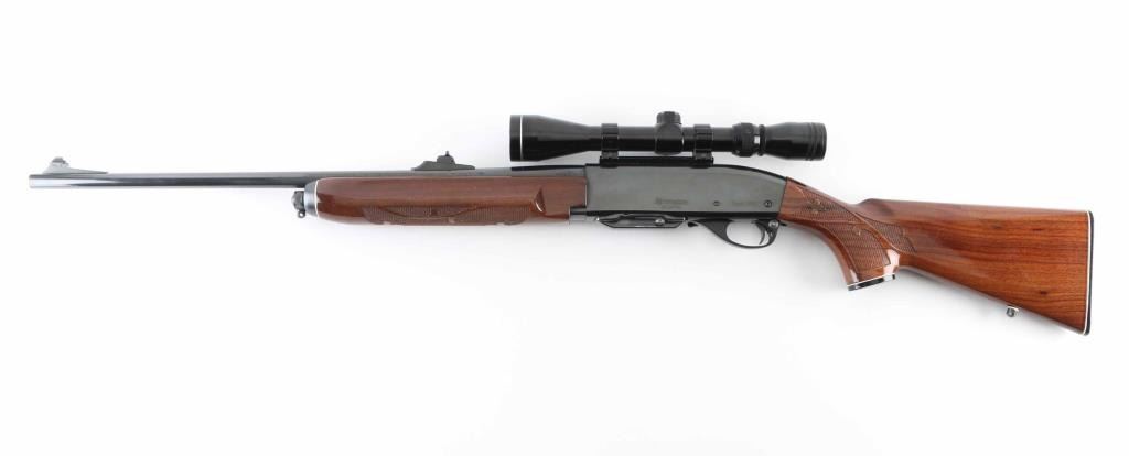 Semi- automatic rifle manufactured from 1981-2004. Features approx 22 inch barrel which is stamped 280 Rem. (7 mm EXP. REM), detachable magazine, adjustable sights, weaver style scope mounts, manual safety. Two piece wood stock has fancy bordered checkering around forend and at sides of wrist, polyurethane finish, black plastic buttplate and grip cap with white spacer, and blued steel forend cap with white spacer. Bore is excellent. Retains 90% blue with few scratches. Stock is excellent with few observed light scuff marks from handling. Mounts a Tasco 3-9x scope. View thru scope is clear and bright. Includes one magazine. NRA Excellent Modern Firearm