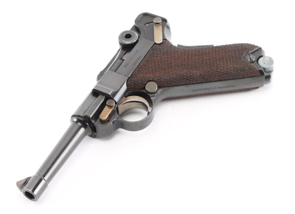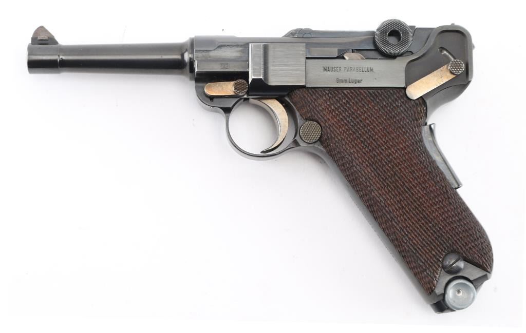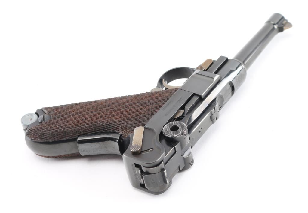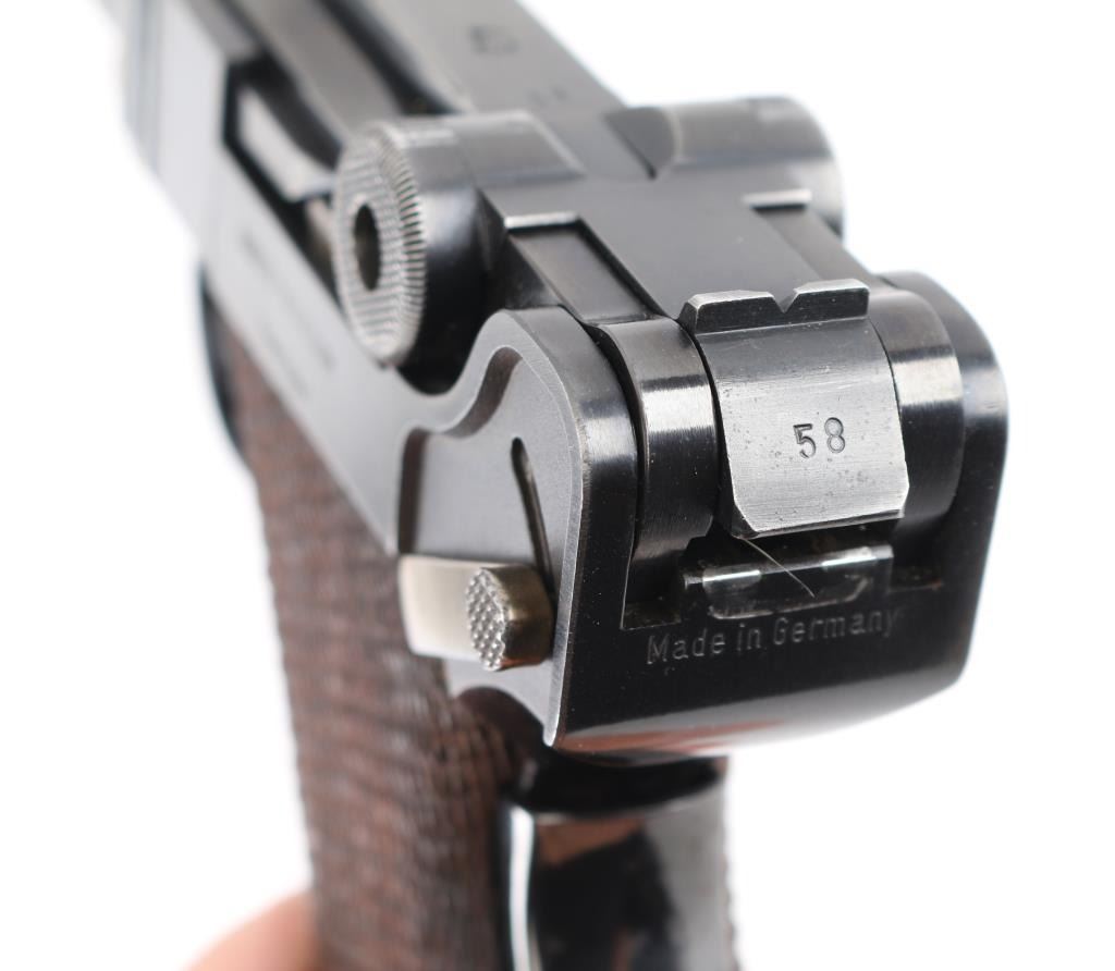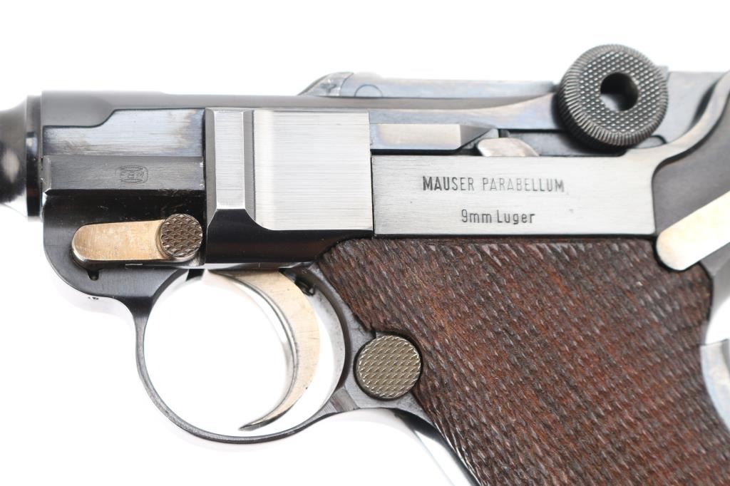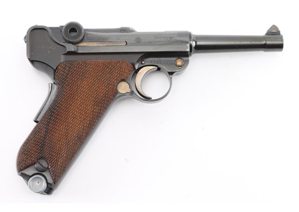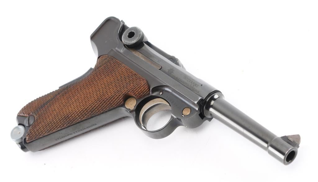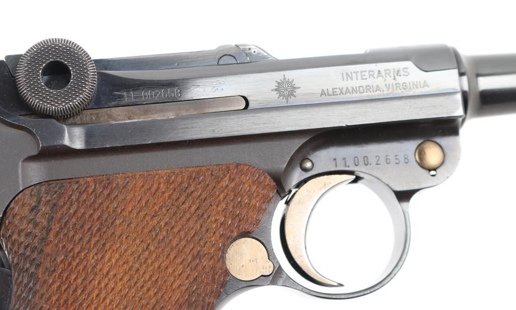 SN: 11002658. 'American Eagle Luger’ Post-war commercial production toggle lock recoil operated semi-automatic pistol chambered in 9mm Luger, manufactured in Germany circa 1970’s. Imported by Interarms of Alexandria, Virginia with import stamp on the right side of the barrel extension. Mauser markings on the fore strap. "42' marked toggle (Mausers wartime factory code) Features a blued finish with straw colored small parts & American Eagle crest to top of the breech, 4" barrel, dovetailed inverted 'V' serrated ramp front sight, 'U' notched rear sight, smooth crescent trigger, knurled charging knobs on the rear toggle link, manual safety of the left side of the frame, grip safety, knurled push button magazine release, 8 round magazine with aluminum base, steel frame with straight profile front strap, and two-piece checkered wood grips. Bore is very good condition. Pistol retains approximately 95% of its original blued finish showing minor edge wear, the serial number on the barrel extension is scratched but readable. Straw colored parts are very good. Grips are very good condition. Bore is pristine, Condition is NRA Near Excellent. C&R Firearm.