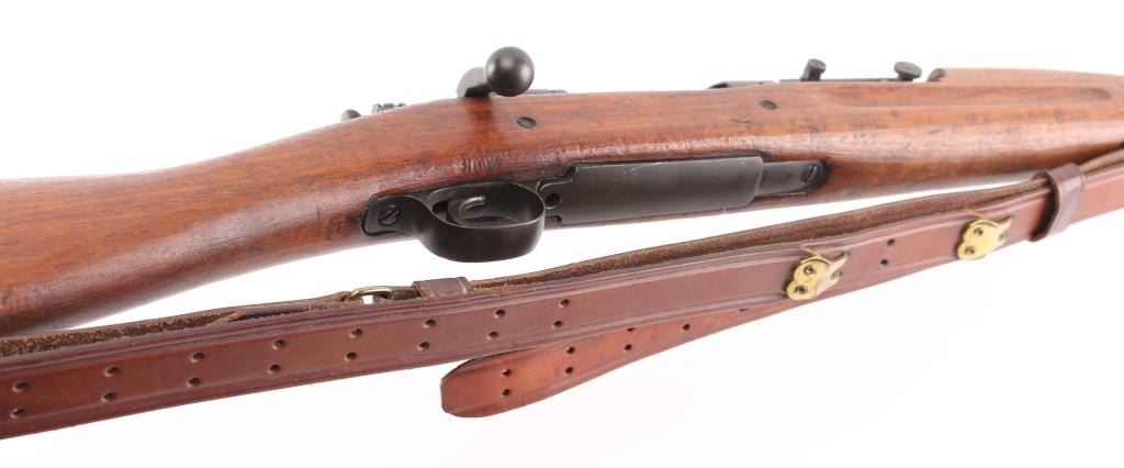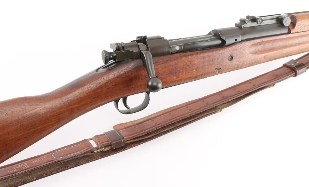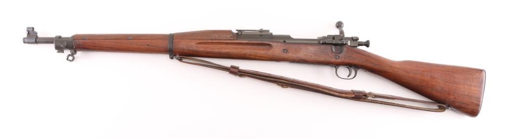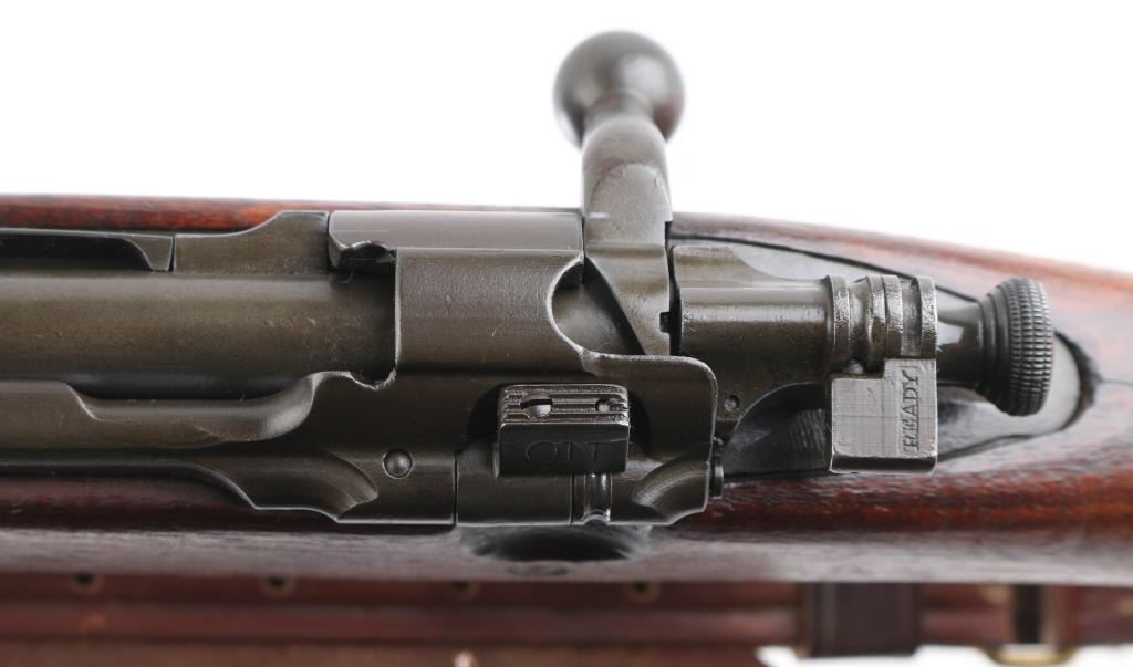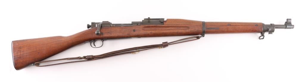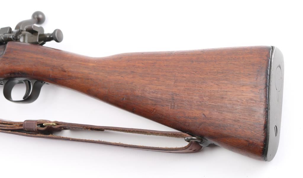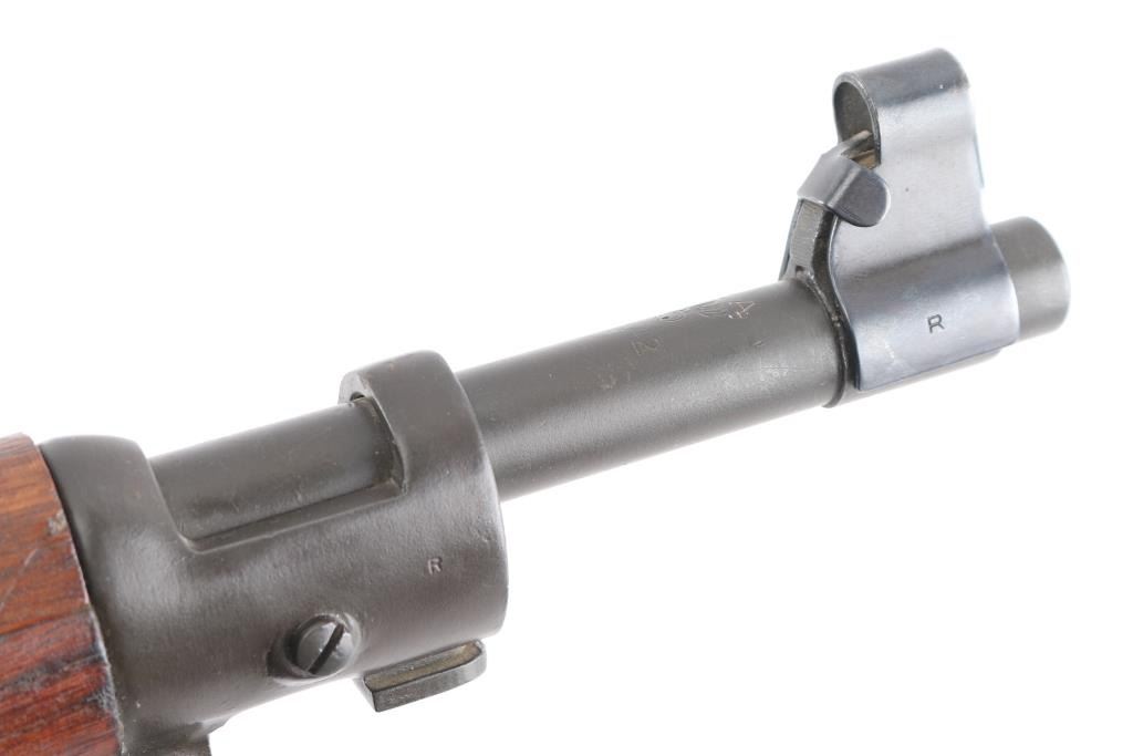 US WWII era military bolt action rifle manufactured circa 1942. Features parkerized finish, walnut shoulder stock with straight wrist, walnut handguard, 24" barrel, blade front sight, ladder type rear sight mounted at rear of barrel, bent bolt handle, manual safety, magazine cut-off switch, sling swivels, stacking swivel, butt trap with hinged cover, ( Metal oiler in buttstock) smooth flat steel buttplate. Rear barrel band is stamped. Bore is fair to good condition, strong rifling with light pitting. Retains 95% finish, with sight edge wear, friction wear on the bolt/extractor. Stock is good serviceable condition, some oil staining, dents & dings throughout. Barrel marked "RA / (flaming bomb) / 2-42". Stock markings include "P" in circle. Front sight cover stamped 'R', & 'U.S.' under flaming bomb. Comes with correct, but newer made brown leather sling. Condition is NRA Good. C&R Firearm.