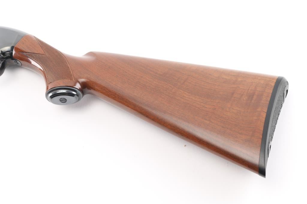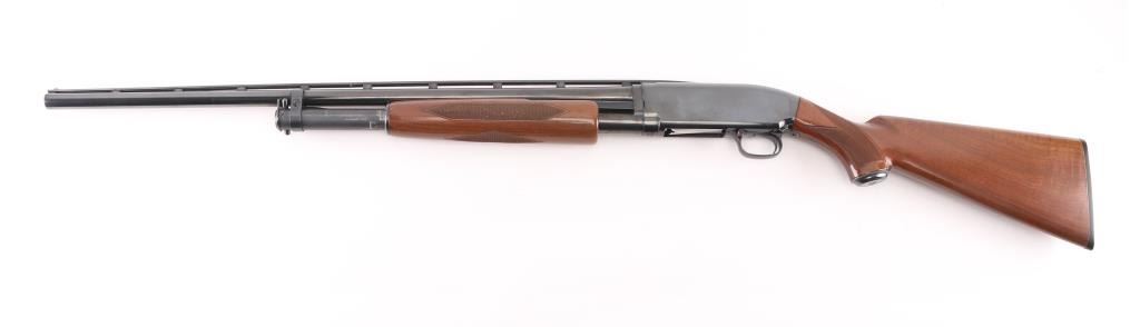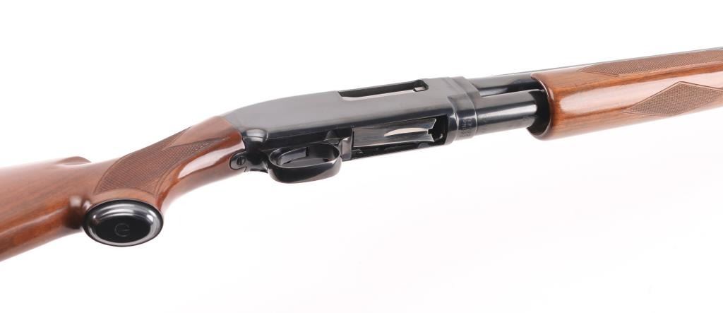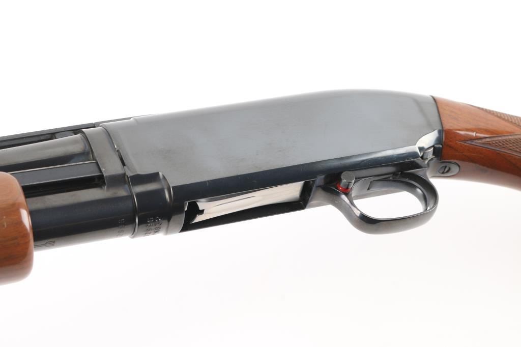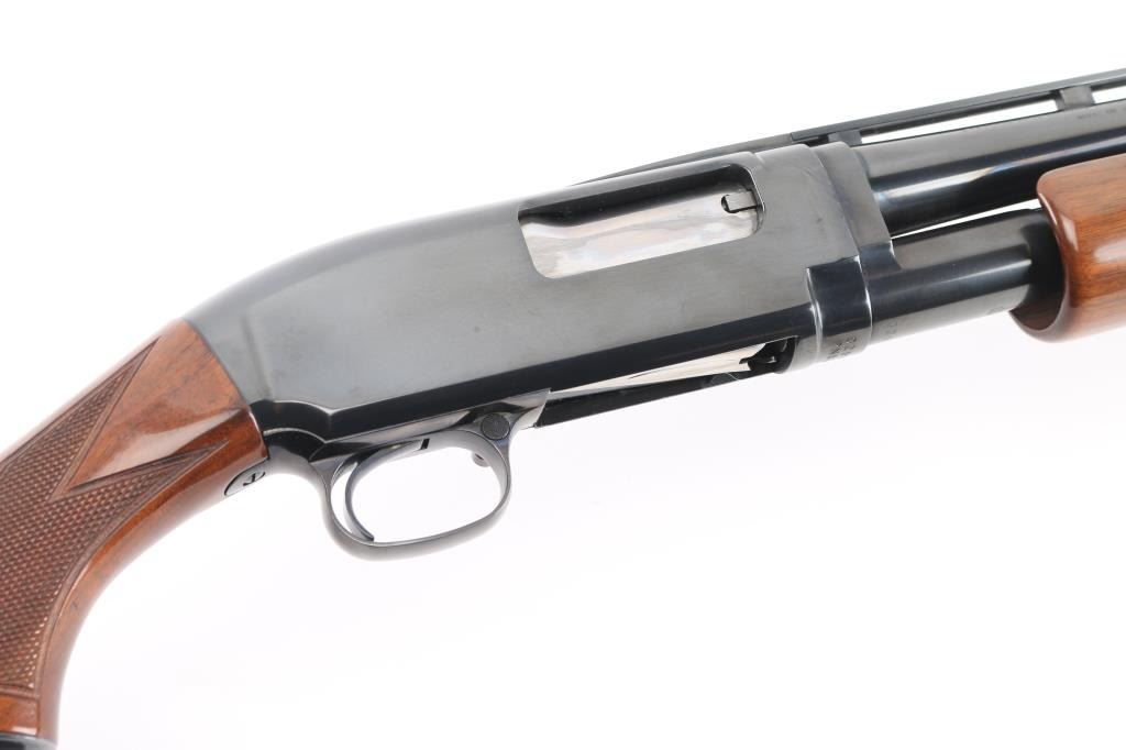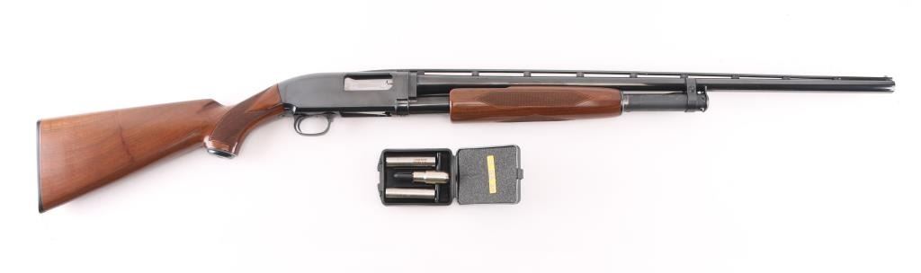 Limited edition reproduction of the famous Winchester Model 12, chambered for 2 3/4" 20 gauge shells. Manufactured in Japan by Miroku circa 1990 with only 8,000 Grade I guns produced in 20 gauge. Features a polished blued finish, 26" take-down barrel with high post floating sighting rib, white polymer Bradley bead front sight, small white polymer mid bead, 5 round magazine tube, smooth trigger, push button safety, polished bolt, checkered walnut slide handle with satin finish and pistol grip shoulder stock with metal grip cap & factory black plastic buttplate. Accepts choke tubes (SKT installed). LOP is 14". Bore is excellent/bright. Metal finish looks great, 97% retained, with few signs of handling. Wood stocks look great with minor handling marks. Includes small plastic case with Mod & IC tubes, choke tube wrench. Condition is NRA Excellent *** Modern Firearm ***