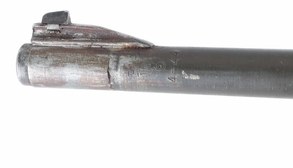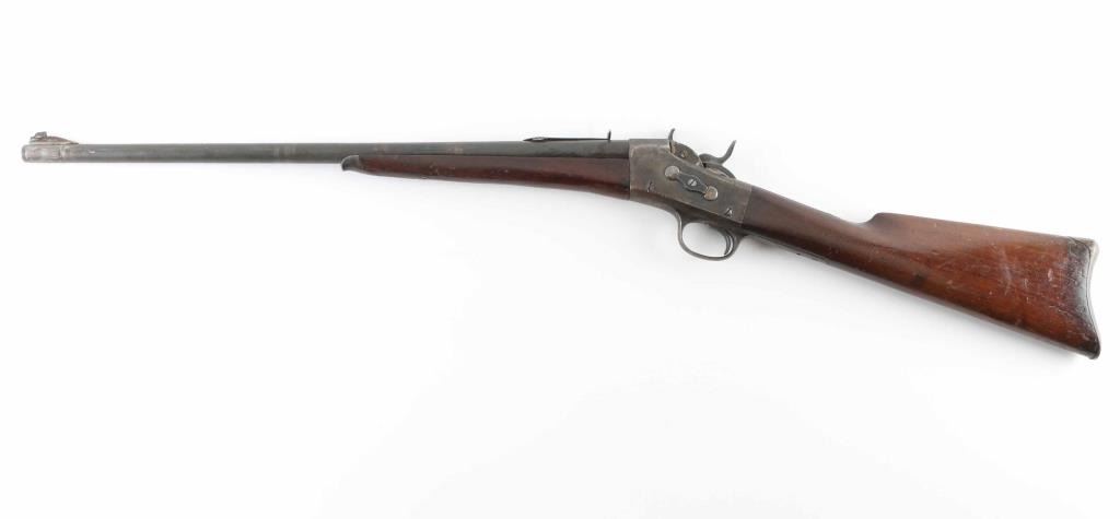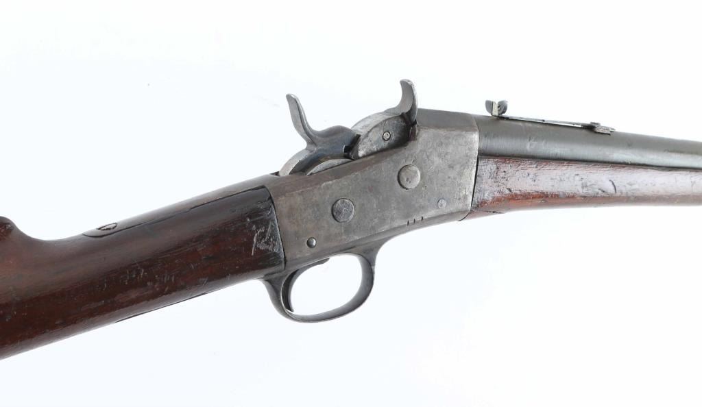 Rifle with Rolling-Block Action, with Carbine configuration. 22" barrel with front triangle, and v-notch rear sights. Has been re-barreled with a U.S. .30 cal. barrel stamped R A 4-44, with flaming ordnance bomb. Bore appears good, but dirty. Action is stiff. Barrel has wartime parkerized finish. Receiver has turned a dull gray patina, with rust spots. There is rust on the block. There are 3 notches cut into both sides of the receiver. Wood has scratches/dings, and has been varnished. Steel schnabel forearm cap. Chip repair on lower forearm. Crescent steel buttplate. "385" stamped on lower tang. NRA Condition-Fair. Antique Firearm.