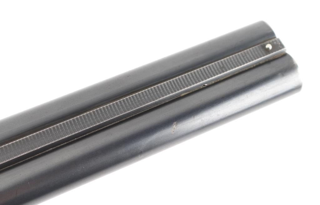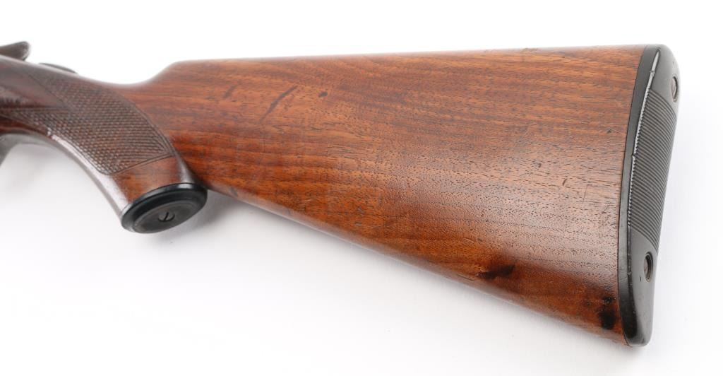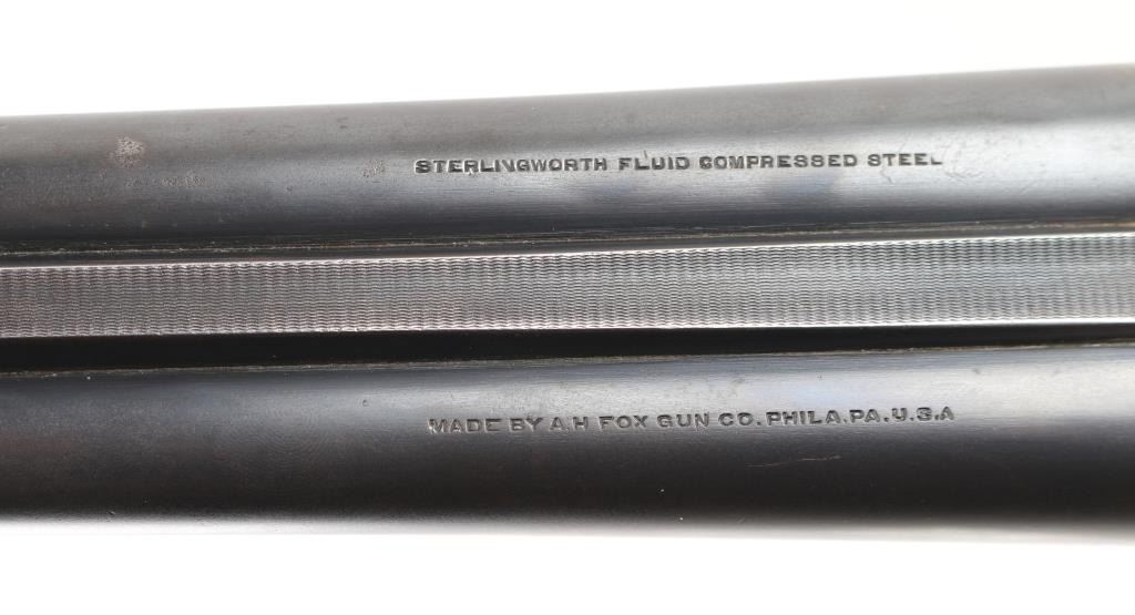 Vintage American made SxS double barrel shotgun made circa 1915-1919. Features blued finish on barrels & triggerguard, case hardened receiver, 28" barrels with raised matted rib, CYL & IM chokes, steel front bead, double triggers, tang safety, single piece extractor, wood splinter forend with checkered panel across bottom, curved grip wood stock with checkered wrist, black composition buttplate & grip cap. Simple Zig-Zag engravings on edges. Bores appear very good, need cleaning, barrels lock up tight. Retains 80% blue, handling wear, with some minor scratches/rubs, case hardening finish is about 10% with handling loss. Wood is good serviceable condition, with minor scratches/dings,have been refinished . Barrel address: "MADE BY AH FOX GUN CO PHILA PA USA", & "STERLINGWORTH FLUID COMPRESSED STEEL". Sterlingworth marked lock plates. LOP is 14.25 from the forward trigger. Matching serial numbers. NRA condition-Good. C&R Firearm.