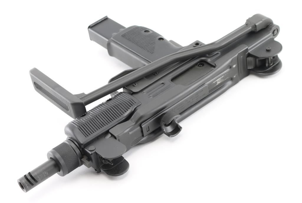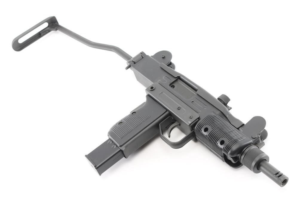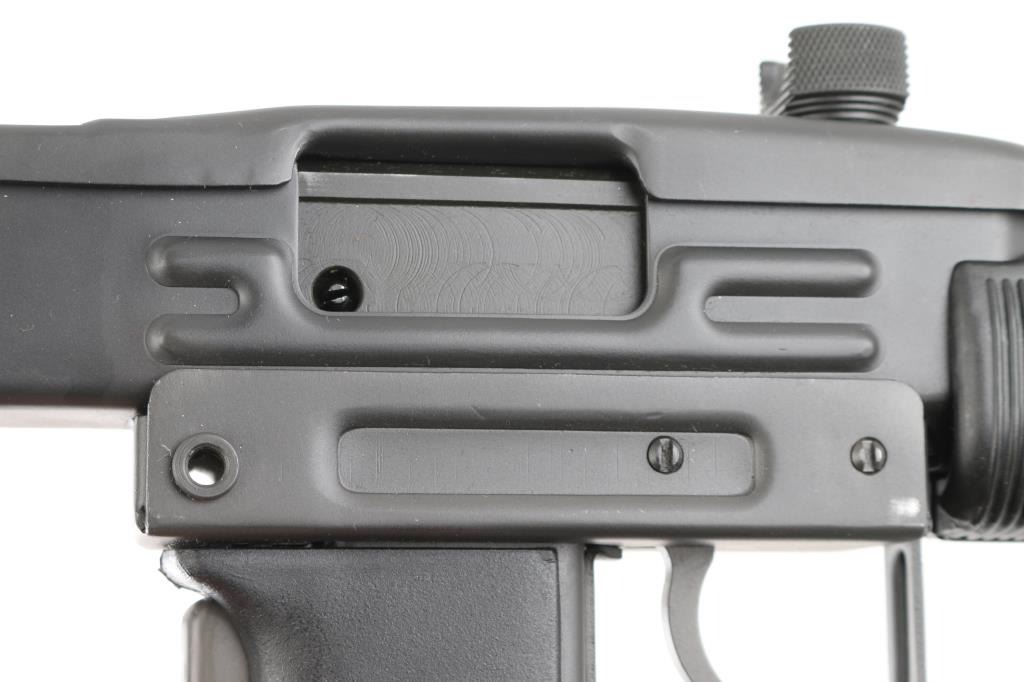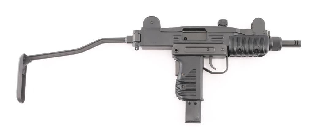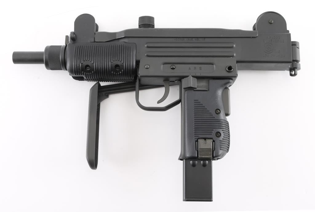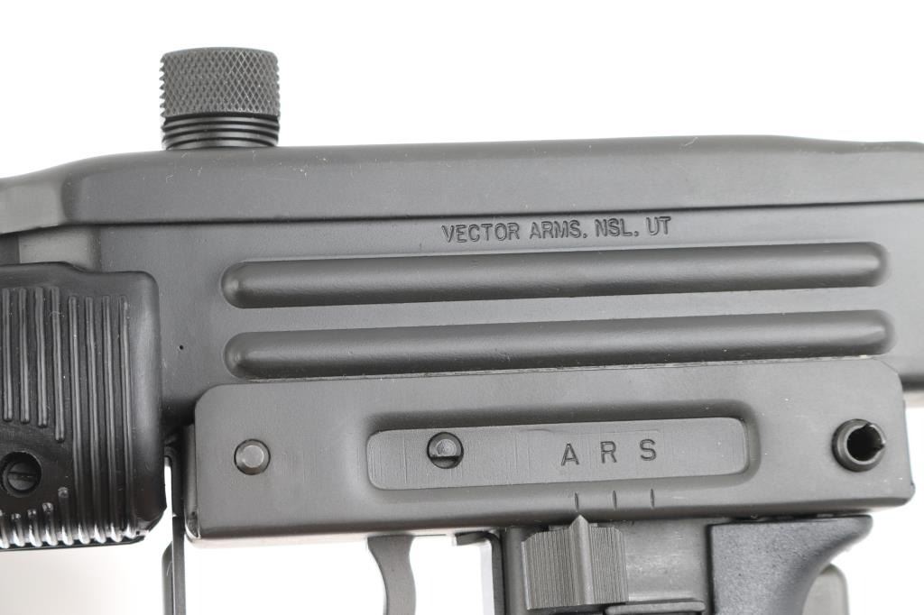 Fully transferable select fire 9x19mm machinegun. US made copy of mini Uzi submachinegun, using Vector Arms receiver. This and two others are consecutive numbered, see other lots in this auction. Fires from open bolt in full and semi. Features 7.75" barrel with compensator type cuts at muzzle, dark gray parkerized finish on all metal, black polymer grip and forend panels, bayonet lug, grip safety, sling eyelets, elevation adjustable protected post front sight, windage adjustable protected peep rear sight (two selectable ranges), manual safety/selector on left side at top of grip, side folding steel stock Machine gun is in excellent condition overall, with bright bore and few signs of handling or firing. Few minor edge losses, visible thinning and some bare metal where top cover slides on receiver. Includes two excellent condition steel 25 rd magazines. Condition is NRA Excellent ***NFA Firearm*** ***Fully Transferable***