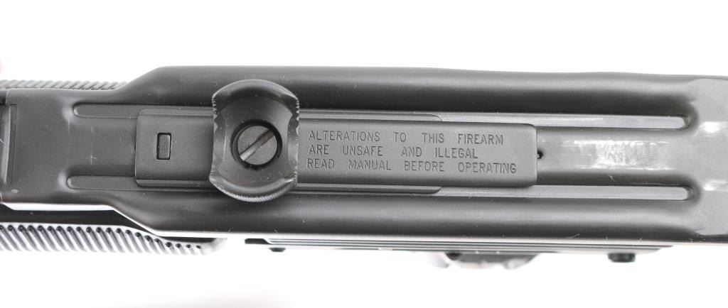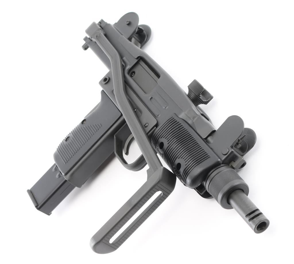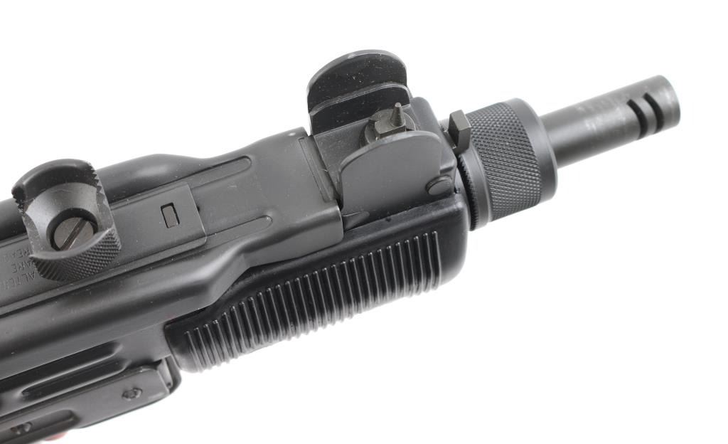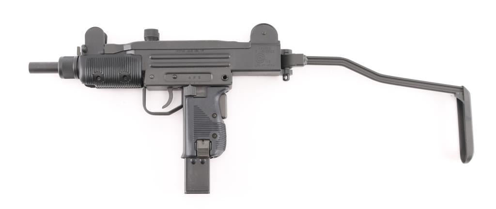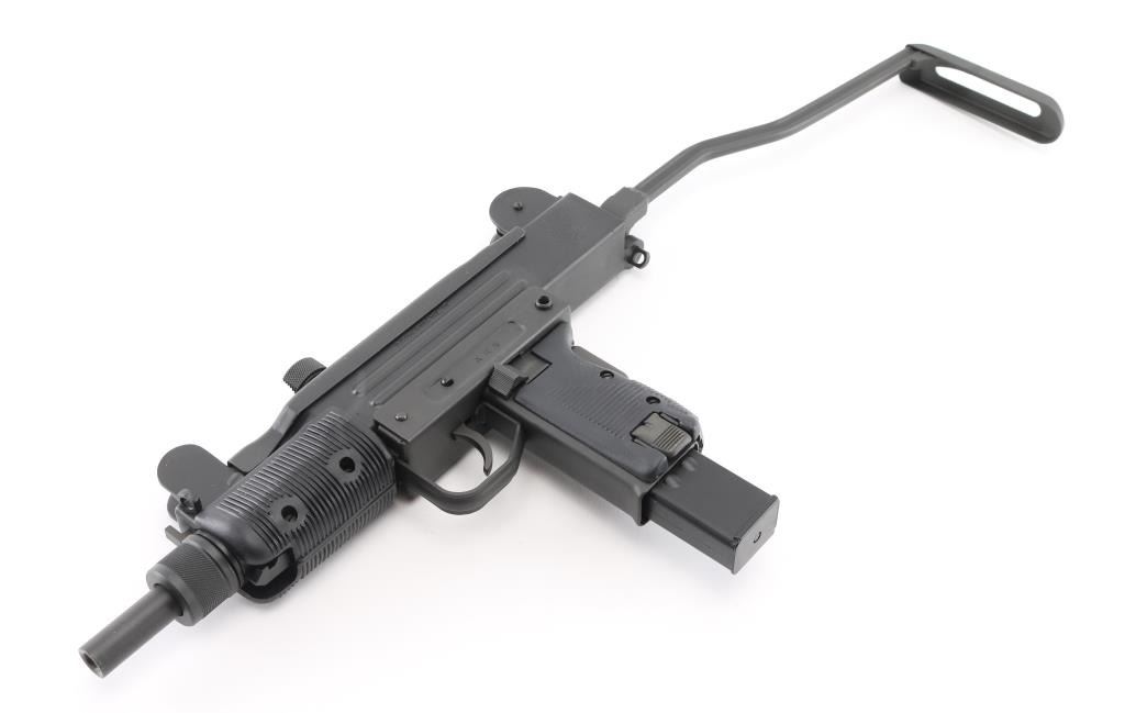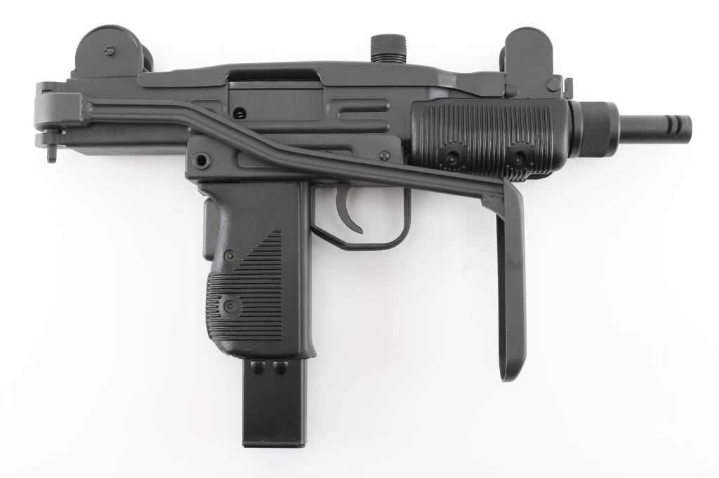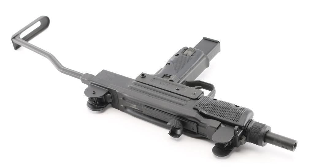Fully transferable select fire 9x19mm machinegun. US made copy of mini Uzi submachinegun, using Vector Arms receiver. This and two others are consecutive numbered, see other lots in this auction. Fires from open bolt in full and semi. Features 7.75" barrel with compensator type cuts at muzzle, dark gray parkerized finish on all metal, black polymer grip and forend panels, bayonet lug, grip safety, sling eyelets, elevation adjustable protected post front sight, windage adjustable protected peep rear sight (two selectable ranges), manual safety/selector on left side at top of grip, side folding steel stock Machine gun is in excellent condition overall, with bright bore and few signs of handling or firing. Few minor edge losses, visible thinning and some bare metal where top cover slides on receiver. Includes two excellent condition steel 25 rd magazines. Condition is NRA Excellent ***NFA Firearm*** ***Fully Transferable***