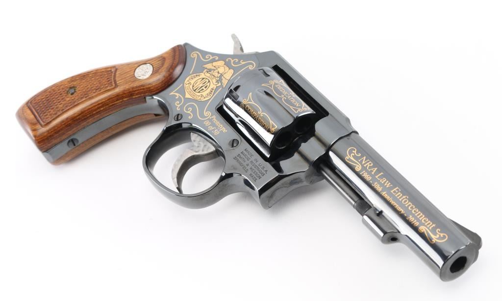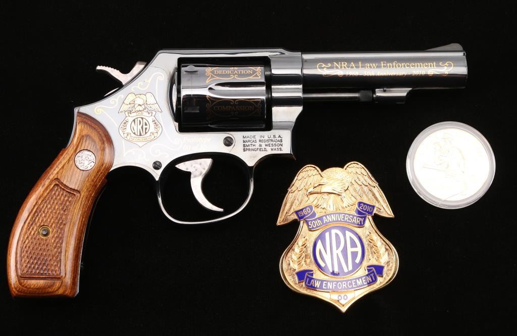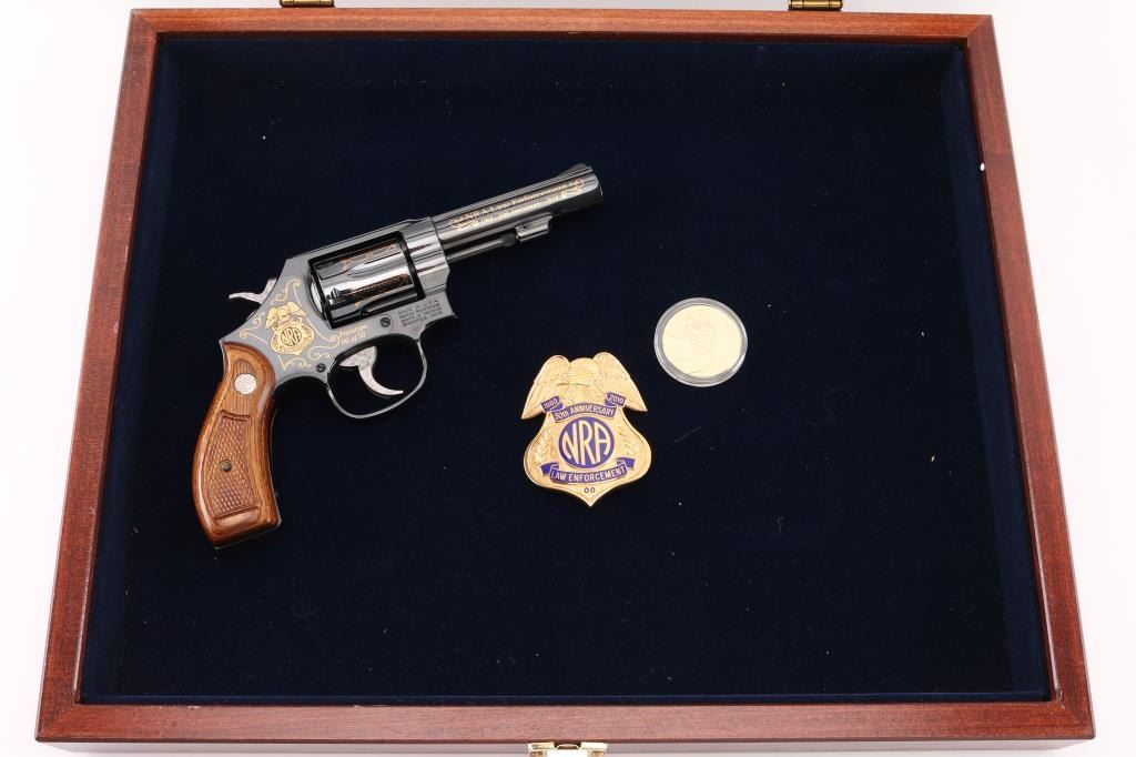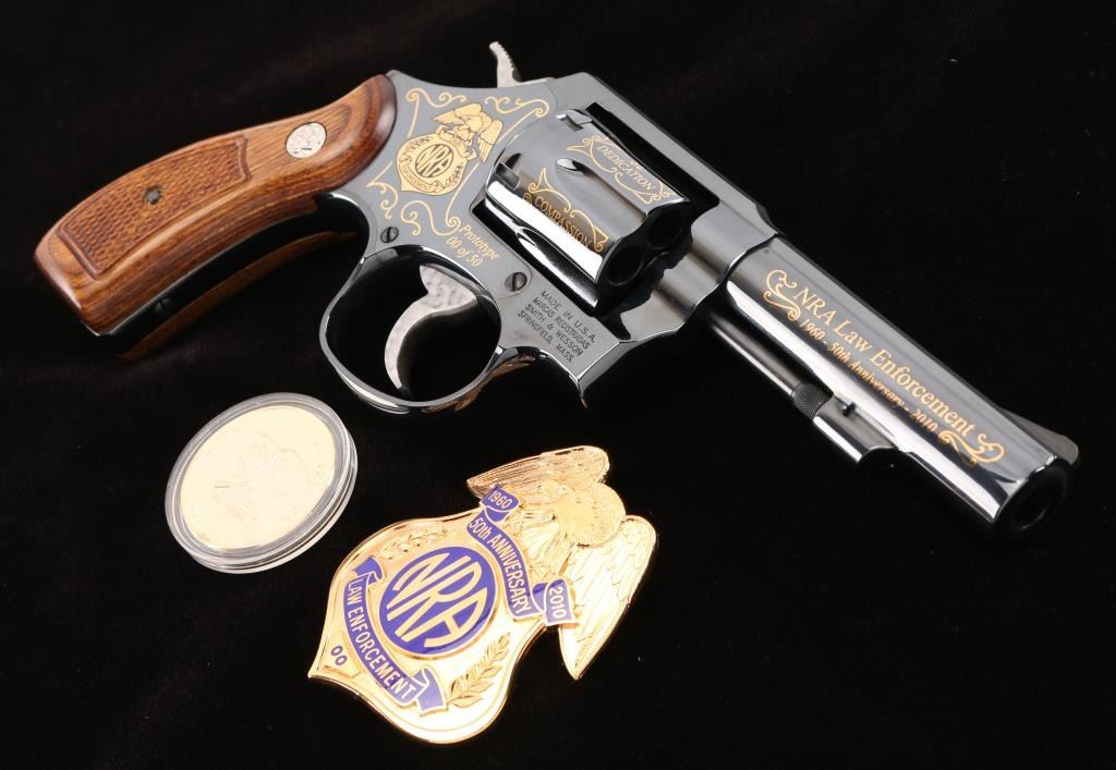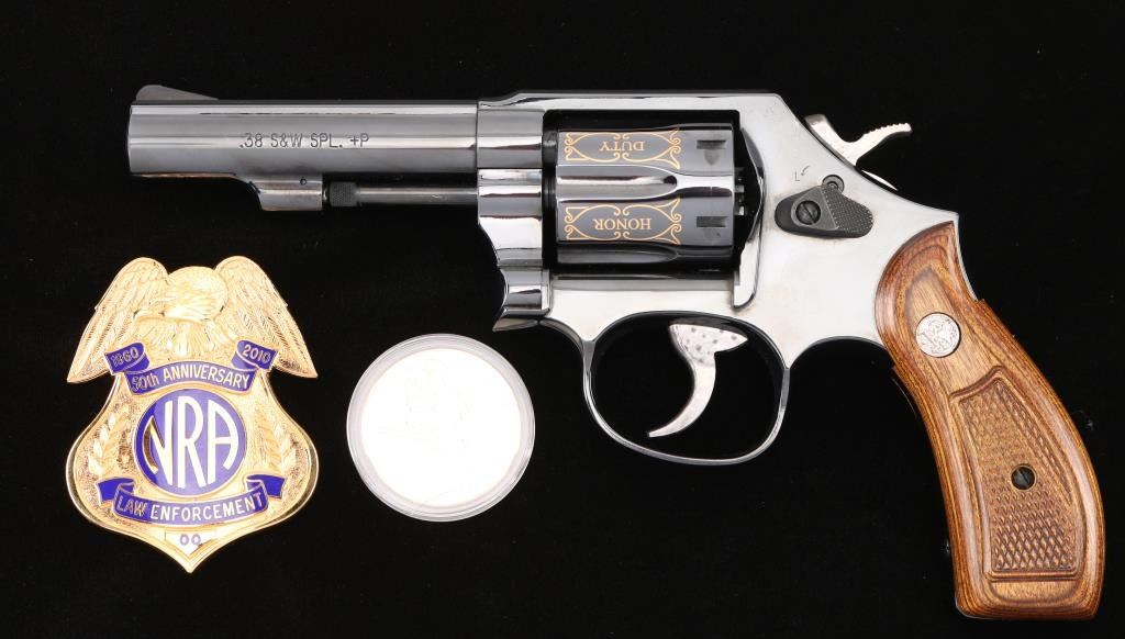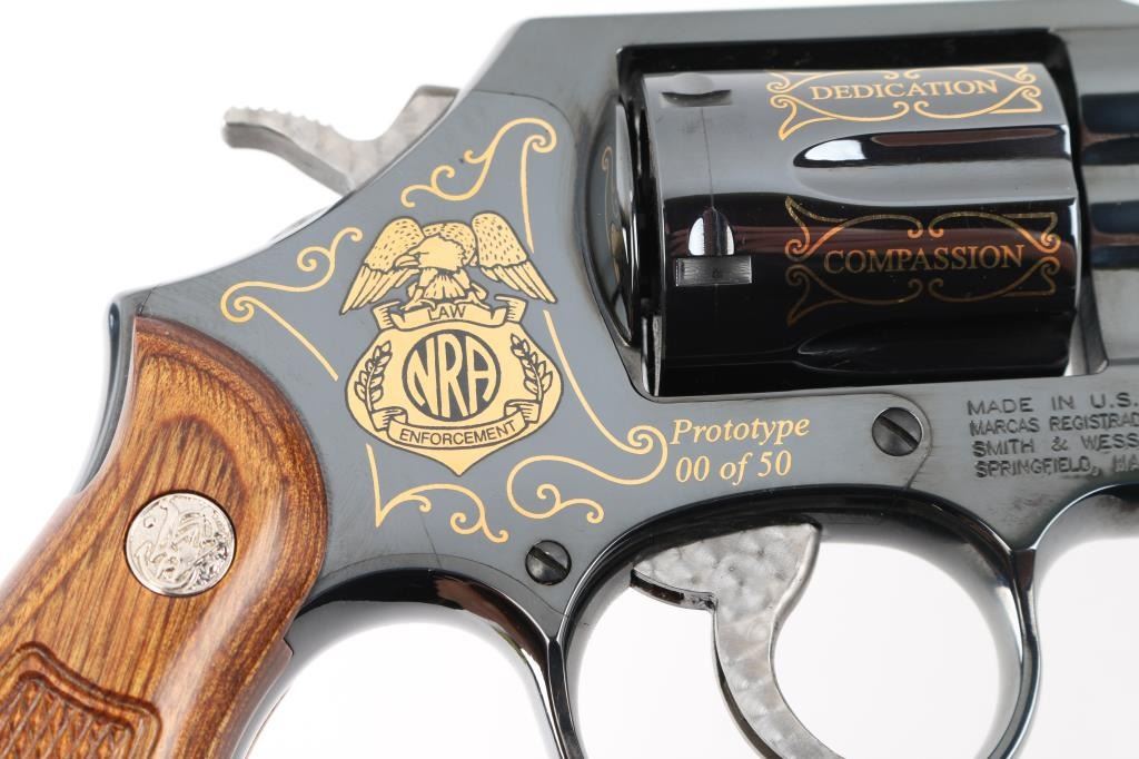 SN: CNE7067. This is a custom S&W model 10-14 (Introduce internal key locking system) built on a round butt K frame. Original design wood grips, 4" barrel with fixed sight. In 2010 the NRA's Law Enforcement Division celebrated 50 years of service, 1960-2010, and issued 50 of these custom revolvers for sale through select Friends of the NRA banquets. Each 0f these 50 revolvers features 24-karat engraving on the barrel, cylinder, and sequential numbers, and came with a matching number NRA LE commemorative badge. The badge is solid brass, enameled, and electroplated in pure 24 karat gold. The high polish revolver has jeweled hammer, and trigger and has the NRA badge surrounded by scroll work on the left frame, along with "00 of 50 Prototype" making the revolver extremely rare, fluted cylinder has scrolled words between the flutes. Honor, Service, Compassion, Dedication, Courage, and Duty" Left barrel reads "NRA Law Enforcement 1960-50th Anniversary-2010" Revolver appears unfired, like new, there is one small scratch on the right frame above the mag release. Badge is unnumbered, like the revolver, excellent condition. Really rare to have the prototype of only 50 revolvers to come out of S%W's custom engraving shop. Comes with a electroplated gold coin NRA one side, and S&W on the other continuing the same theme, a glass topped S&W Custom Engraving display case, and 2 keys for the locking system. NRA Condition-Excellent. Modern Firearm.