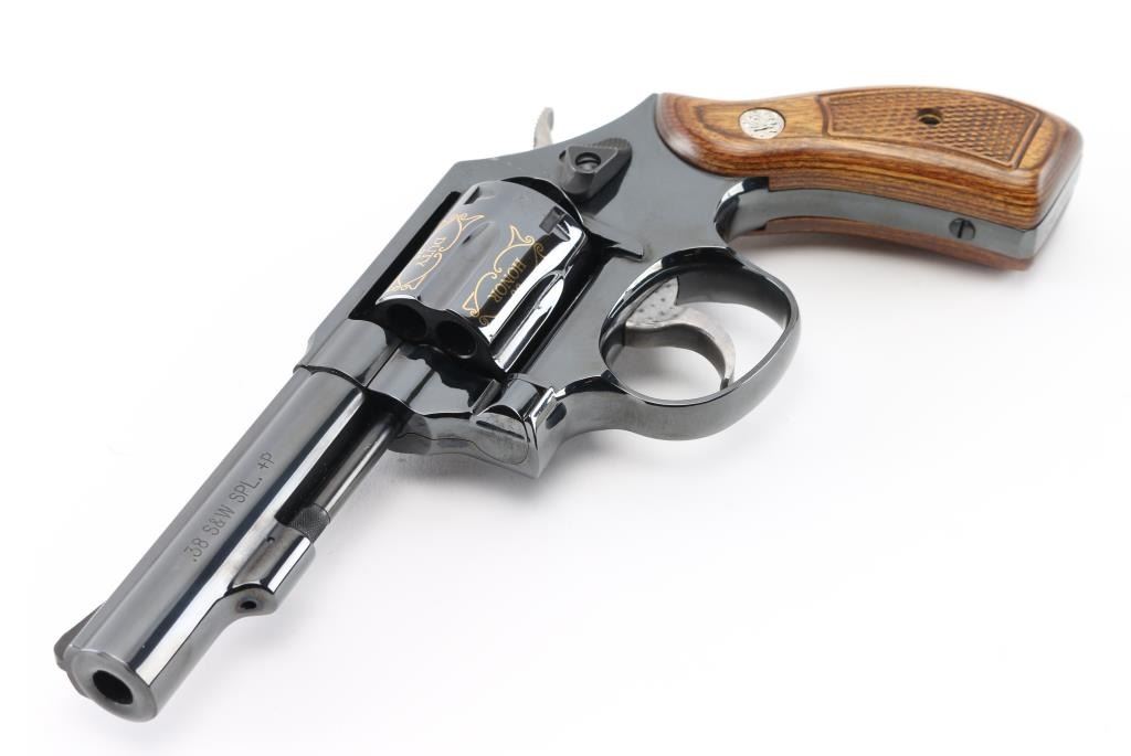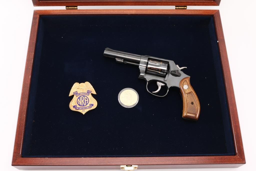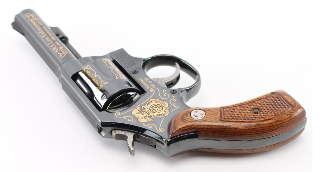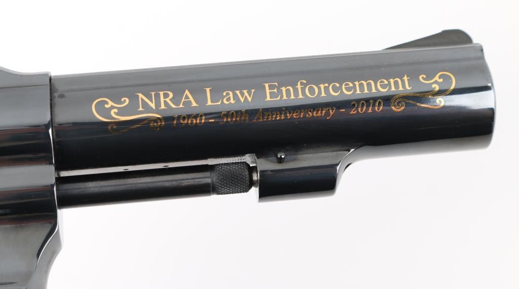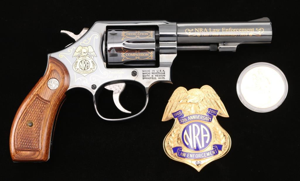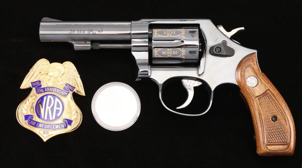 SN: CNE7067. This is a custom S&W model 10-14 (Introduce internal key locking system) built on a round butt K frame. Original design wood grips, 4" barrel with fixed sight. In 2010 the NRA's Law Enforcement Division celebrated 50 years of service, 1960-2010, and issued 50 of these custom revolvers for sale through select Friends of the NRA banquets. Each 0f these 50 revolvers features 24-karat engraving on the barrel, cylinder, and sequential numbers, and came with a matching number NRA LE commemorative badge. The badge is solid brass, enameled, and electroplated in pure 24 karat gold. The high polish revolver has jeweled hammer, and trigger and has the NRA badge surrounded by scroll work on the left frame, along with "00 of 50 Prototype" making the revolver extremely rare, fluted cylinder has scrolled words between the flutes. Honor, Service, Compassion, Dedication, Courage, and Duty" Left barrel reads "NRA Law Enforcement 1960-50th Anniversary-2010" Revolver appears unfired, like new, there is one small scratch on the right frame above the mag release. Badge is unnumbered, like the revolver, excellent condition. Really rare to have the prototype of only 50 revolvers to come out of S%W's custom engraving shop. Comes with a electroplated gold coin NRA one side, and S&W on the other continuing the same theme, a glass topped S&W Custom Engraving display case, and 2 keys for the locking system. NRA Condition-Excellent. Modern Firearm.