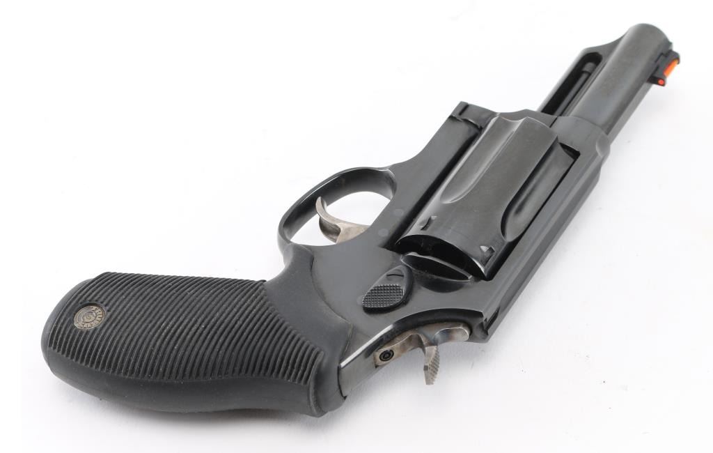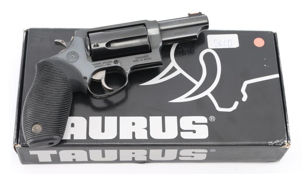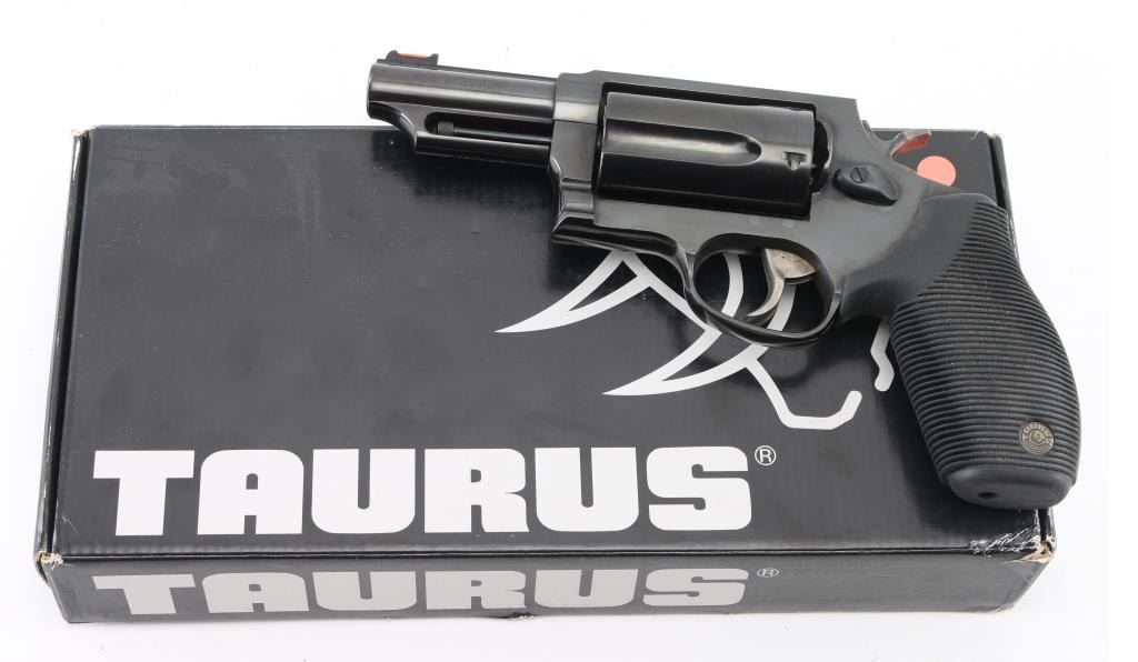 Brazilian made double action revolver chambered for both .45 Colt & .410 bore 2.5" shells. Features blued finish, 3" barrel, orange fiber optic front sight, square channel cut rear sight, shrouded ejector rod, fluted five-shot cylinder, smooth trigger, knurled hammer spur, internal locking safety on the rear of the hammer, transfer bar safety, and one-piece ribbed black rubber grip with Taurus medallions. Bore is very good condition. Retains 95% finish with handling marks. Includes the original factory cardboard box with manual, keys for internal lock, 17 rounds Winchester PDX 410 ammo. Condition is NRA Excellent *** Modern Firearm ***