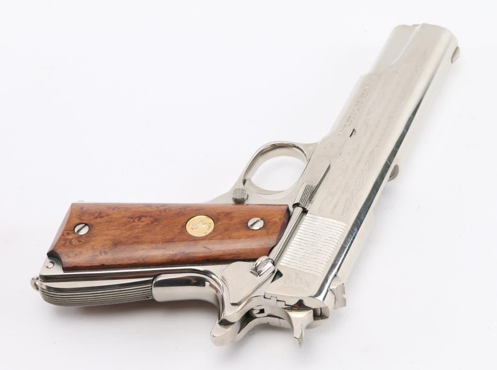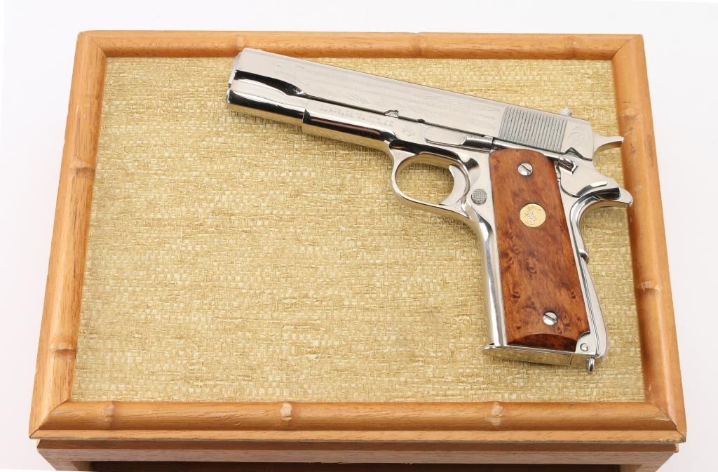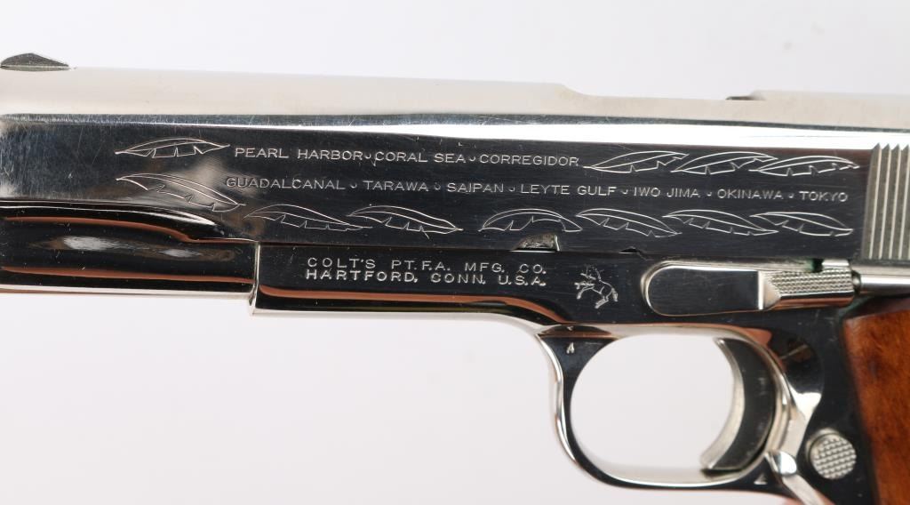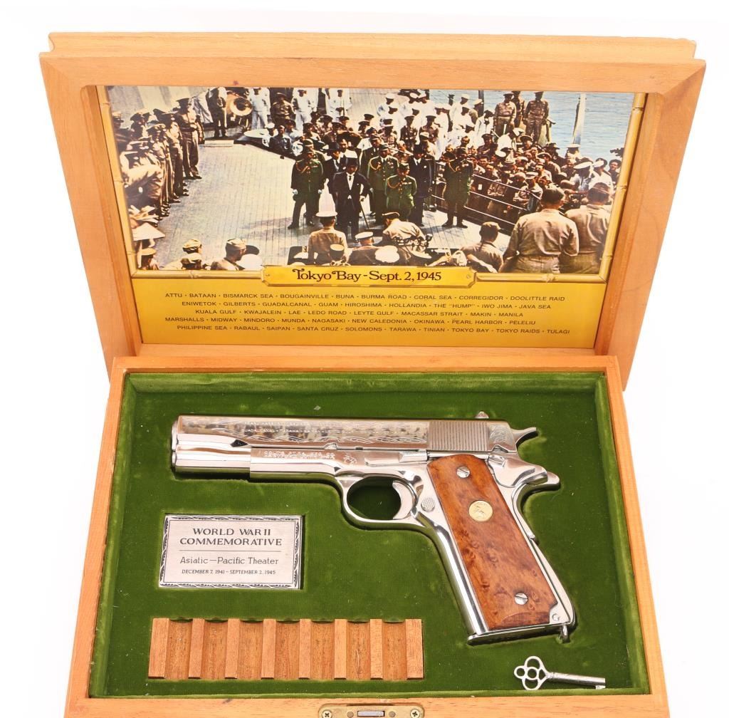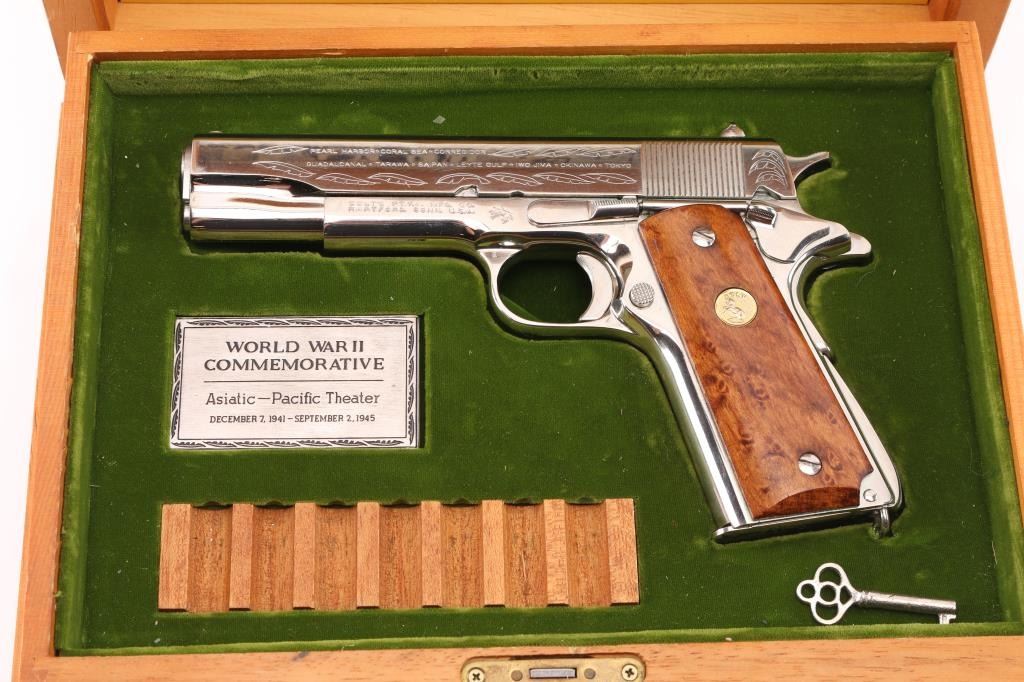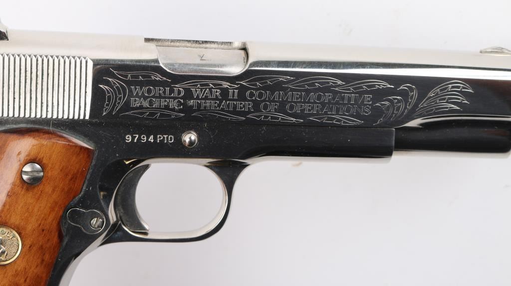 Colt 1911 'Pacific Theater Of Operations - World War II Commemorative' - .45ACP - 5" barrel - One 7rd. mag - The left side of the slide is marked “”Pearl Harbor Coral Sea Corregidor / Guadalcanal Tarawa Saipan Leyte Iwo Jima Okinawa Tokyo”. There are feather motifs on both sides. The right side of the slide is marked “World War II Commemorative / Pacific Theater Of Operations”. Comes in a display case with small metal plaque and a place for seven rounds of .45 ACP. Bore looks great. Metal finish looks great. The wood grips with gold Colt medallions look great. this gun shows little to no signs of use or handling. Condition is NRA Near Perfect **Modern Firearm**