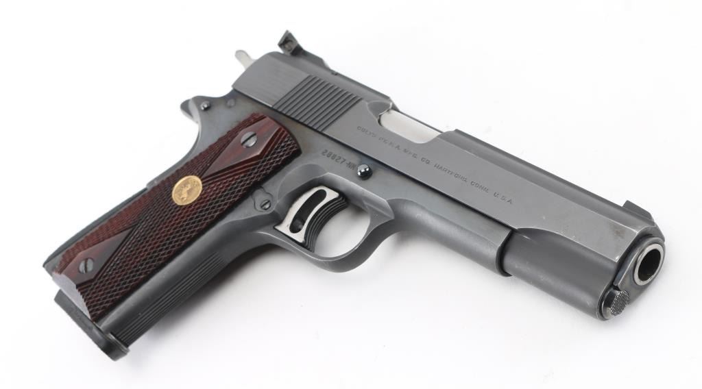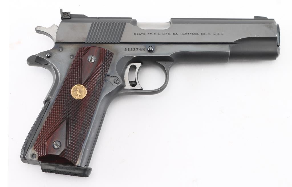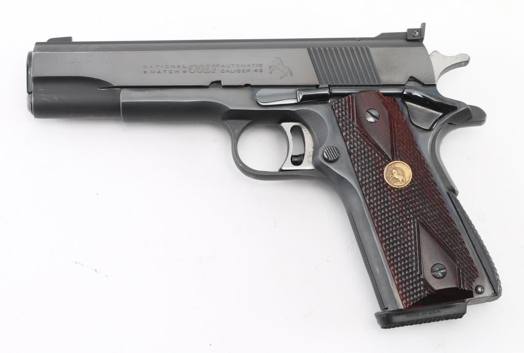 'Pre-Series 70' Desirable, vintage high quality 1911A1 style semi-automatic pistol chambered in .45 Auto, built for National Match competition style shooting circa 1968. Features a re-blued finish with polished flats, 5" N.M. barrel, patridge front sight, Elliason fully-adjustable rear sight, wide serrated trigger with overtravel adjustment, serrated hammer spur, thumb safety, grip safety, push button magazine release, unmarked 7 round magazine with Pachmayr base pad, serrated front strap, checkered arched mainspring housing and two-piece checkered walnut grips with gold Colt medallions. Bore is very good. Retains 95% reblue with some scratches & edge losses, slight changes to original contours from buffing. Markings show slight dishing or thinning. Grips are excellent. Condition is NRA Very Good++ (as refinished) *** C&R Firearm ***