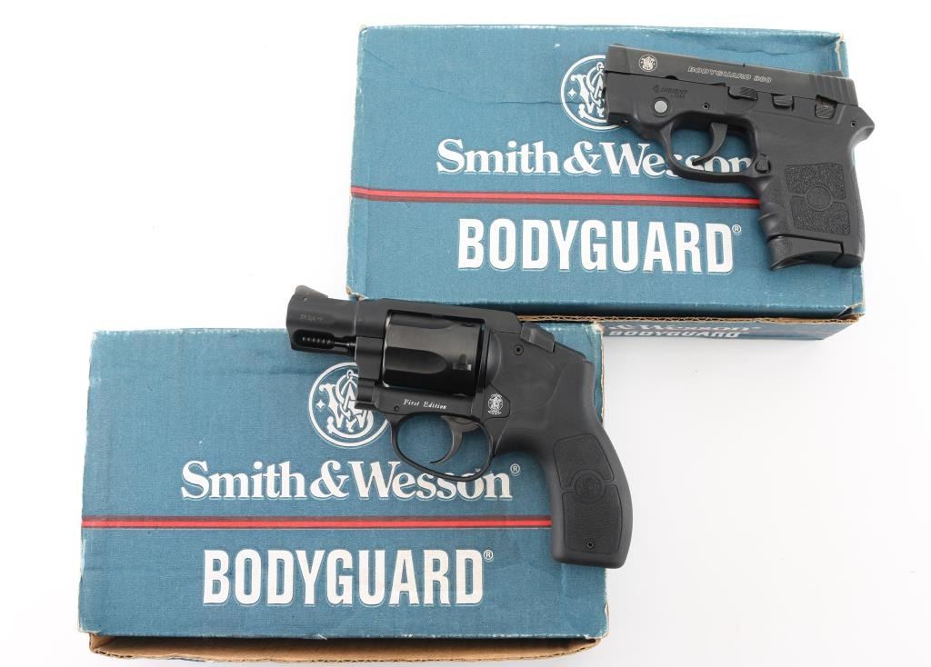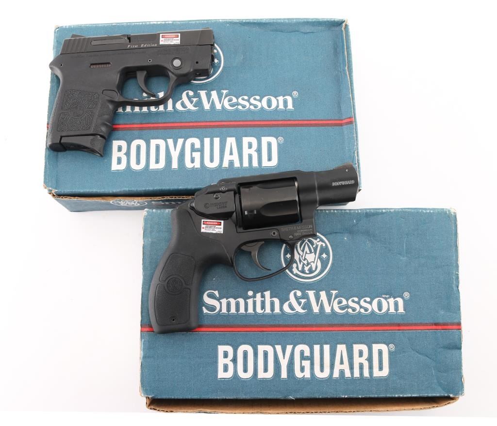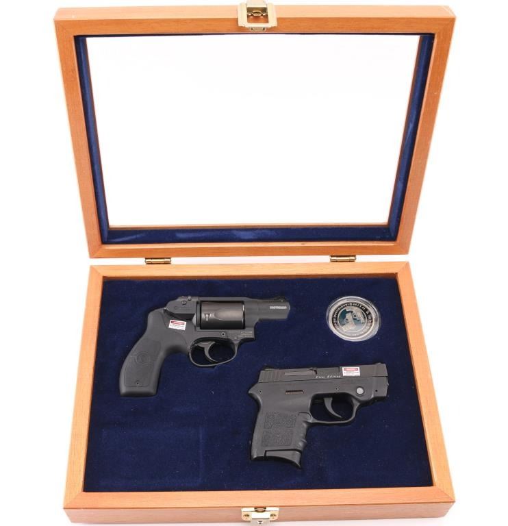 Sn:RBG0397/CBG0397 Made in America this two gun set was released to commemorate the Smith & Wesson Bodyguard series in 2010. The pistol and revolver come with a wooden, glass topped, felt lined display case and commemorative coin. The glass is laser etched with the wording “Smith & Wesson Bodyguard First Edition, One of 2,000.” Both the Bodyguard 380 pistol and 38 revolver are laser engraved with the wording “First Edition” across the firearm. On the semi-automatic pistol, the “First Edition” appears on the right side of the slide in white engraved lettering. On the revolver, the wording has been placed above the trigger guard on the left side of the frame. Both firearms have "0397" serial numbers and come with Insight Laser sights. Both guns have a black finish. The revolver is chambered for .38 Special ammuntion, has a 2" barrel, integral sights in an alloy frame, a 5 shot fluted cylinder with top release, hidden hammer, smooth trigger and rubber grip. The semi-auto pistol is chambered for .380 ACP ammunition, has a 2.5" barrel, dovetailed front and rear sights in a stainless slide, hidden hammer, smooth trigger, thumb safety and textured finger groove grip in the polymer frame. The finish on both guns looks great. The bores look very good. There are a few scuffs on the lid of the wooden presentation case. Very nice and very collectable. Both guns come with original Smith & Wesson blue cardboard boxes, owners manuals, factory fired brass cases and black soft sided range bag cases embroidered with the S&W logo and "First Edition" in white stitching. The .380 also comes with an extra factory magazine and two flat floor plates. Condition is NRA Excellent *Modern Firearm*