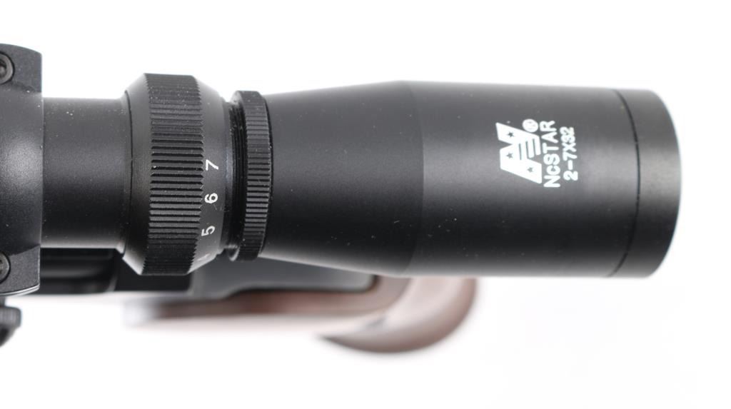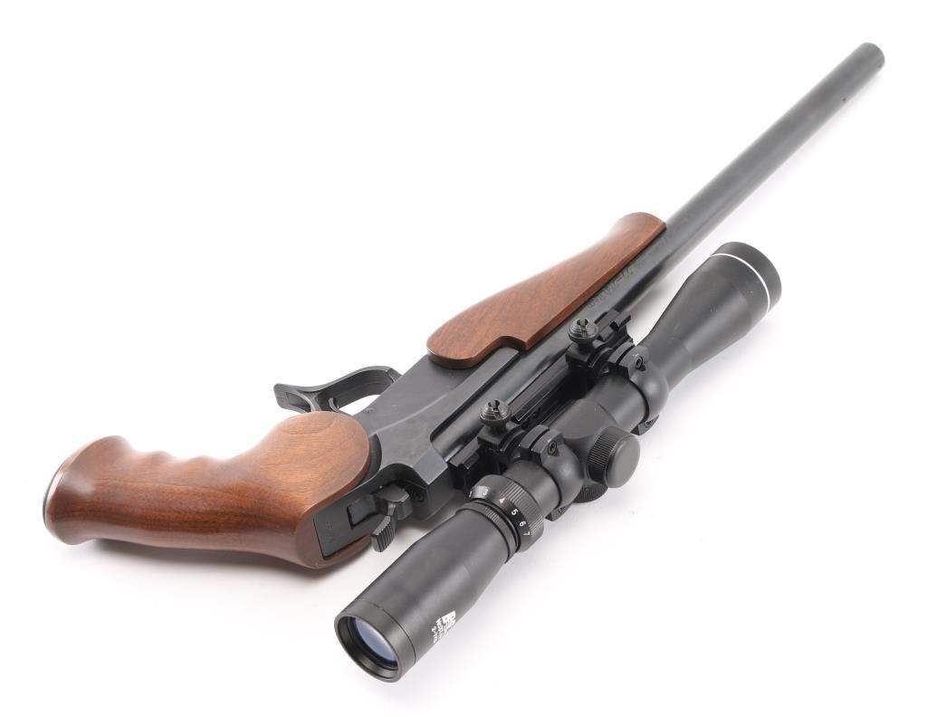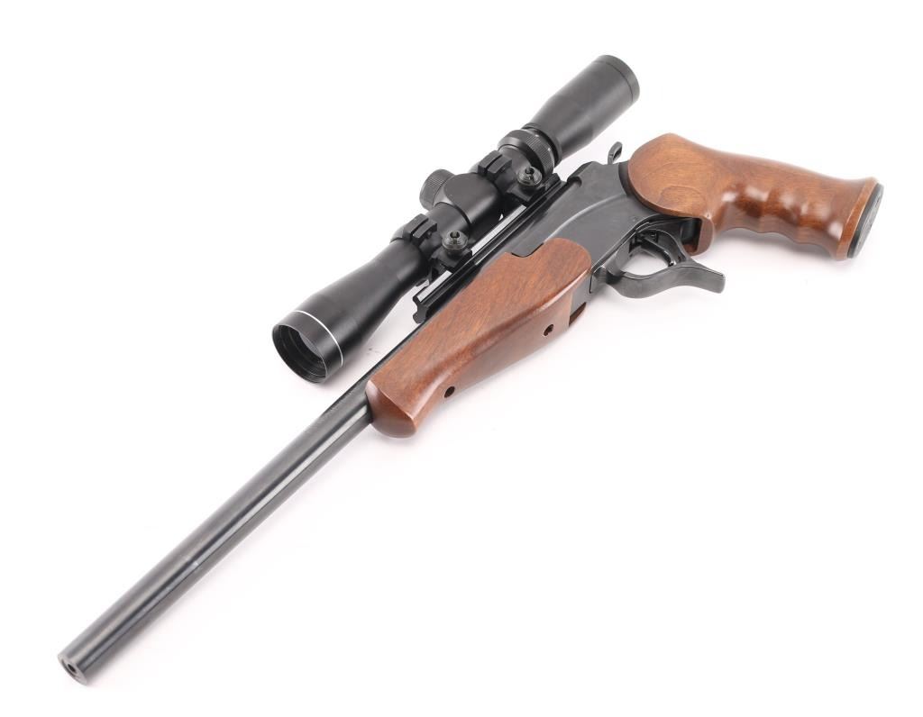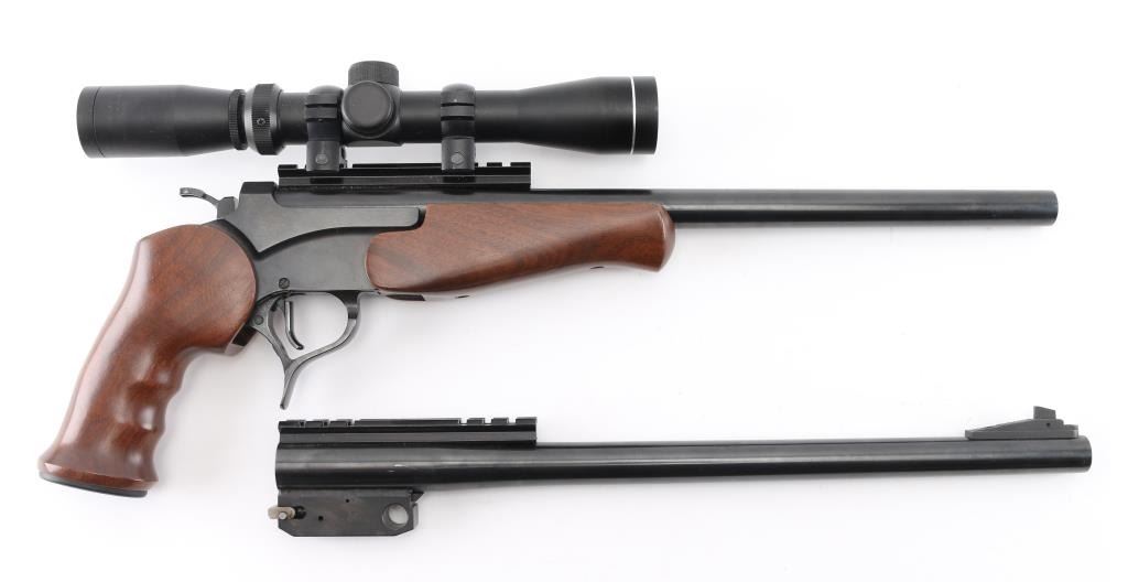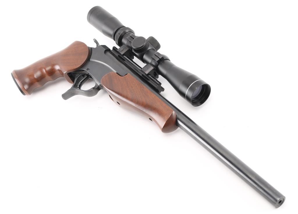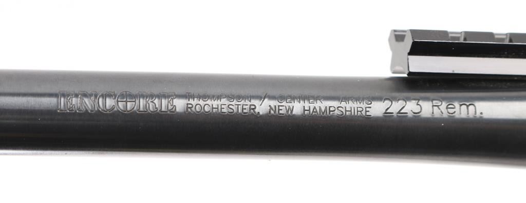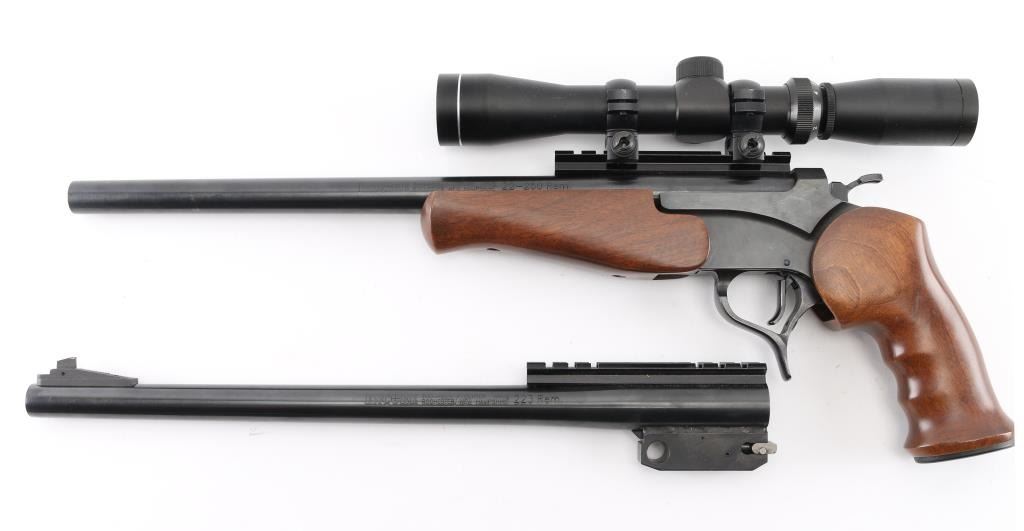 Single shot break open pistol with modular design allowing for easy barrel changes. Features blued finish, smooth walnut forend, contoured grips, 15" barrel drilled/tapped for sights. Mounted with a NcSTAR 2-7x32 scope, clear optics , opening lever forms trigger guard. Bore is excellent/bright. Retains 99% blue, Stocks are fine condition. Comes with extra 15" Encore barrel chambered in .223 Rem .Ramped front blade, and scope rail. Bore and finish are excellent. Condition is NRA Excellent. Modern Firearm