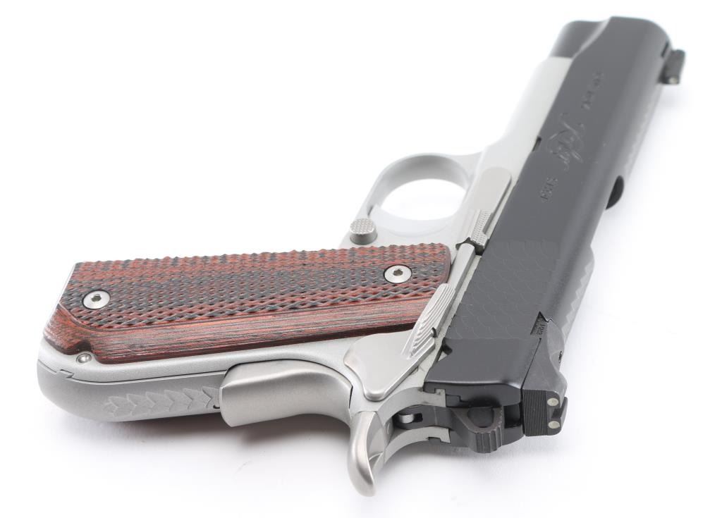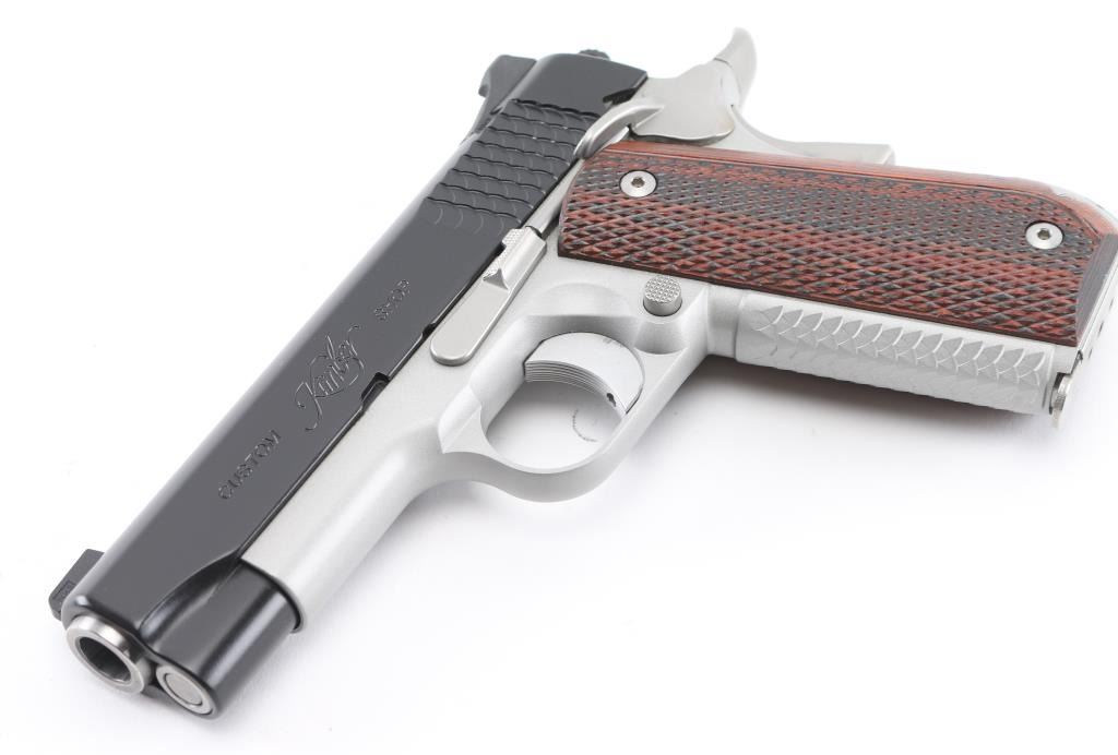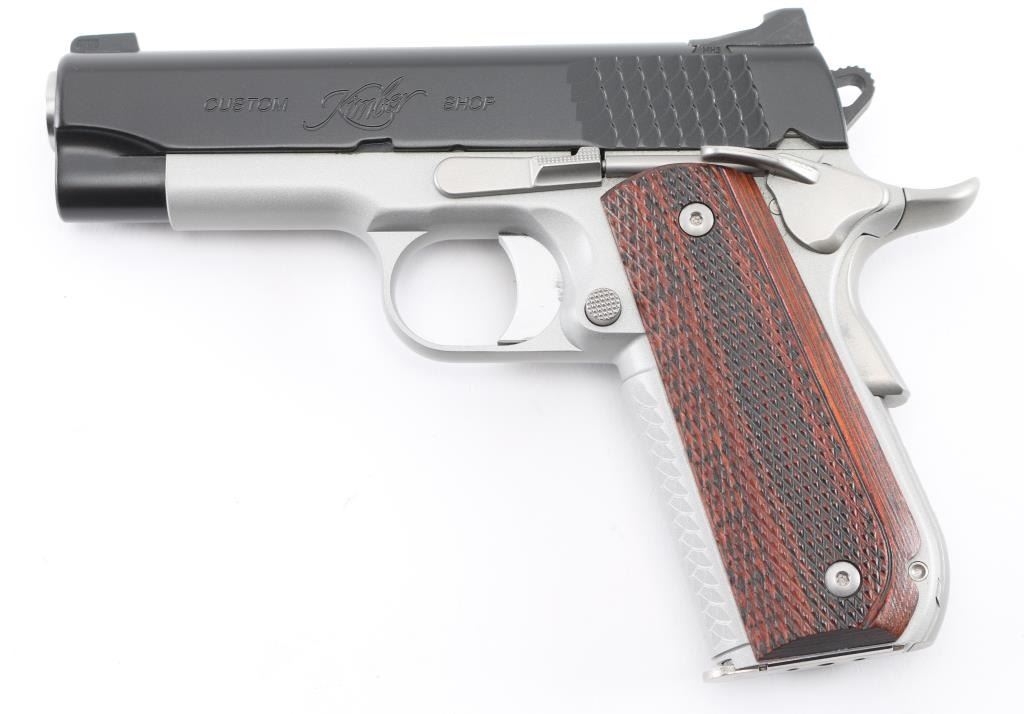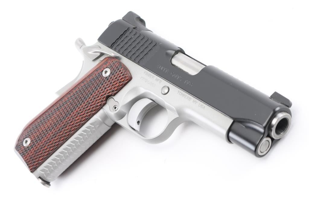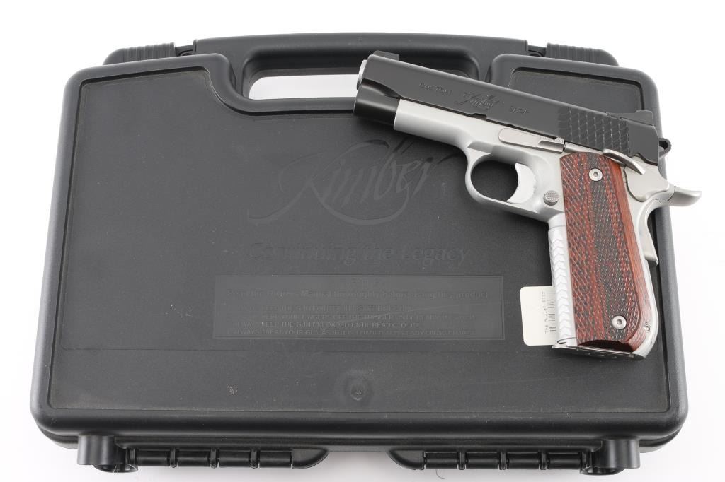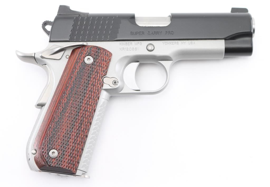 American made semi-auto, two-tone 1911 style pistol chambered for .45 ACP ammunition. The Super Carry Pro™ from Kimber's Custom Shop has a 4" bushingless barrel and full length grip. Custom Shop features include a round heel frame that is comfortable to carry and does not snag clothing, night sights with cocking shoulder for one-hand operation and Carry Melt treatment for rounded and blended edges. Special unidirectional serrations on the frame combine with checkered grip panels, and a similar pattern on the slide speeds reloading. Ambidextrous thumb safety, match grade trigger group, bumped grip safety and recessed slide stop pin provide finishing touches along with an 8 round factory magazine. Metal finish looks great with little to no signs of handling. Bore looks great, a little dusty. Grips are fine. Gun looks like new. Comes with original hard case, owners manual and lock. Condition is NRA Excellent. *Modern Firearm*