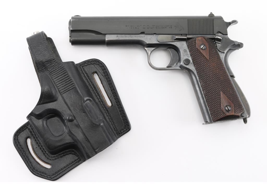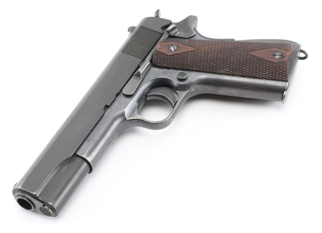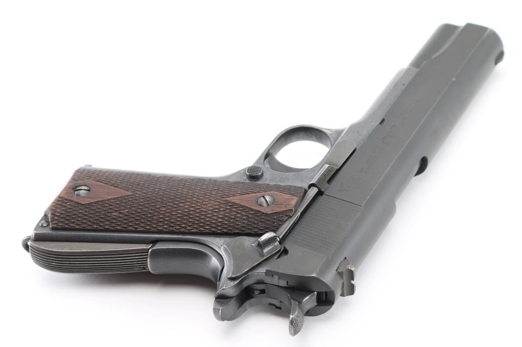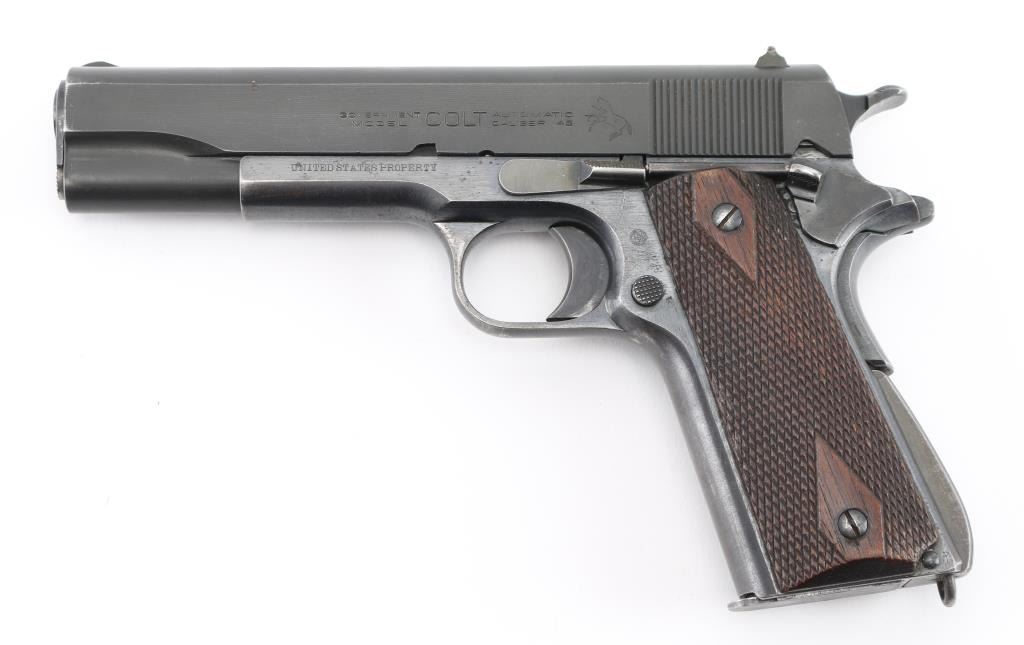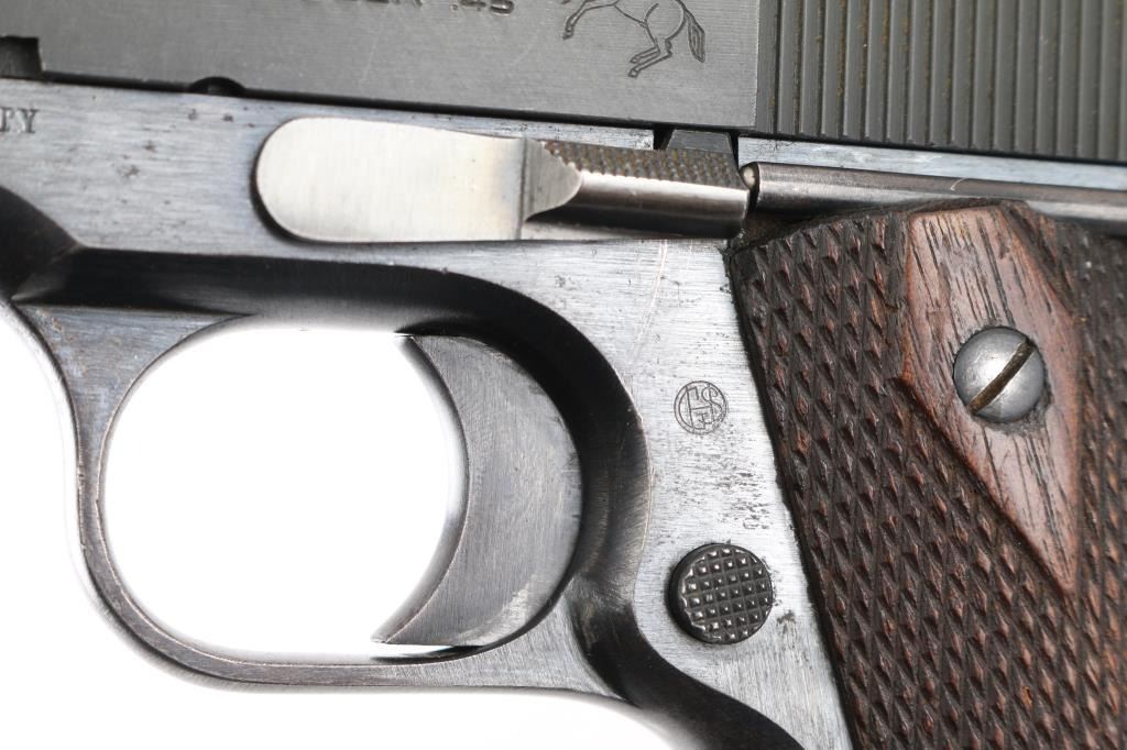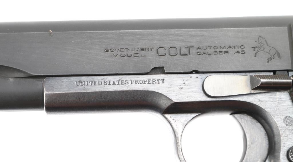 Semi-Automatic. U.S. Military Issued sidearm. Manufactured 1917. "GHS" in circle inspectors mark above magazine release. (Major Gilbert H. Stewart). left frame stamped "United States Property". The original slide and barrel have been replaced, the slide is for a Government model. Serrated raised mainspring housing (1911A1). Grip safety. Blued finish. Brown checkered wood "Diamond" grips. Bore is excellent/bright. Grips are very good with some minor chips. Action is crisp/tight. Blued finish is about 90% with edge wear/minor scratches. Handling loss to the mainspring housing and fore grip. Comes with one 8-rd two-tone magazine. Comes with JBP black leather holster. NRA Condition-Very Good/Replaced Parts. C&R Firearm.