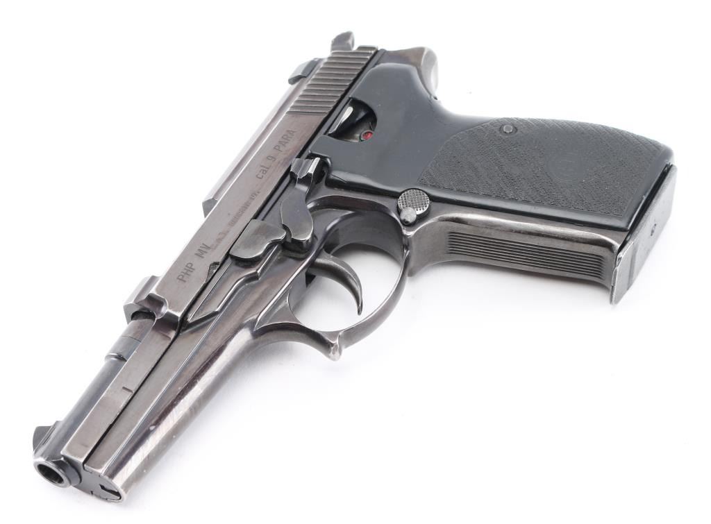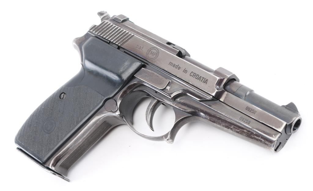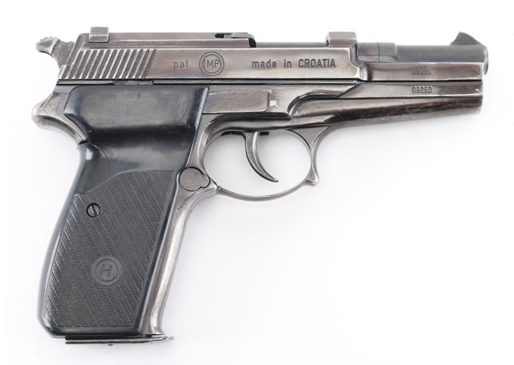 ‘Prvi Hrvatski Pistolj, First Croatian Pistol’ Double action semi-automatic service pistol chambered in 9x19mm. Manufactured in Croatia by IMP (IM Metal) circa 1994-1995 and imported by C.A.I. of Georgia, V.T. with import mark on the left side of the frame. Features a blued finish, 4” barrel, dovetailed blade front sight, square notch rear sight, smooth curved trigger, serrated hammer spur, thumb safety on the left side of the frame, push button magazine release, 15 round magazine, steel frame with serrated front strap and textured black polymer grips. Pistol retains approximately 85% of its blued finish showing edge wear, scattered scratches, finish loss on the grip frame and the slide turned plum. Action is sound, the bore is excellent and the polymer grips are good with wear & cracks. Condition is NRA Good ***Modern Firearm***