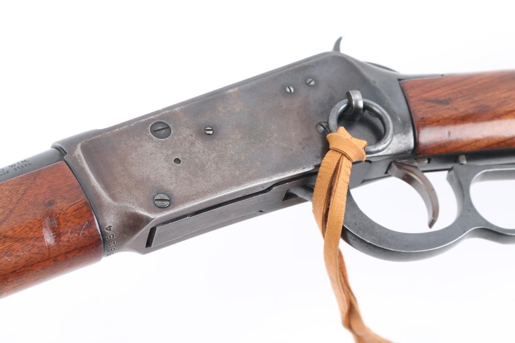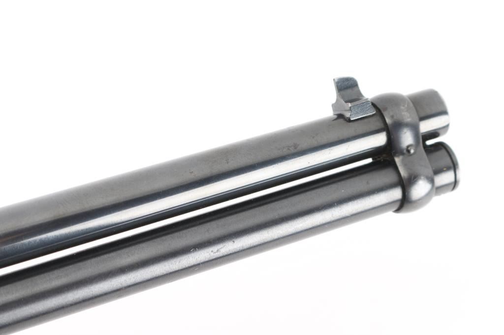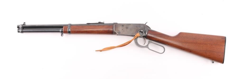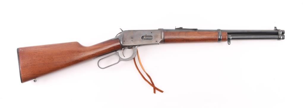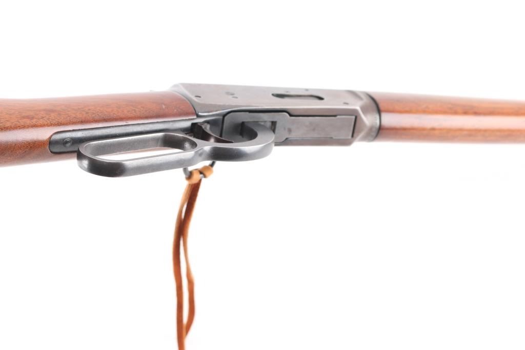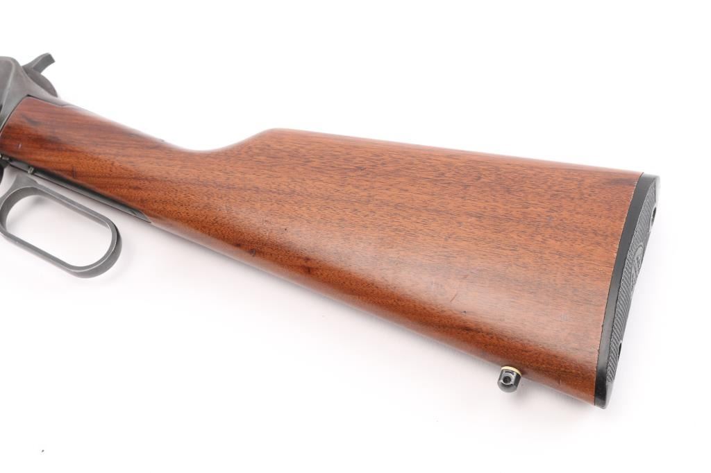 SRC 'Saddle Ring Carbine' Vintage lever action repeating rifle, manufactured in New Haven, CT circa 1981. Features a blued finish, 20" tapered barrel, full-length tube magazine, blade front sight, sporting rear sight, smooth trigger, serrated hammer spur, steel receiver, sling studs, two barrel bands, saddle ring, lever grip safety, smooth walnut forend and straight grip shoulder stock with checkered black plastic buttplate. Bore is very good condition. Retains 60% finish, with moderate to heavy losses on receiver & tang, much dark original blue on barrel and mag tube. Receiver sides show some bare metal, much mottled brown or plum color with slightly scaly texture from patina or light pitting, with dark bluing retained in rear scallops. Wood is very good condition, lightly sanded & refinished, with dents, some wood loss around tang. Condition is NRA Good++ *** Modern Firearm ***