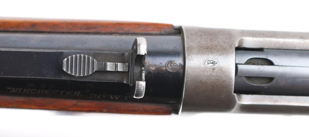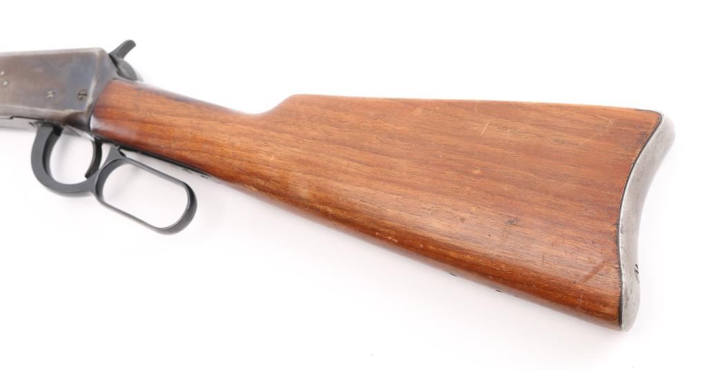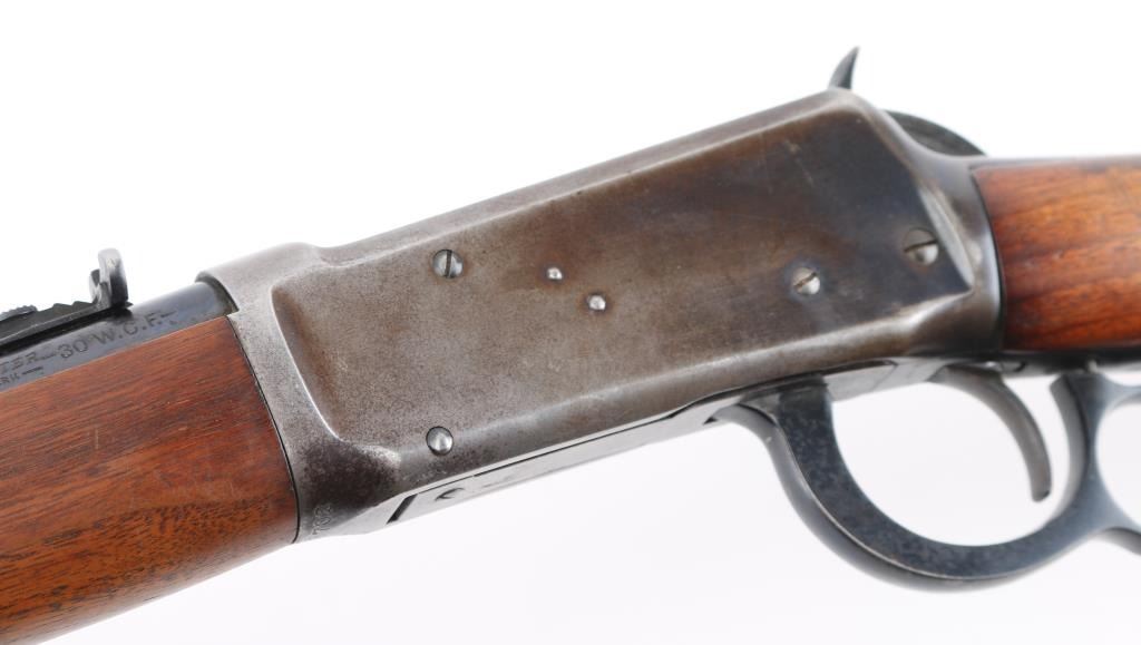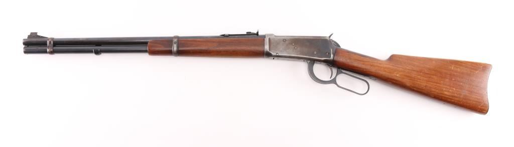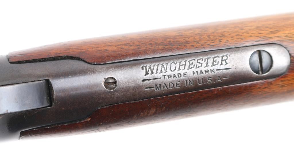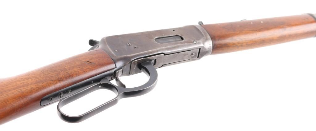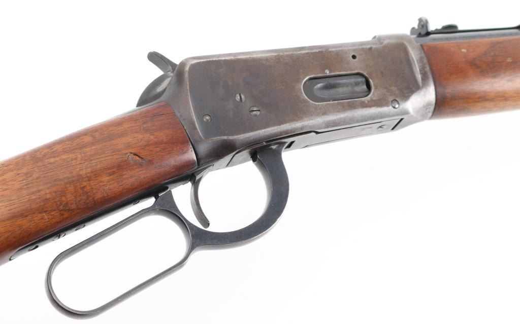 SN: 1118702. 'Pre-64 Eastern Carbine' Vintage lever action repeating rifle chambered in .32 Winchester Special, manufactured in New Haven, CT circa 1939. Features a blued finish, 20" tapered barrel, full-length tube magazine with fitting for sling swivel studs, ramped blade/brass bead front sight, sporting rear sight, smooth trigger, serrated hammer spur, steel receiver, two barrel bands, smooth walnut forend and straight grip shoulder stock with carbine metal buttplate, two small holes in buttstock for sling swivels. Bore is very good condition. Retains 70% finish with edge losses, handling marks, scratches, a lot of handling loss on the receiver. Wood is very good condition with dents, some losses to varnish finish. Condition is NRA Good. C&R Firearm.