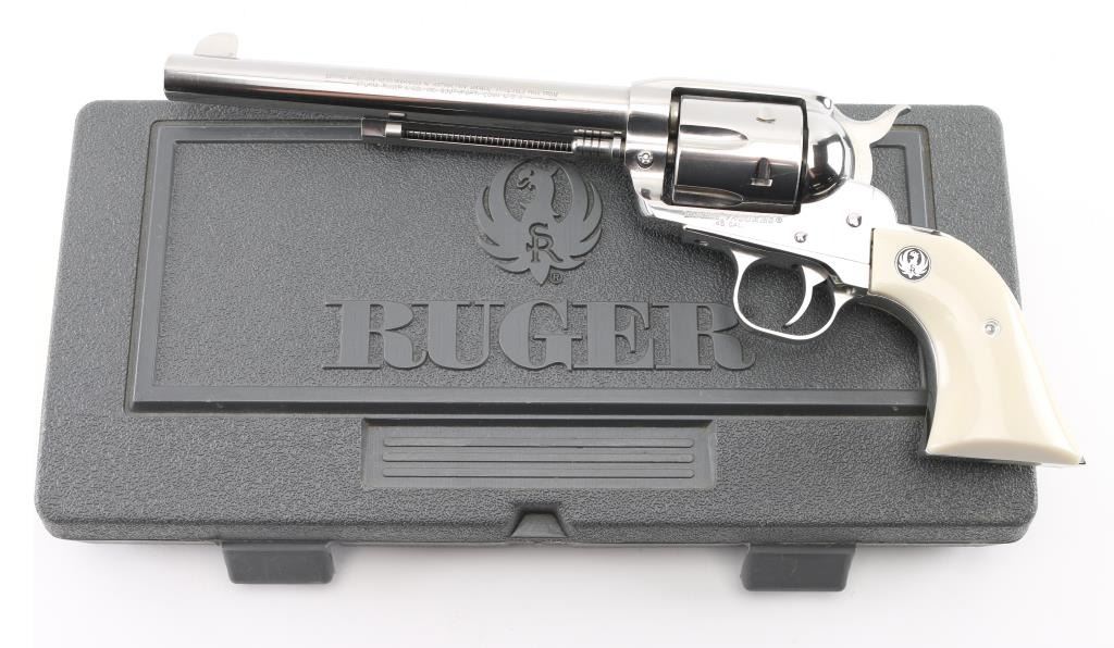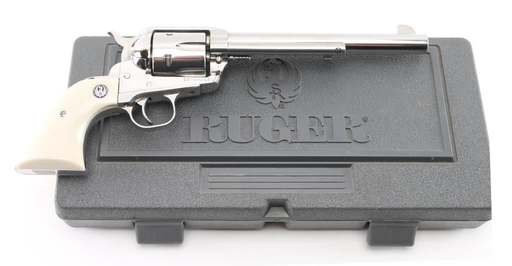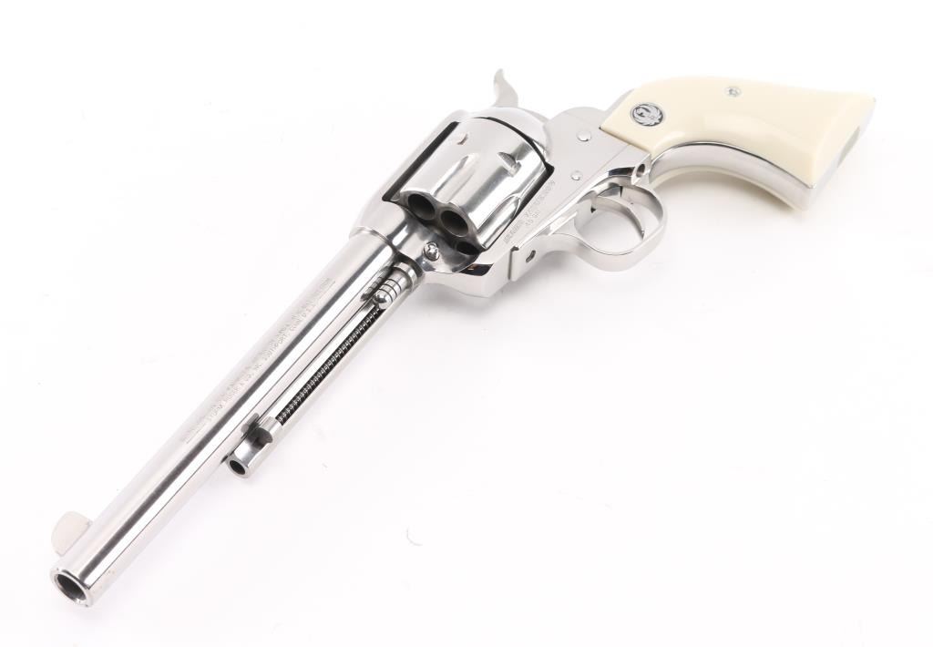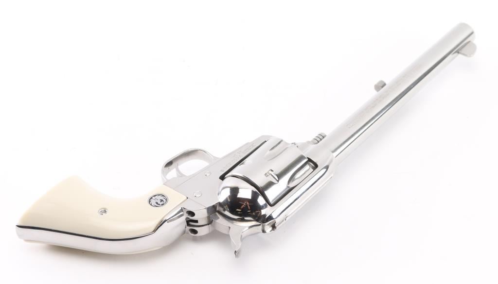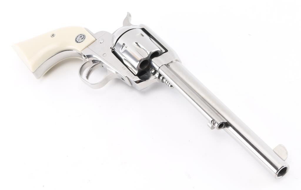 American made single action, 6 shot, revolver chambered for .45 Colt ammunition circa 2019. It features a 7.5" stainless steel barrel, frame and fluted cylinder. It has a blade front sight, integral rear sight, smooth stainless trigger and hammer with serrated hammer spur. It has two piece simulated ivory grips with Ruger medallions. The Metal finish looks great with a drag line on the cylinder so faint you have to strive to see it.. Grips look great. Bore looks great, bright. Action is crisp/tight. Gun looks like new. Comes with original hard case, owners manual, and lock. Condition is NRA Excellent Modern Firearm.