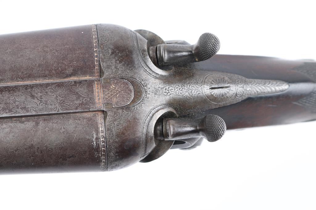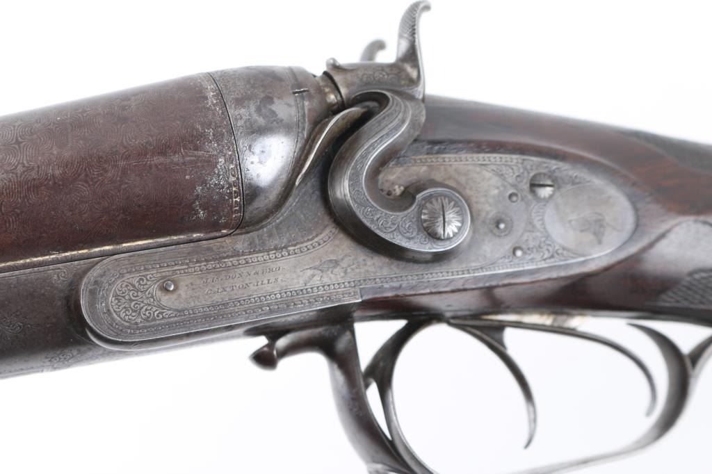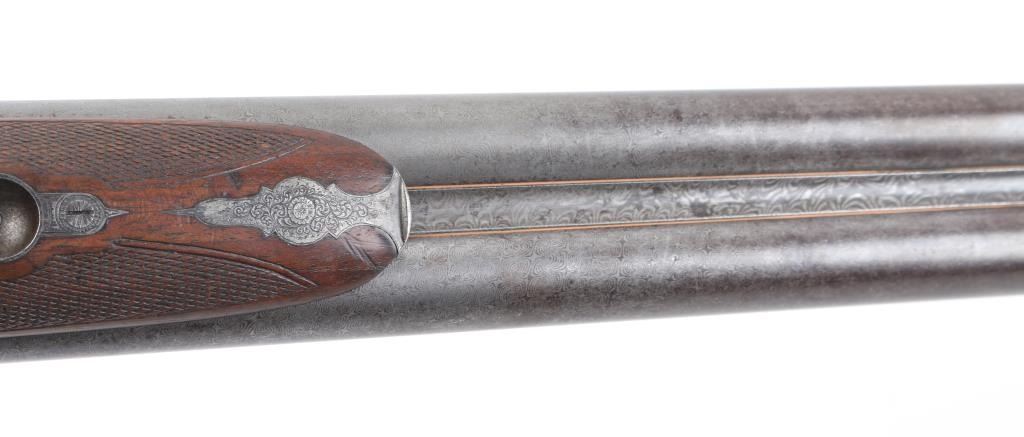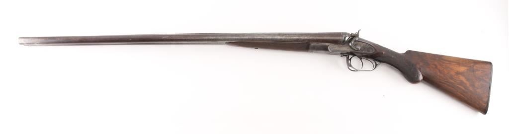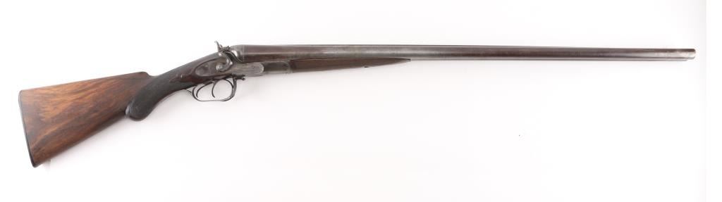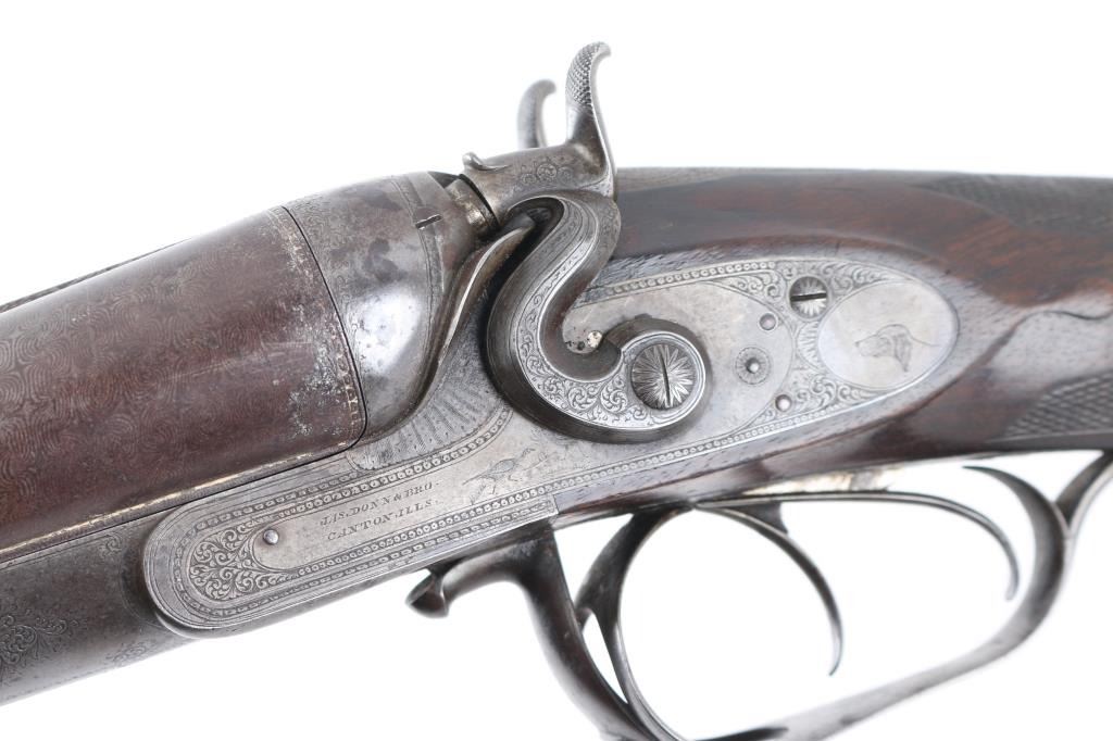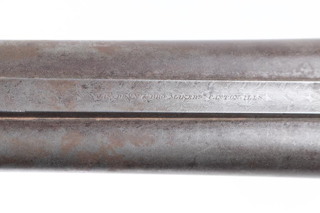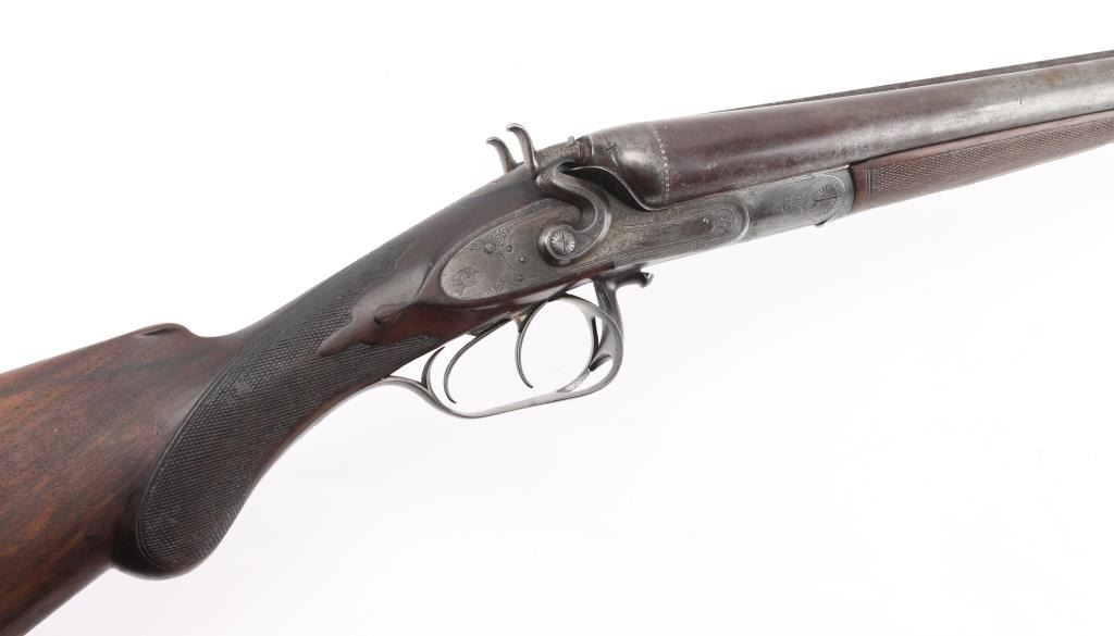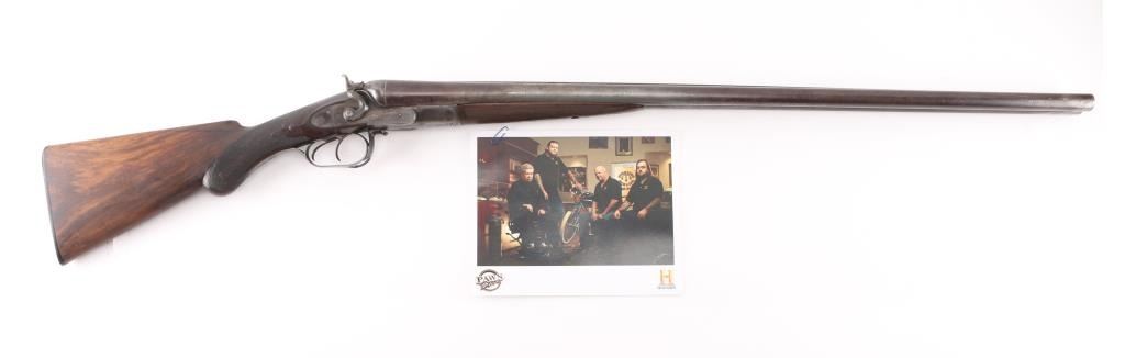 James Donn & Bros., Canton, Illinois, (1859-1886) High quality Side-by-Side exposed hammer Shotgun, 10 ga., 34'' Damascus barrels with 1/2'' concave rib, maker marked, front silver bead, open chokes and extractor; case colored receiver has double triggers and fancy scroll engraving; locks engraved with pointer, and pheasant "Jas. Donnn & Bro Canton,Ills.", serpentine hammers with tall spurs in the style of Purdey. Checkered walnut stock and forend, Prince of Wales grips and horn buttplate. break action is an under lever incorporated into the triggerguard. Both barrels are proofed under the forearm with crossed pistols under a crown (?)., he was known to import barrels. James Donn, who was born in Lake County, Illinois, in 1839, started his lifelong gun making career.. Mechanically the shotgun is excellent, wood is near excellent with sharp checkering, a few minor scratches/dings, engravings and markings are crisp/clear, barrels finish has turned a molted gray/brown patina, bores are good with scattered light pitting. Consignor purchased this gun from Gold & Silver Pawn shop in Las Vegas in 2016 for $2,811.90, paperwork included along with photos of the cast of the show "Pawn Stars". A rare shotgun. NRA Condition-Very Good as Antique Firearm.