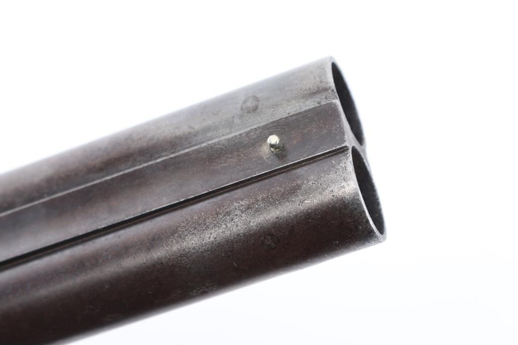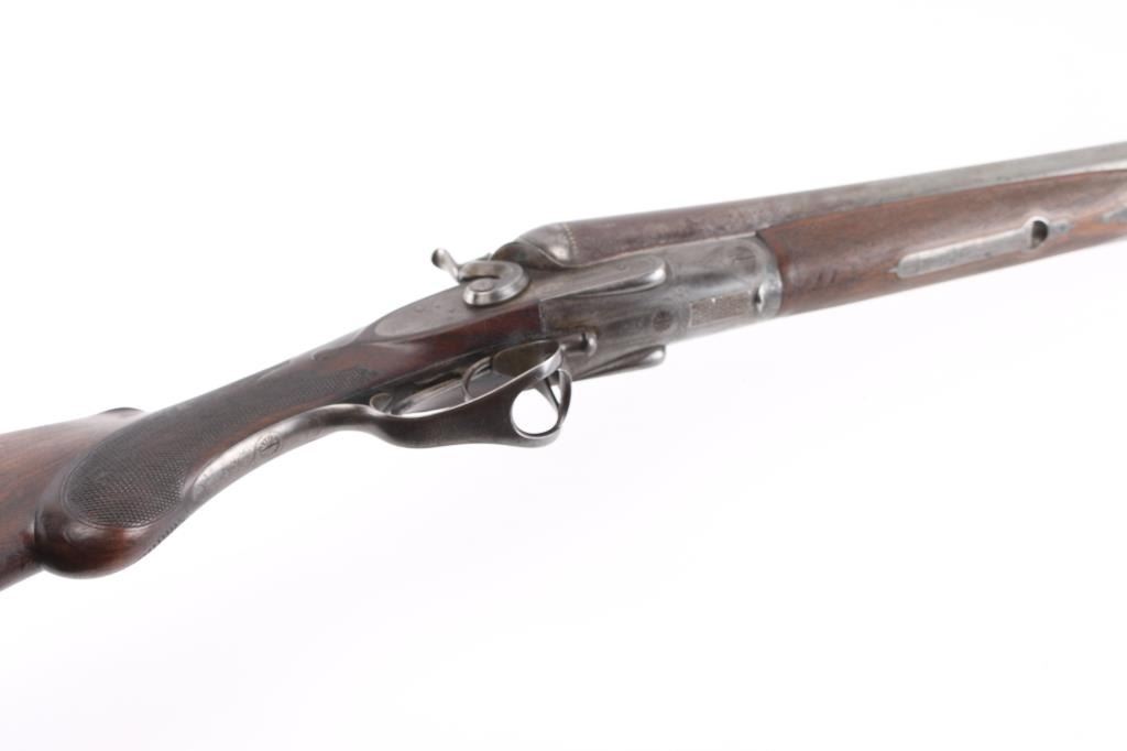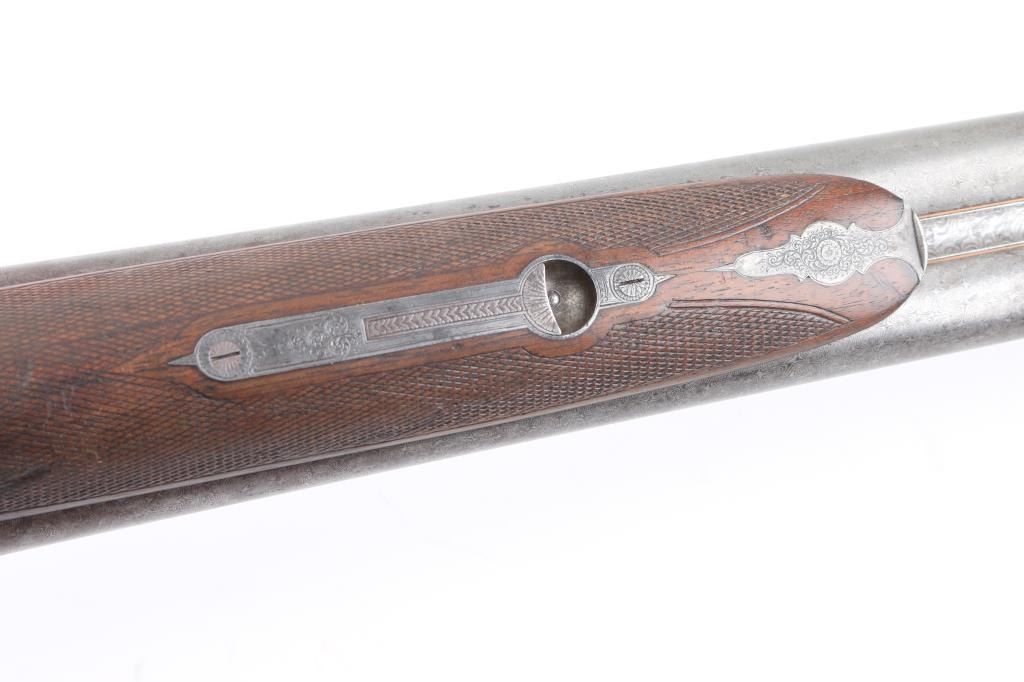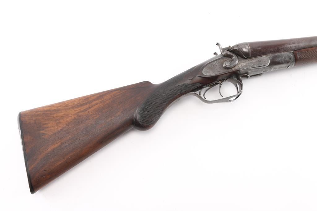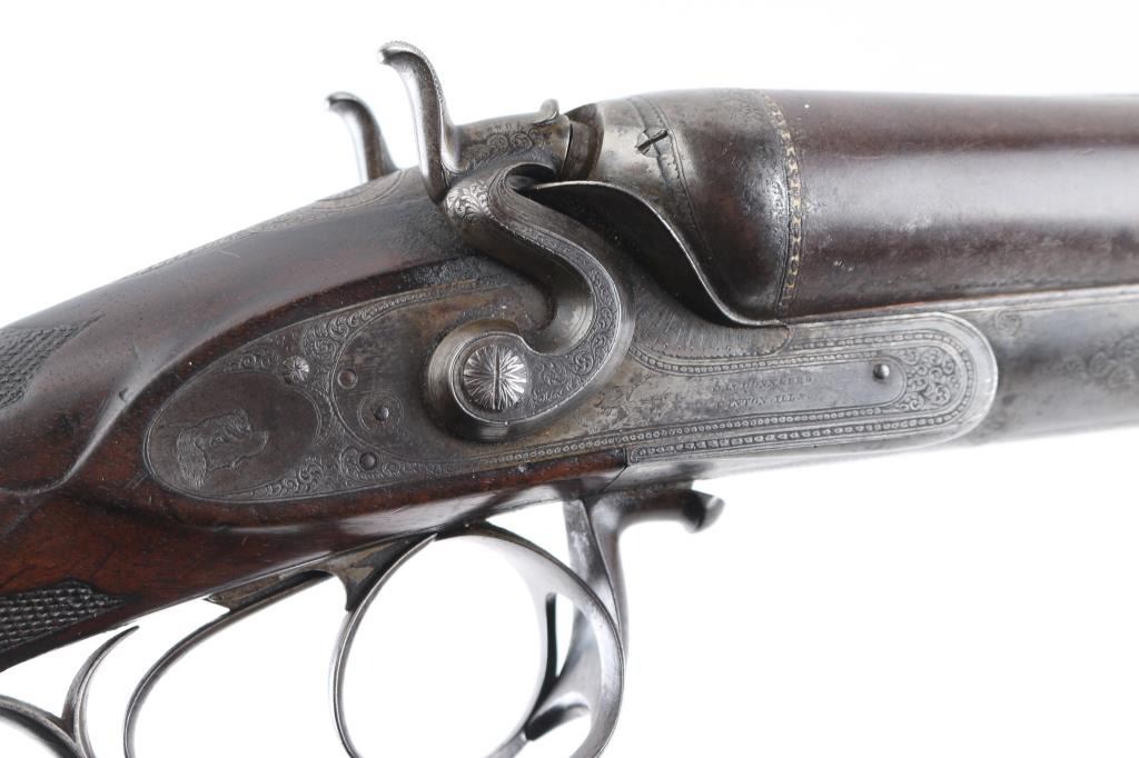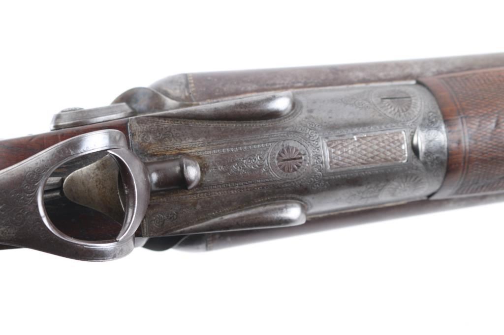 James Donn & Bros., Canton, Illinois, (1859-1886) High quality Side-by-Side exposed hammer Shotgun, 10 ga., 34'' Damascus barrels with 1/2'' concave rib, maker marked, front silver bead, open chokes and extractor; case colored receiver has double triggers and fancy scroll engraving; locks engraved with pointer, and pheasant "Jas. Donnn & Bro Canton,Ills.", serpentine hammers with tall spurs in the style of Purdey. Checkered walnut stock and forend, Prince of Wales grips and horn buttplate. break action is an under lever incorporated into the triggerguard. Both barrels are proofed under the forearm with crossed pistols under a crown (?)., he was known to import barrels. James Donn, who was born in Lake County, Illinois, in 1839, started his lifelong gun making career.. Mechanically the shotgun is excellent, wood is near excellent with sharp checkering, a few minor scratches/dings, engravings and markings are crisp/clear, barrels finish has turned a molted gray/brown patina, bores are good with scattered light pitting. Consignor purchased this gun from Gold & Silver Pawn shop in Las Vegas in 2016 for $2,811.90, paperwork included along with photos of the cast of the show "Pawn Stars". A rare shotgun. NRA Condition-Very Good as Antique Firearm.