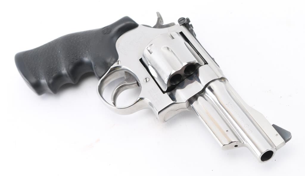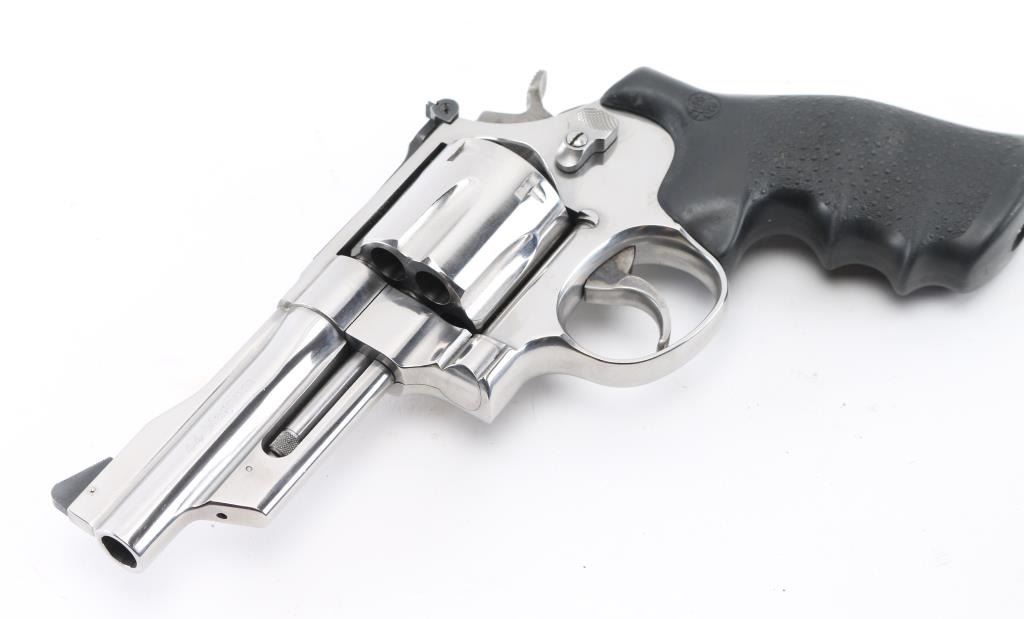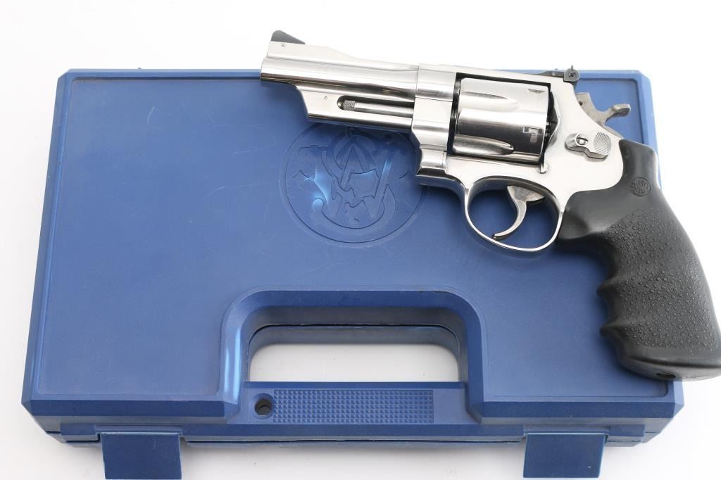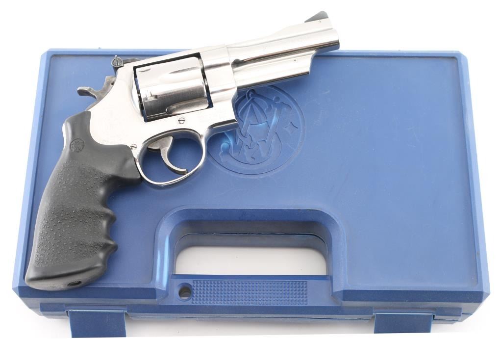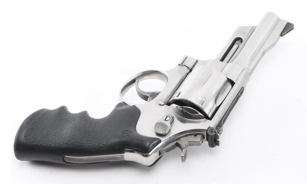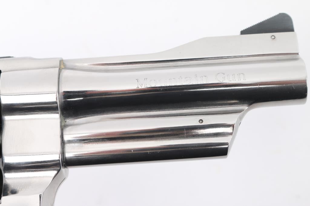 'Mountain Gun'. Pre Lock Large frame stainless steel double-action revolver chambered in .44 Magnum. Features 4" tapered barrel with serrated sighting rib, raised serrated ramp front sight, adjustable micrometer click rear sight, fluted six-shot cylinder, wide smooth trigger, checkered spur target hammer, hammer mounted firing pin, three screw N frame, one-piece pebbled black rubber wrap-around finger groove grip. Revolver exhibits only minor handling marks and a faint drag line on the cylinder with no major wear observed, some edge losses to black finish on sights. Painted or etched barrel markings barely visible, polished away. Action is smooth with tight lock-up, the bore is pristine and the rubber grip is near fine. Includes factory blue plastic box with manual. Condition is NRA Excellent *** Modern Firearm ***