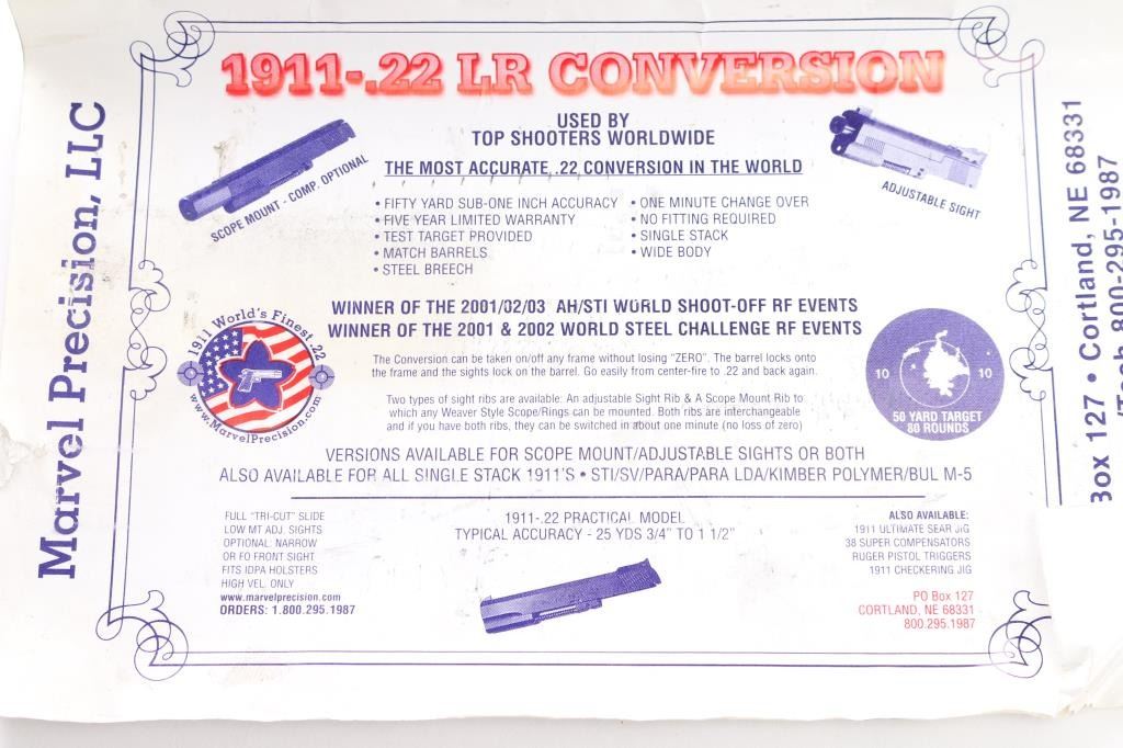 The "Wilson Combat" .22 Cal. conversation kit for the 1911 45 ACP pistol. Manufactured by Marvel Precision. Complete slide assembly with Millet adjustable rear sight, Marvel slide stop and two .22 Cal. blue steel magazines. Also included a 3 polymer .22 magazines, 3 Marvel recoil springs. Comes in a Wilson Combat zippered case with paperwork.