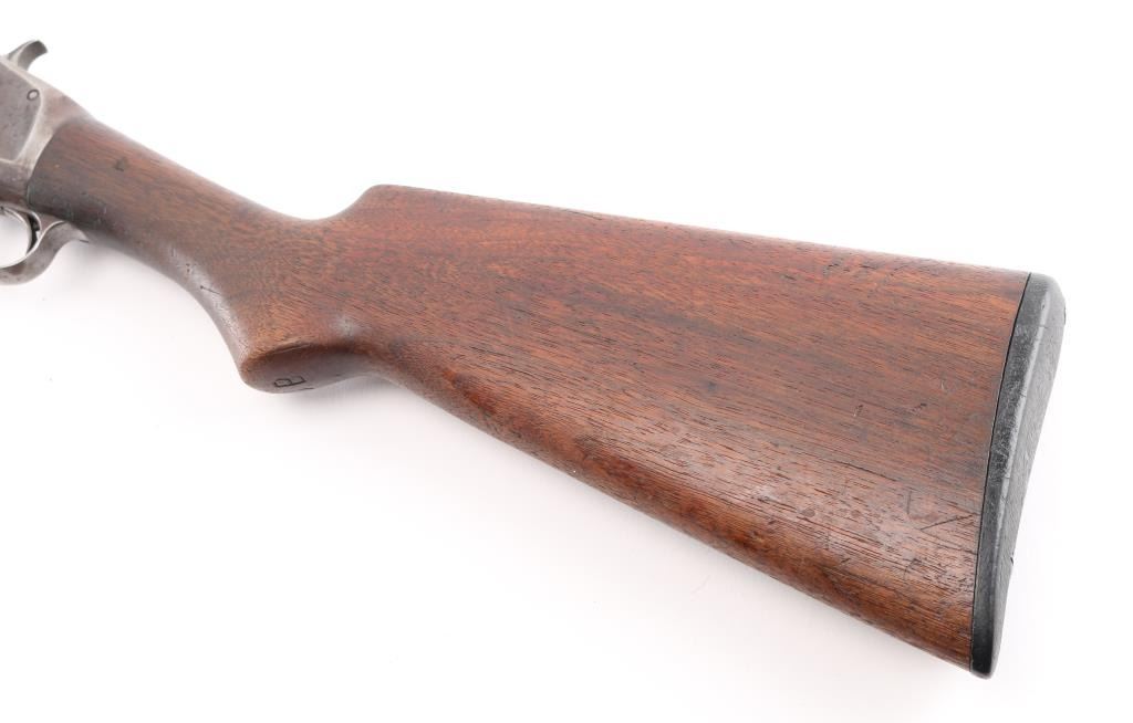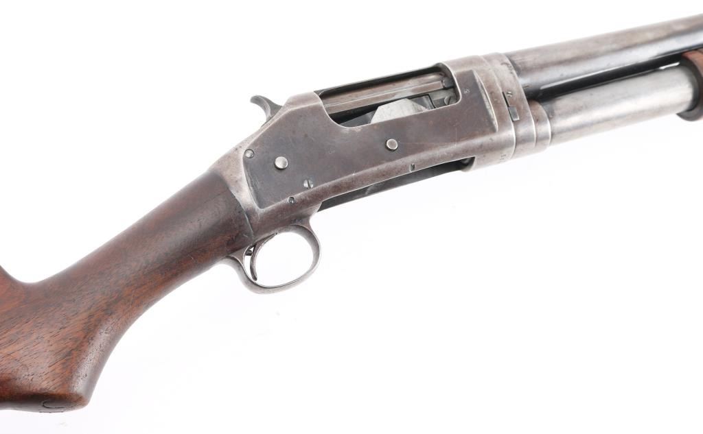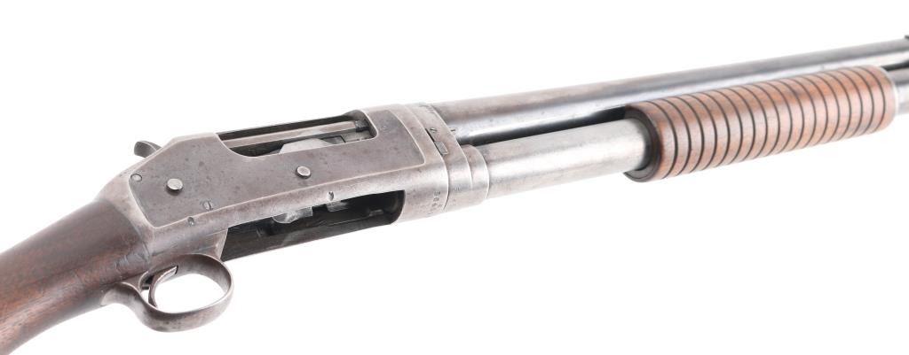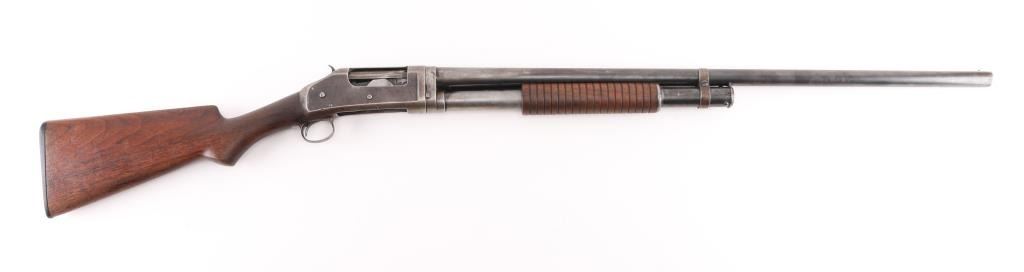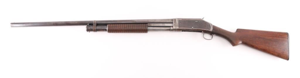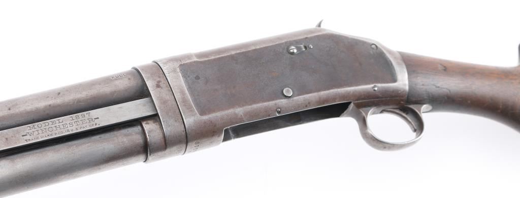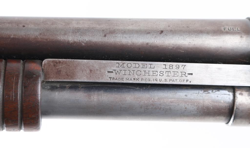 American made shotgun, designed by John Moses Browning, manufactured in 1914, pump action, approximately 30" barrel, integral full choke, bore is scratched, bead front sight, groove rear sight in receiver, external hammer, smooth trigger, wood stocks, approximately 85-90% finish remaining, patina developing on bare metal, dings on top of the barrel, some pitting on stocks, action is crisp, The 1897 was identical to its 1893 forerunner, except that the receiver was thicker and allowed for use of smokeless powder shells. The serial numbers match on the barrel and receiver. **NRA Excellent** Modern Firearm C&R Eligible