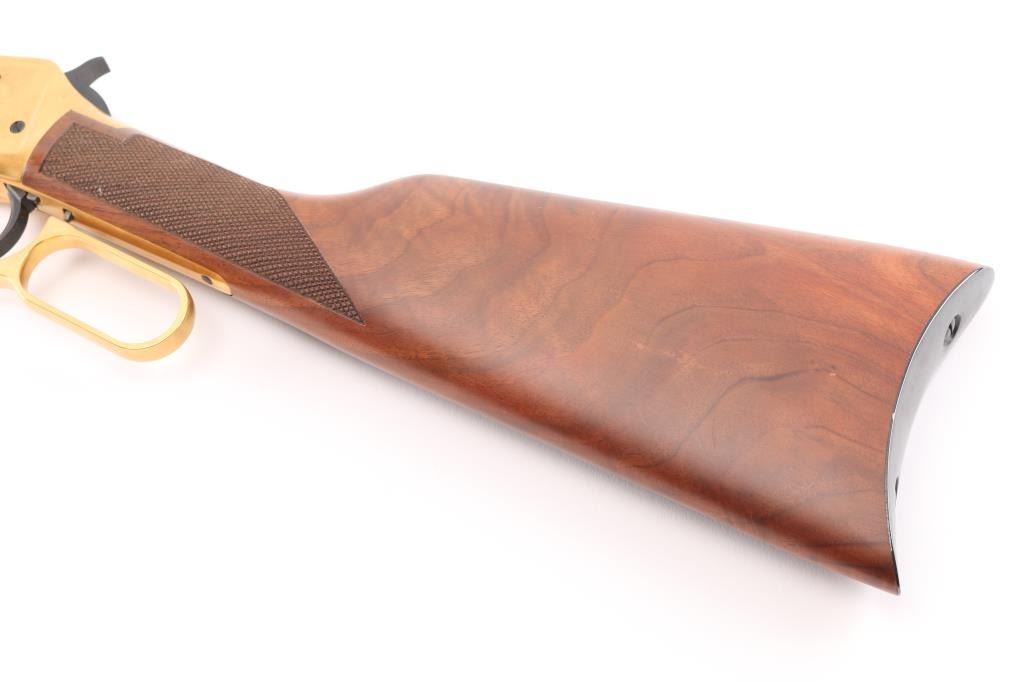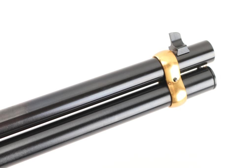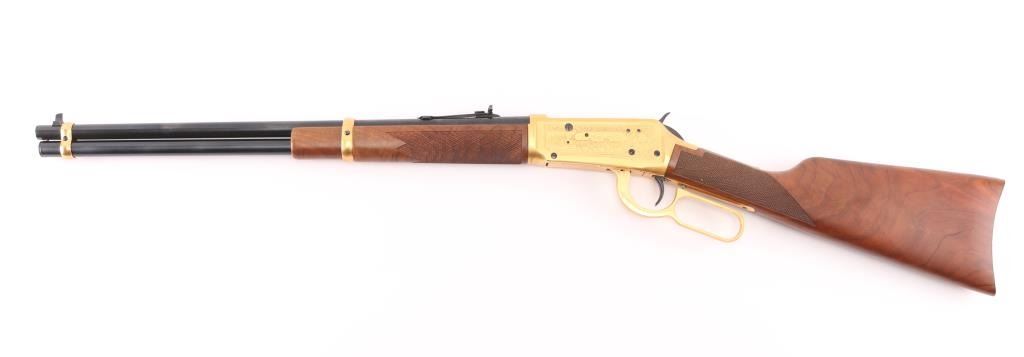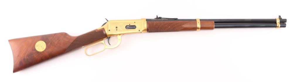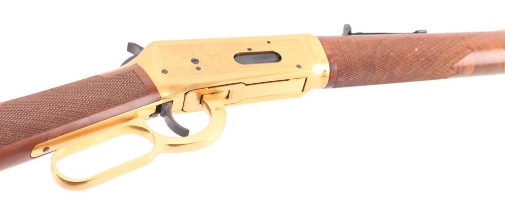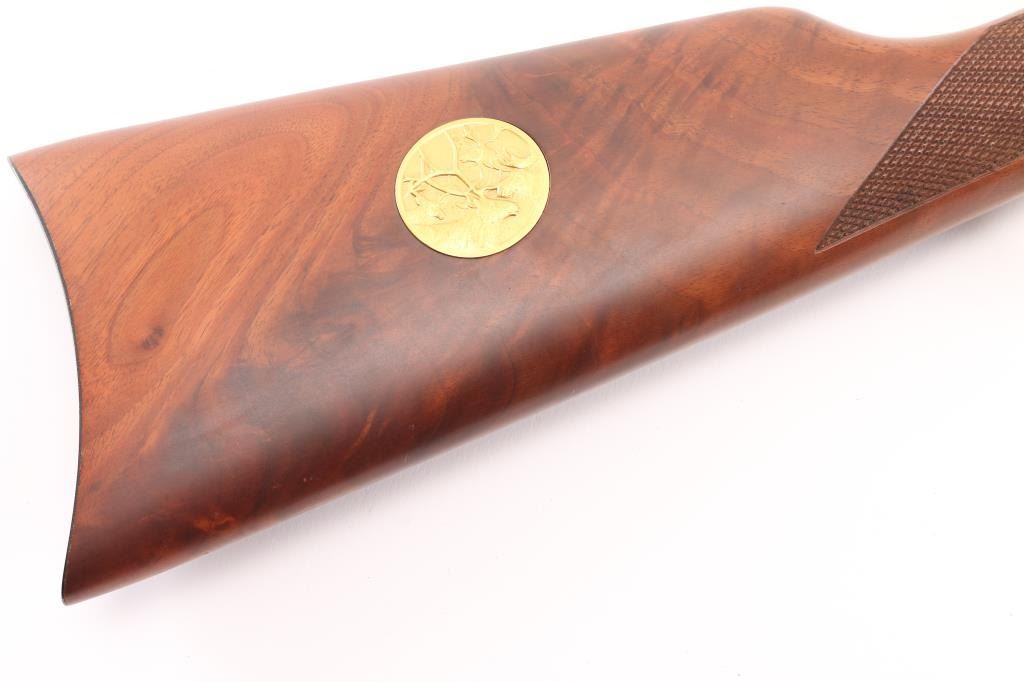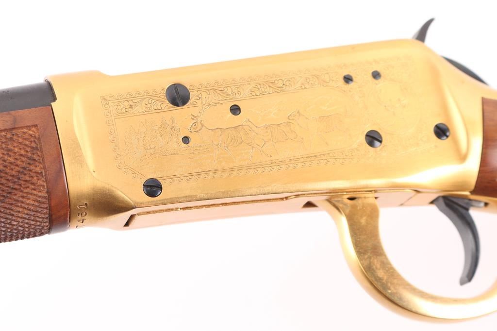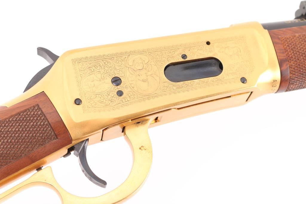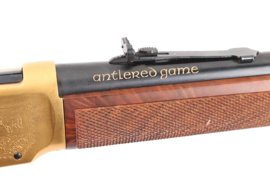 Lever action rifle chambered for 30-30 Winchester, commemorating four types of antlered game favored in North American hunting: Deer, Elk, Moose, and Caribou. Features a 20 inch round barrel with adjustable sights. Most steel parts are blued, with the receiver, lever, link and bands finished in a bright gold color. The two piece stock is highly figured walnut, oil rubbed type finish, checkered at forend and wrist, with curved steel buttplate. Barrel is engraved on right "antlered game" with gold color inlay. Receiver has fine detail engraving on both sides featuring scrollwork borders surrounding multiple smaller inset scenes of the four antlered game species in natural environments. Right side of butt has an inlaid coin type medallion, with similar gold coloration, featuring portraits of the four featured animals. Bore is excellent. Retains 99% original finish on metal surfaces, with a small rub on left barrel under the sight. Manufacture 1978. Condition is NRA Excellent. C&R Firearm.