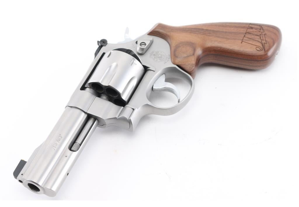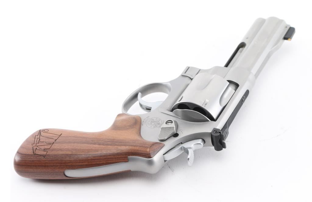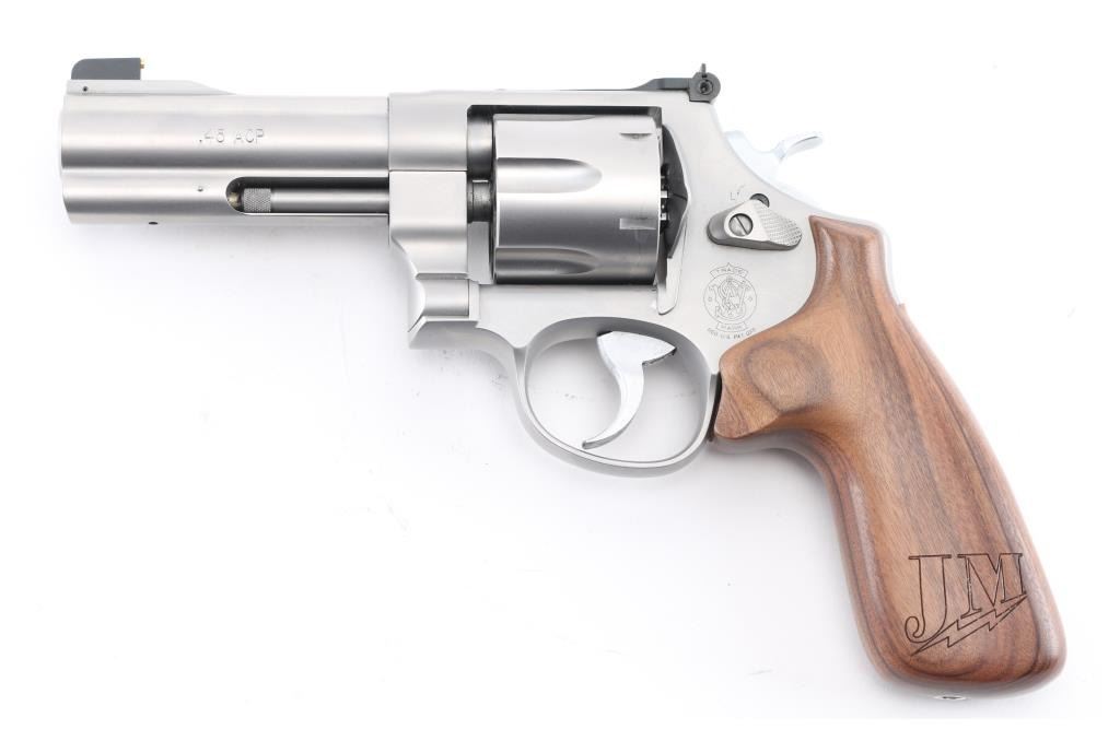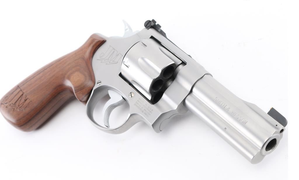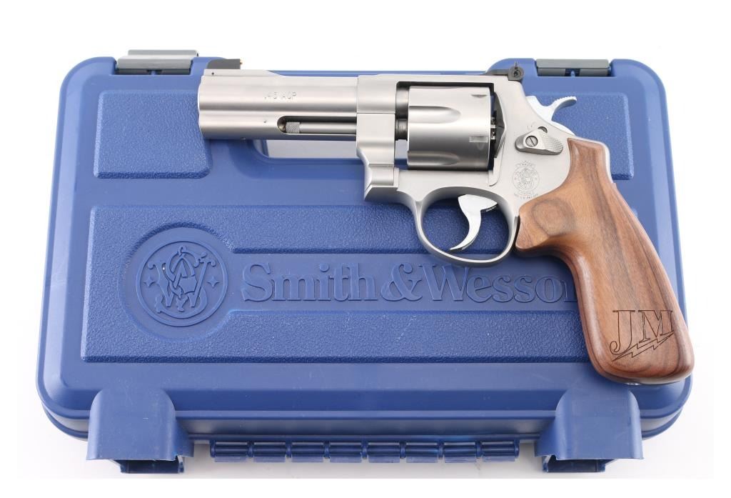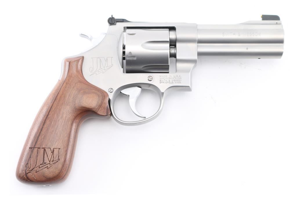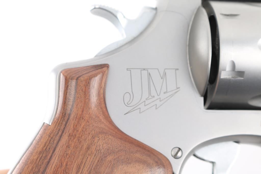 American made N-frame revolver, marked "JM", DA/SA, six shots, stainless steel frame and cylinder, full-length underlug, the ejector star is equipped with a moon clip, the sideplate and both grips are engraved "JM" with a lightning bolt under the initials, approximately 4" barrel, bore is bright, cylinders are dull but may improve with cleaning, there is soot on the front of the cylinder, front gold bead black patridge sight, adjustable open notch rear sight, checkered hammer spur, serrated trigger, smooth wood grip with engraving at the bottom of each side. This revolver is equipped with a hammer lock and comes with two keys. A Performance Center version, the S&W Model 625 JM, was introduced in 2005. The "JM" stands for Jerry Miculek, a renowned revolver speed shooter, and is his personal design. Includes the original plastic case, instruction manual, two extra moon clips and a cable lock with two keys. **NRA Excellent** Modern Firearm