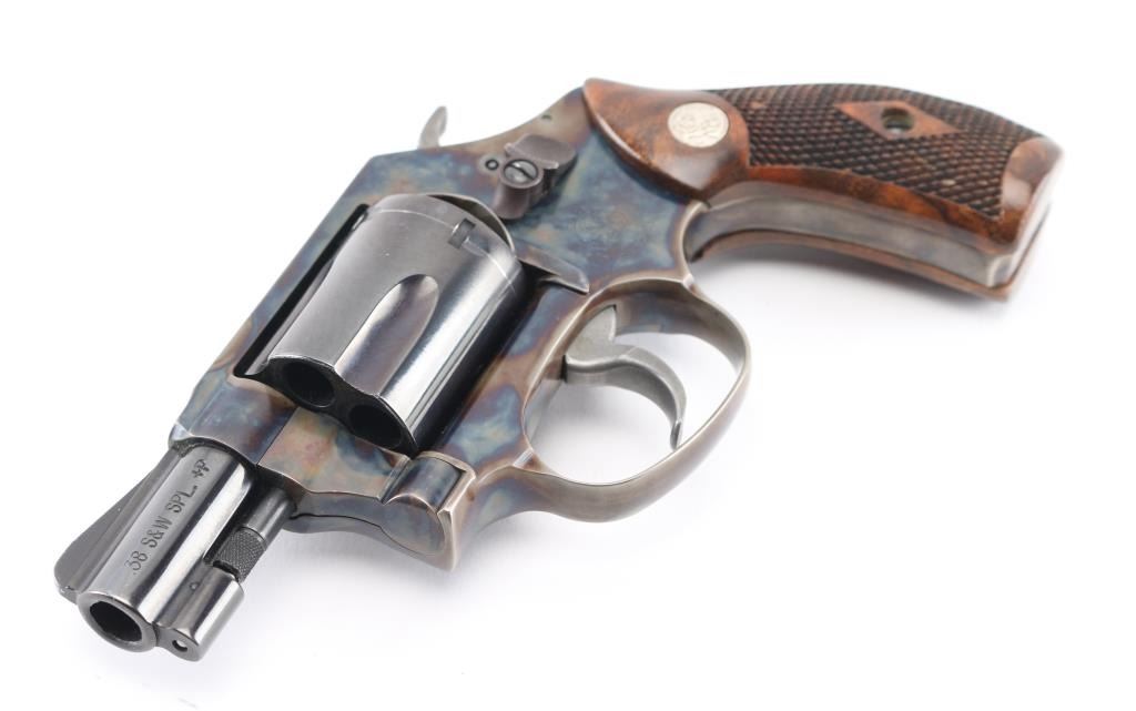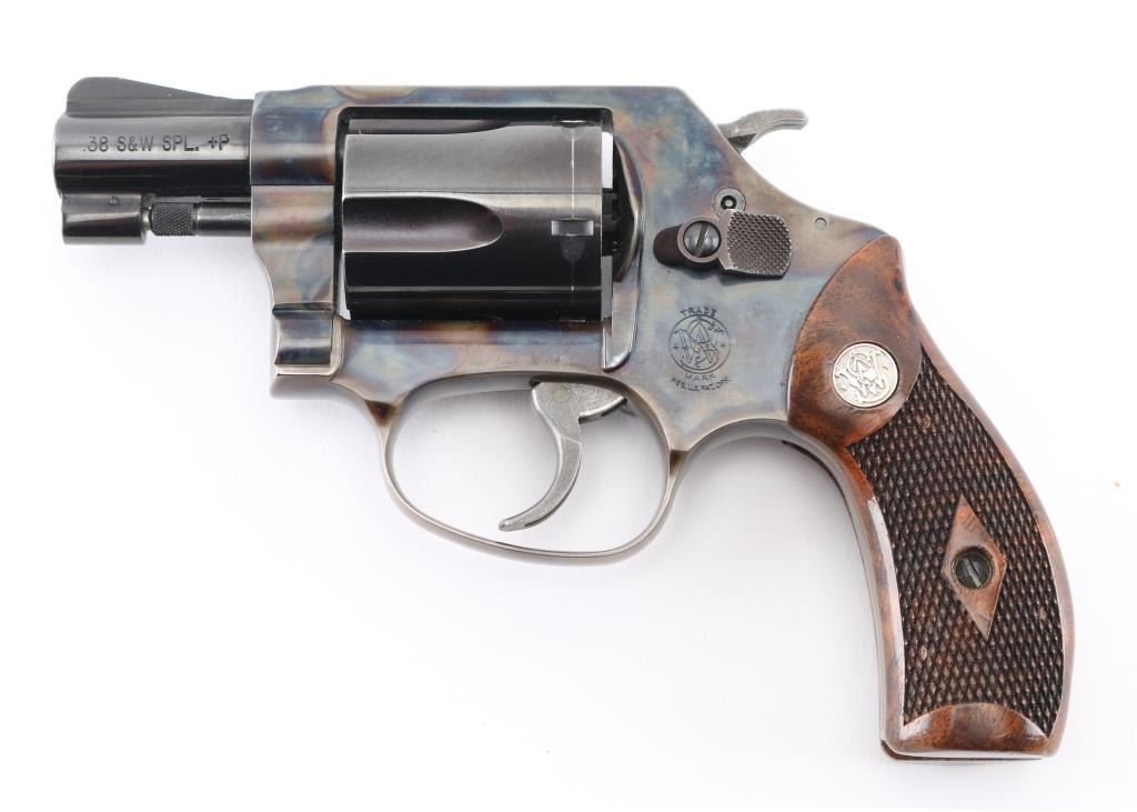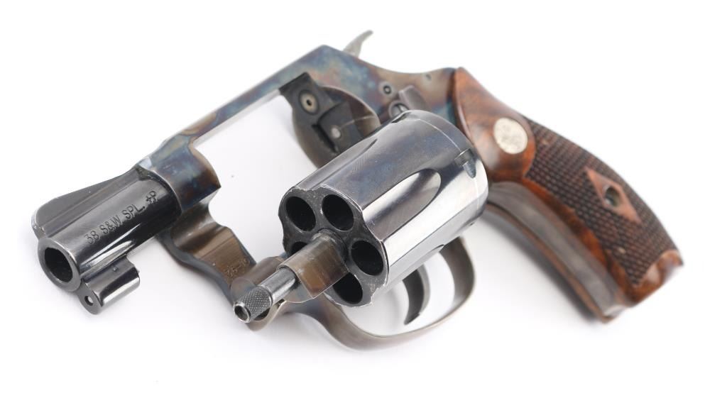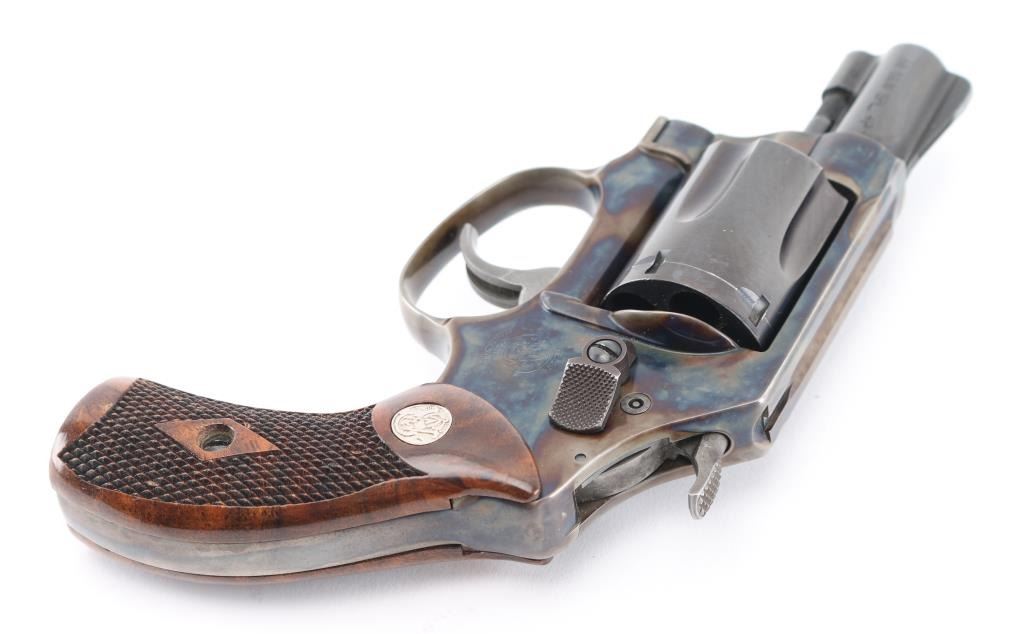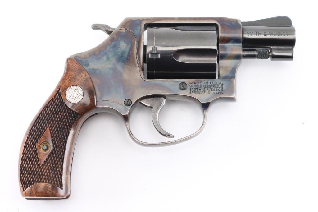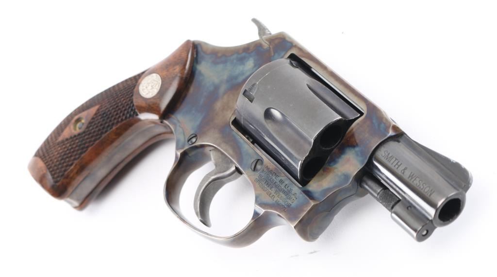 Classic, product number 15085 limited edition five shot revolver rated for .38special +P ammunition. It has a 2" barrel, fluted cylinder, ramp front sight with white paint, notch rear, smooth trigger, knurled hammer spur, and diamond checkered wood grips with S&W medallions. Barrel and cylinder are blued, frame is color case hardened. Revolver retains approx 98% of its original finish showing minor edge wear thin drag line on the cylinder, and a few scuffs on the frame. Action is sound with good lock up, the bore is excellent and the wood grips are excellent. Condition is Excellent Modern Firearms