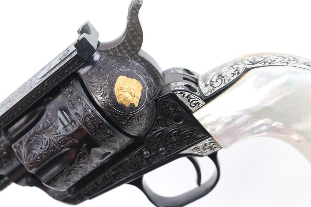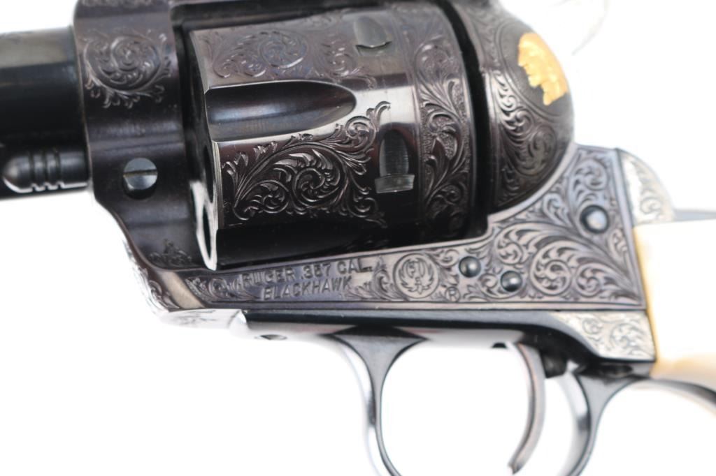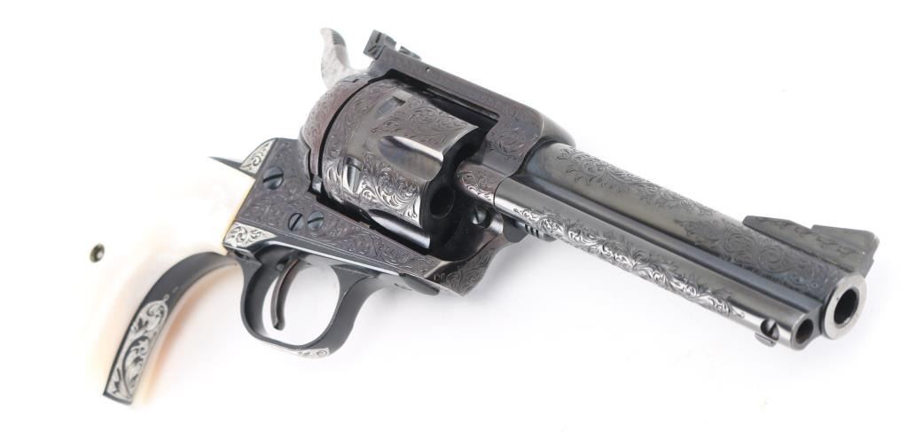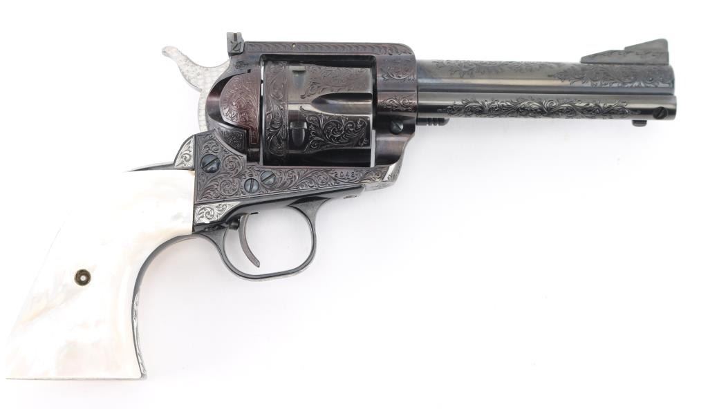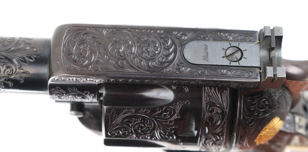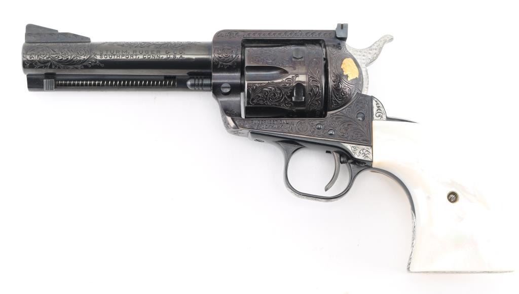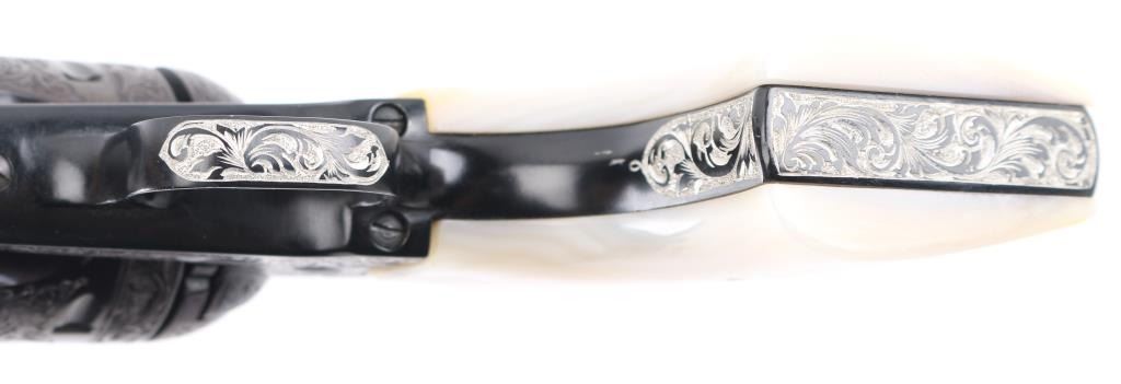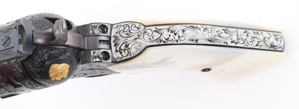 Old Model Flattop American made six shot revolver chambered for .357 ammunition. It has a 4.75" barrel, Manufactured 1956 2nd year production, blued refinish,fluted cylinder, raised front sight, adjustable rear sight, smooth trigger, jeweled hammer with serrated spur, and mother of pearl grips . This gun has been finely and fully engraved with floral scroll, and an embossed gold indian head on the recoil sheild. Revolver retains nearly all of its reblud finish showing very little wear. The loading gate has turned to plum and the grip strap engraving has been left in the white. Action is sound with very good lock up and bore is excellent and the mother of pearl grips are fine with a small lost to the top right panel, Condition is NRA Excellent as refinished *Modern Firearm*